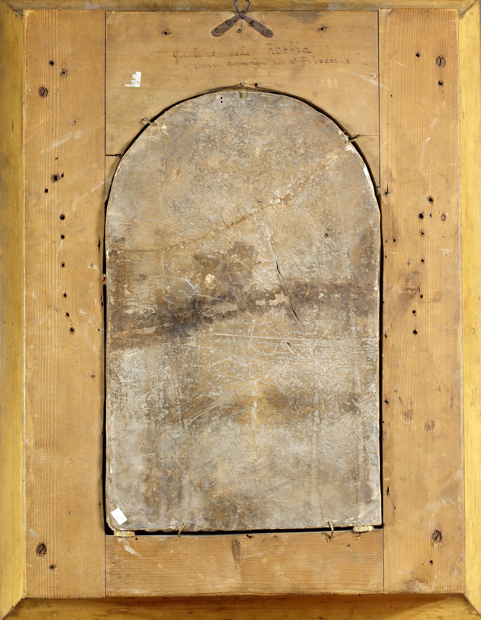 Glazed terracotta group in the style of Girolamo della Robbia. Depicting Madonna and child. With frame: 68 by 53 cm. Ceramic: 45 by 28 cm.