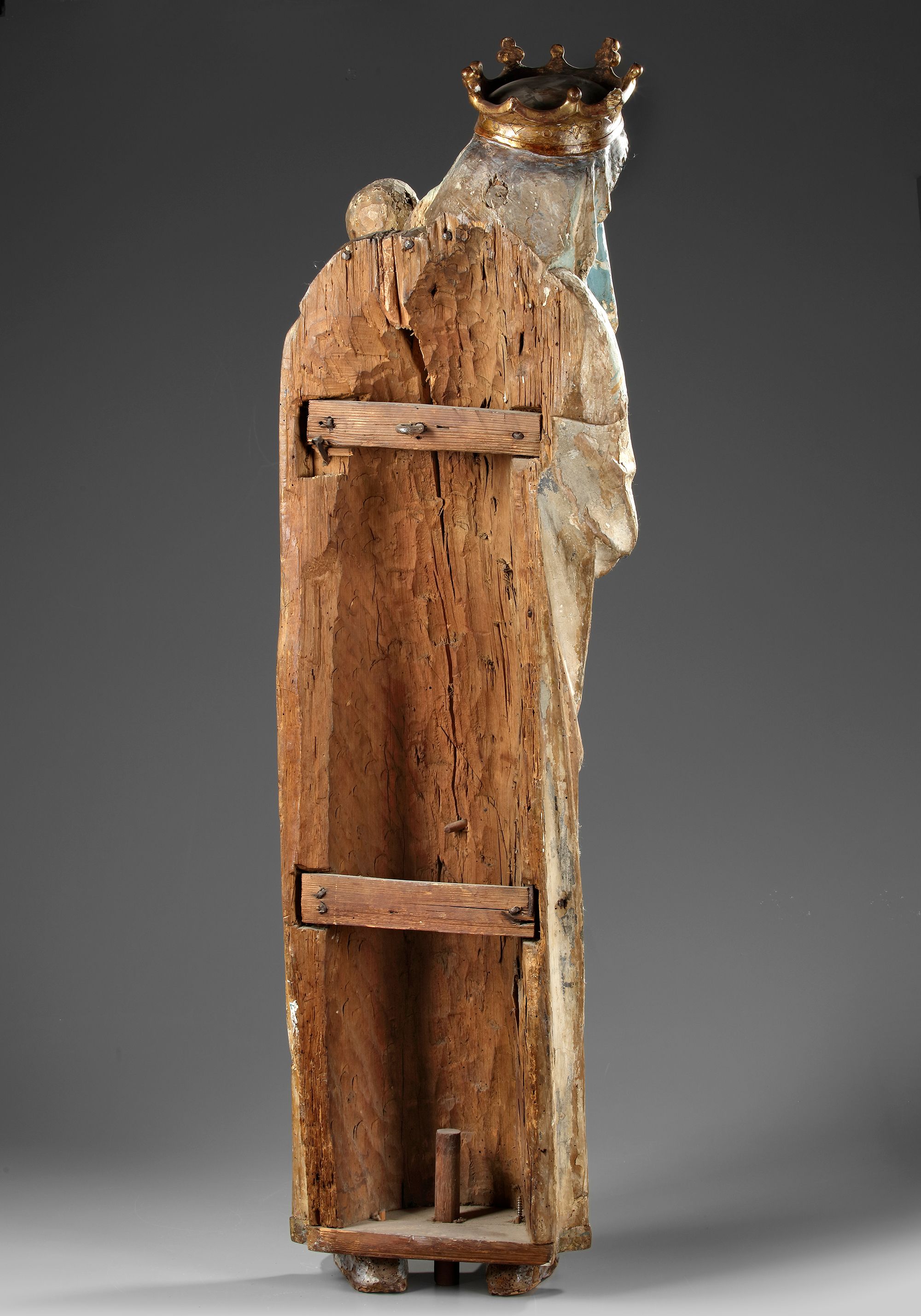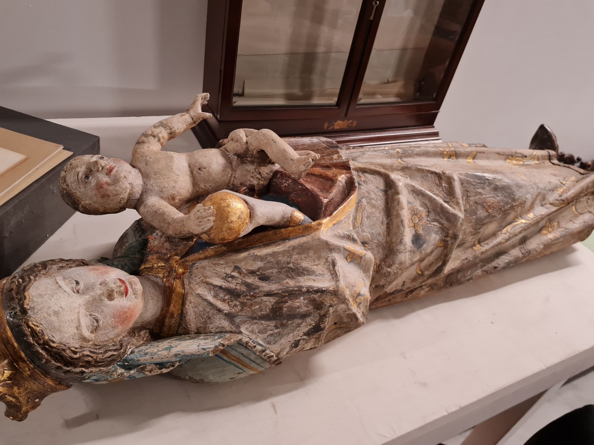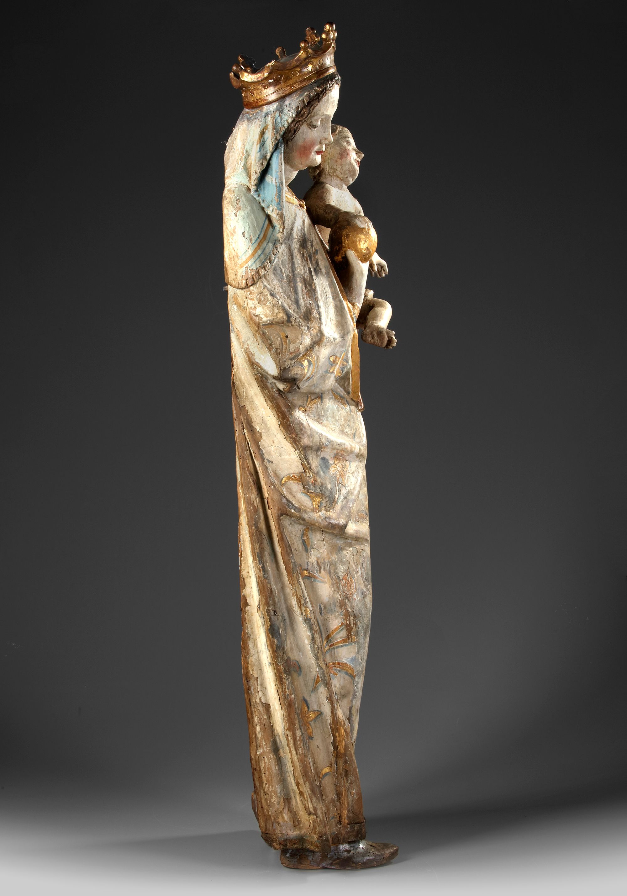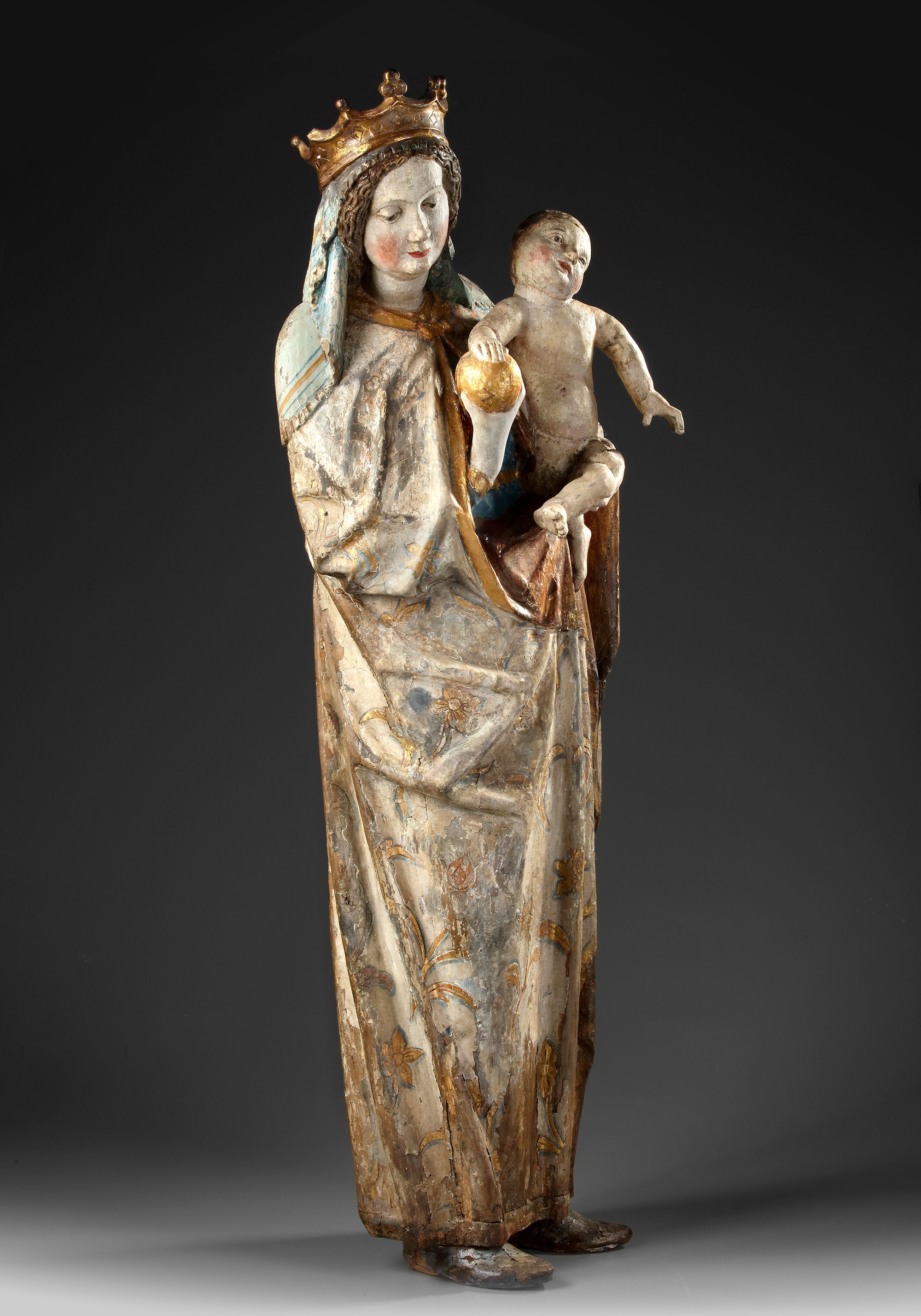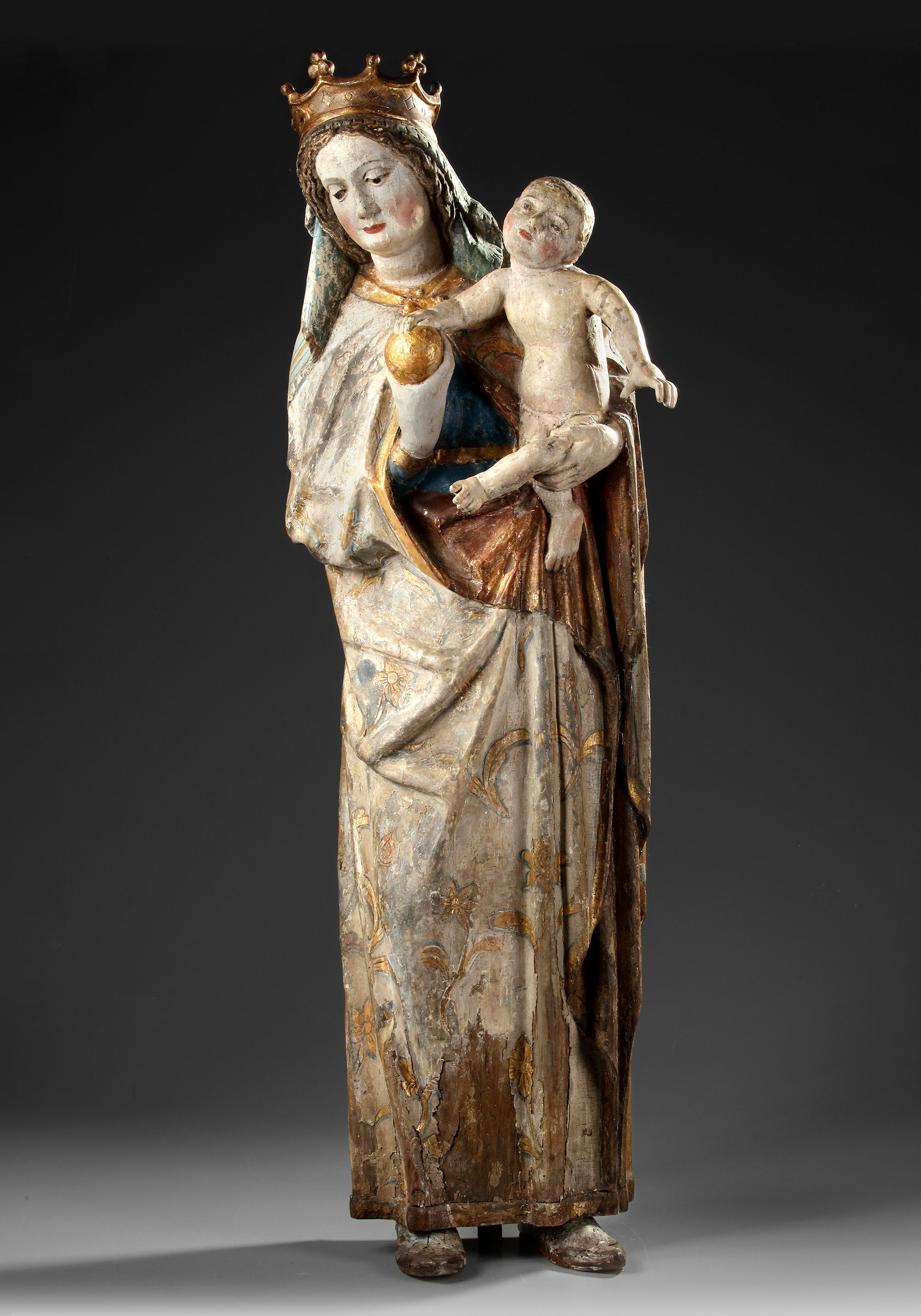 A very attractive sculpture of Madonna and Child. Remains of later polychrome.