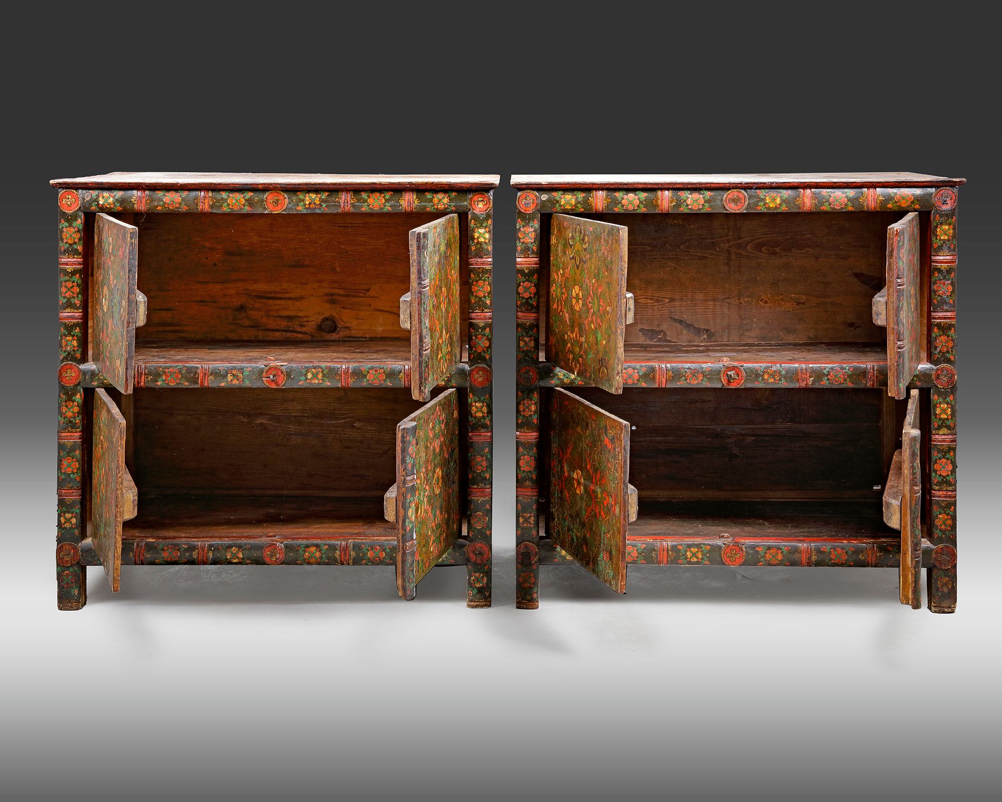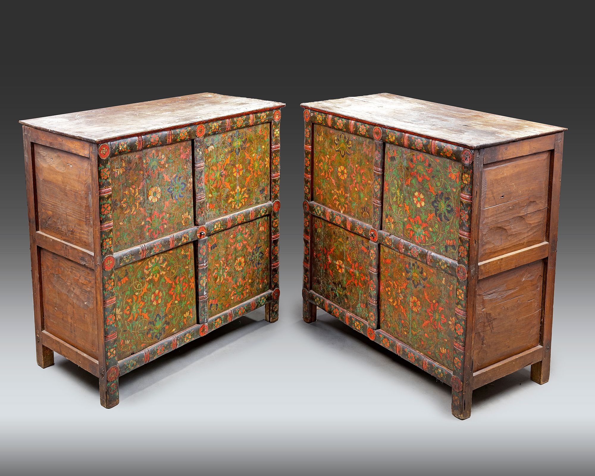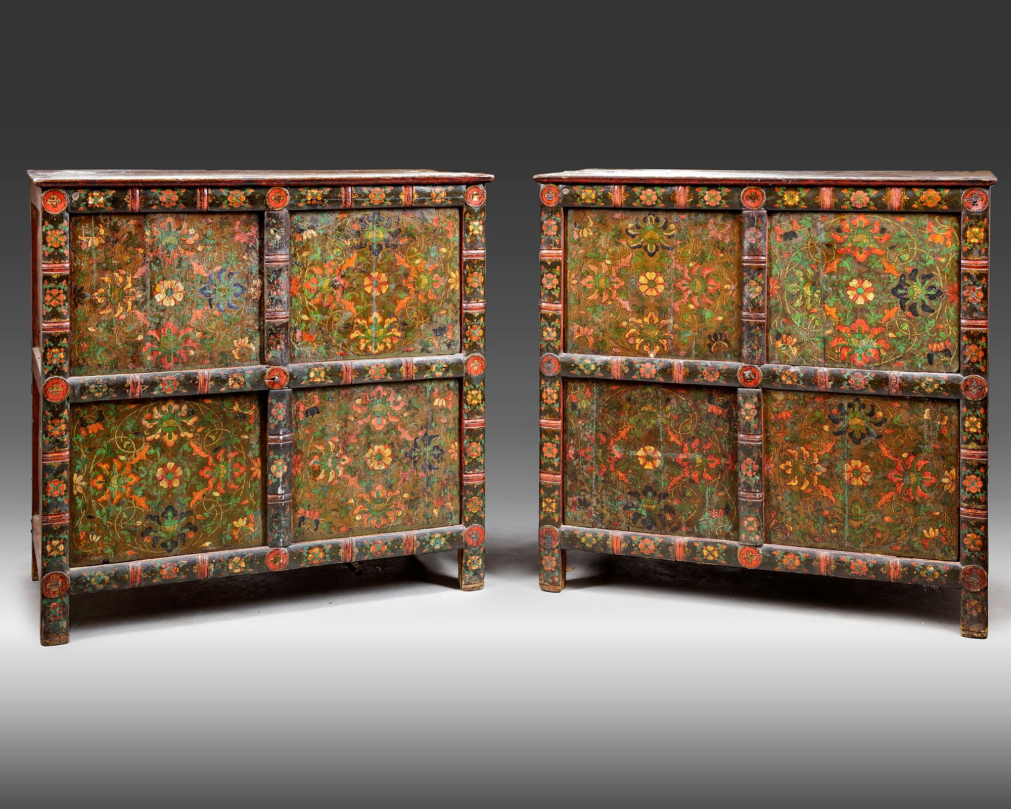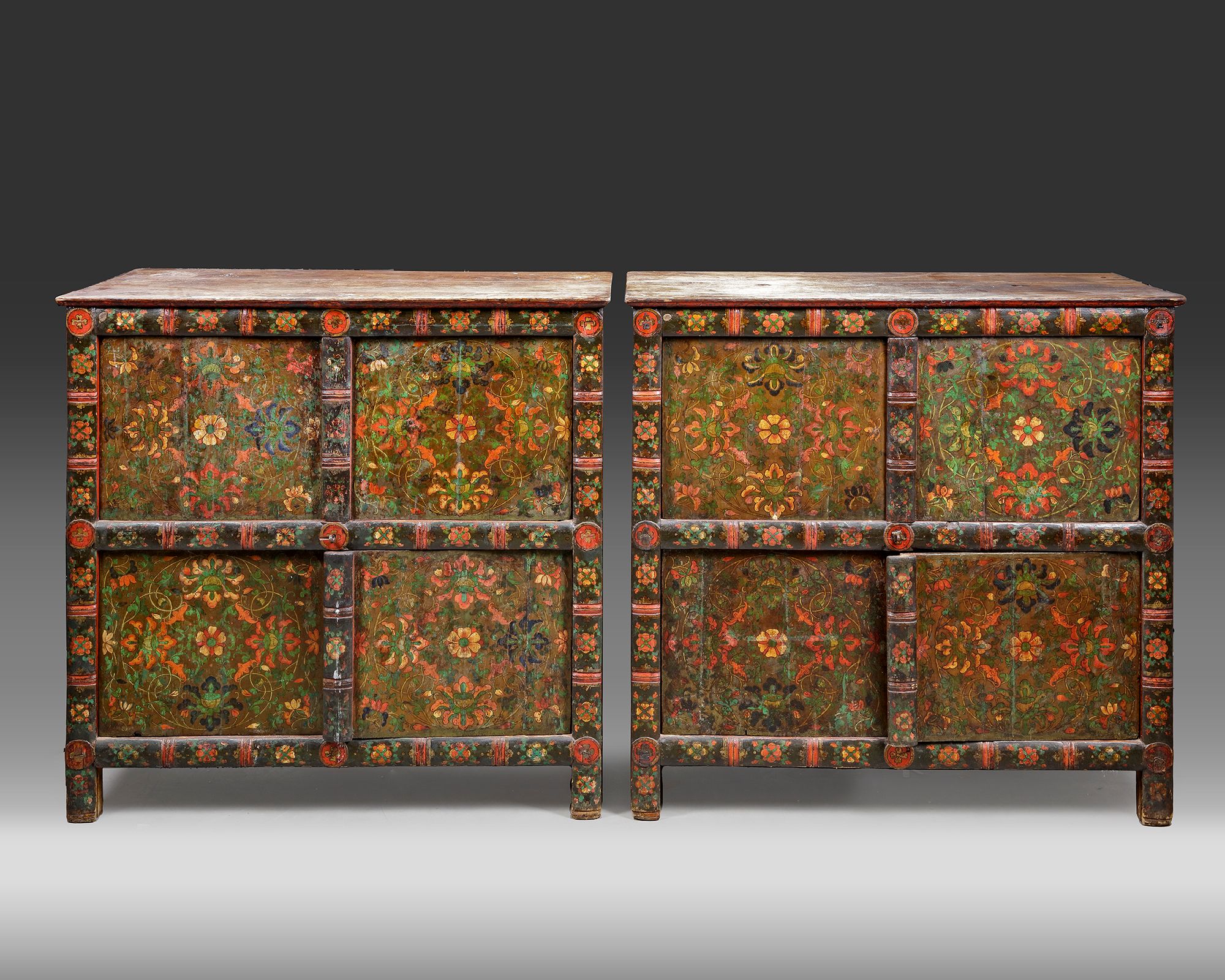 A pair of Tibetan cabinets, with painted cartouches and two pairs of double doors, raised on straight feet. The cabinet features a painted façade made of two pairs of double doors adorned with colorful cartouches surrounding a floral décor.