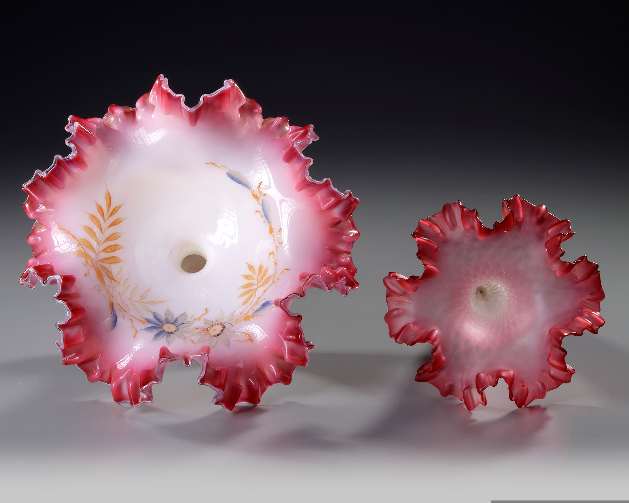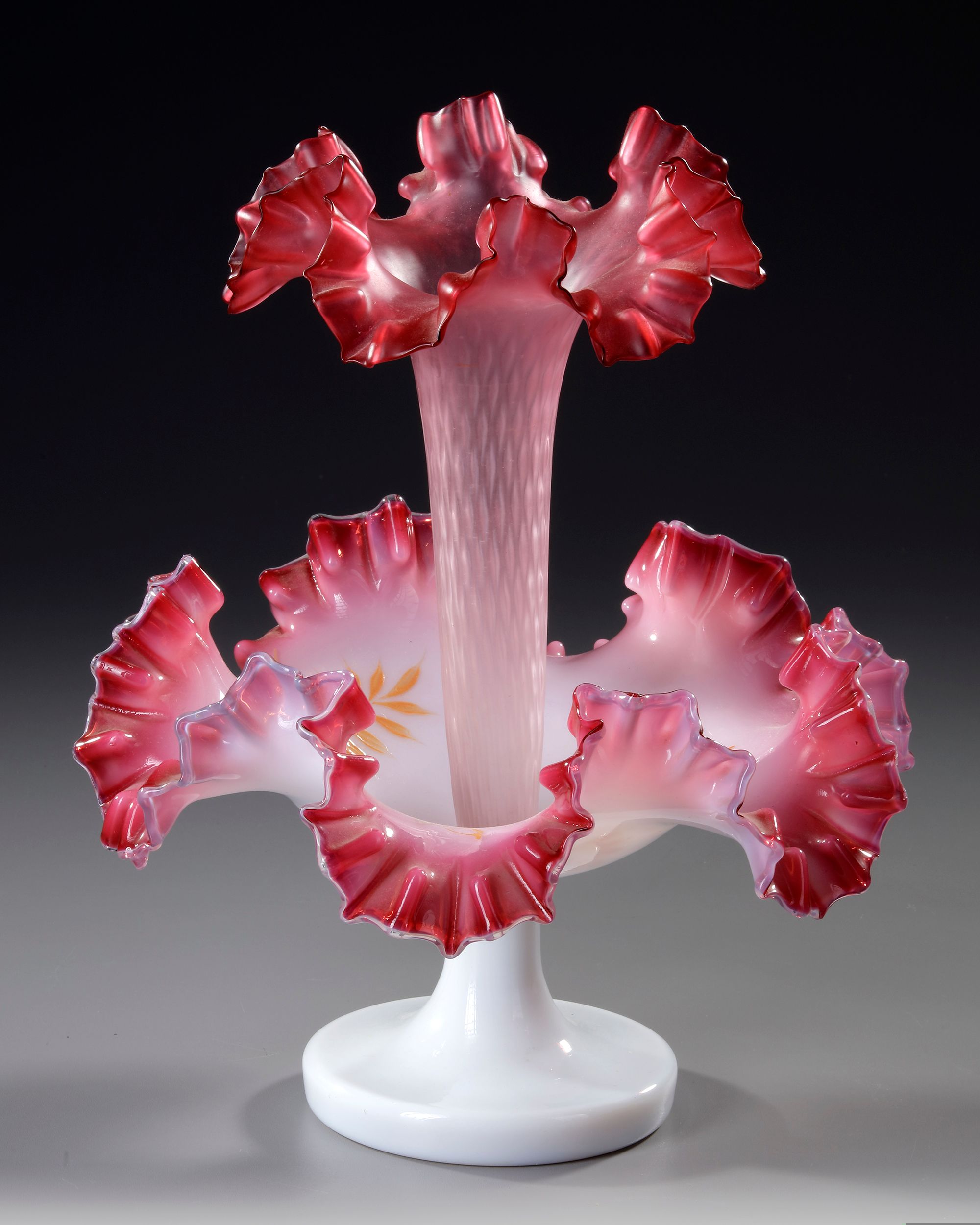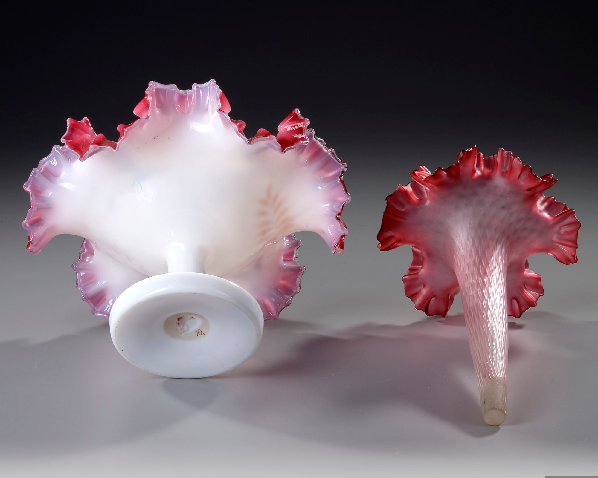 The bowl from opaline glass, the flute is made from ruby glass. Height: 30 cm. Diam: 22 cm.