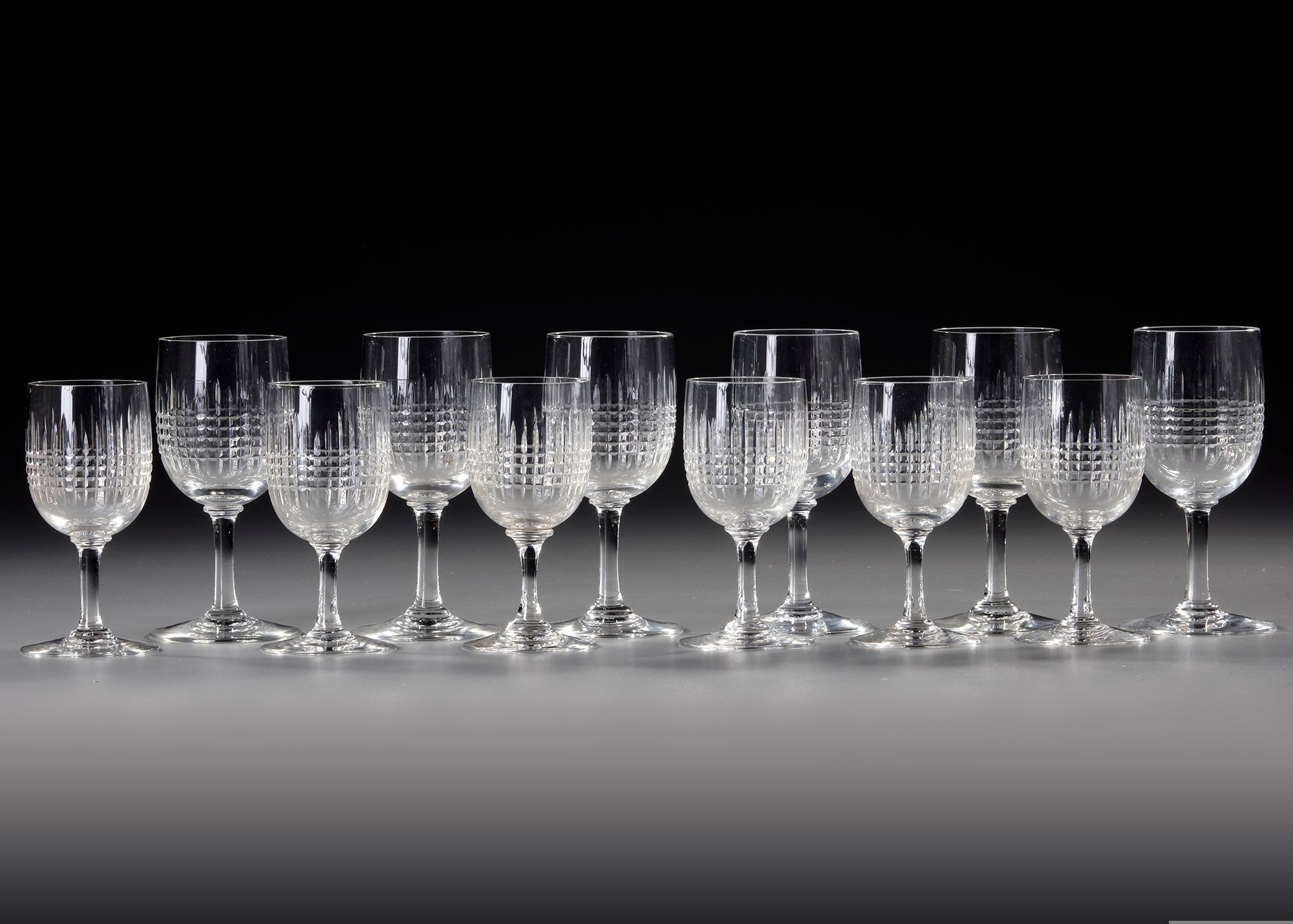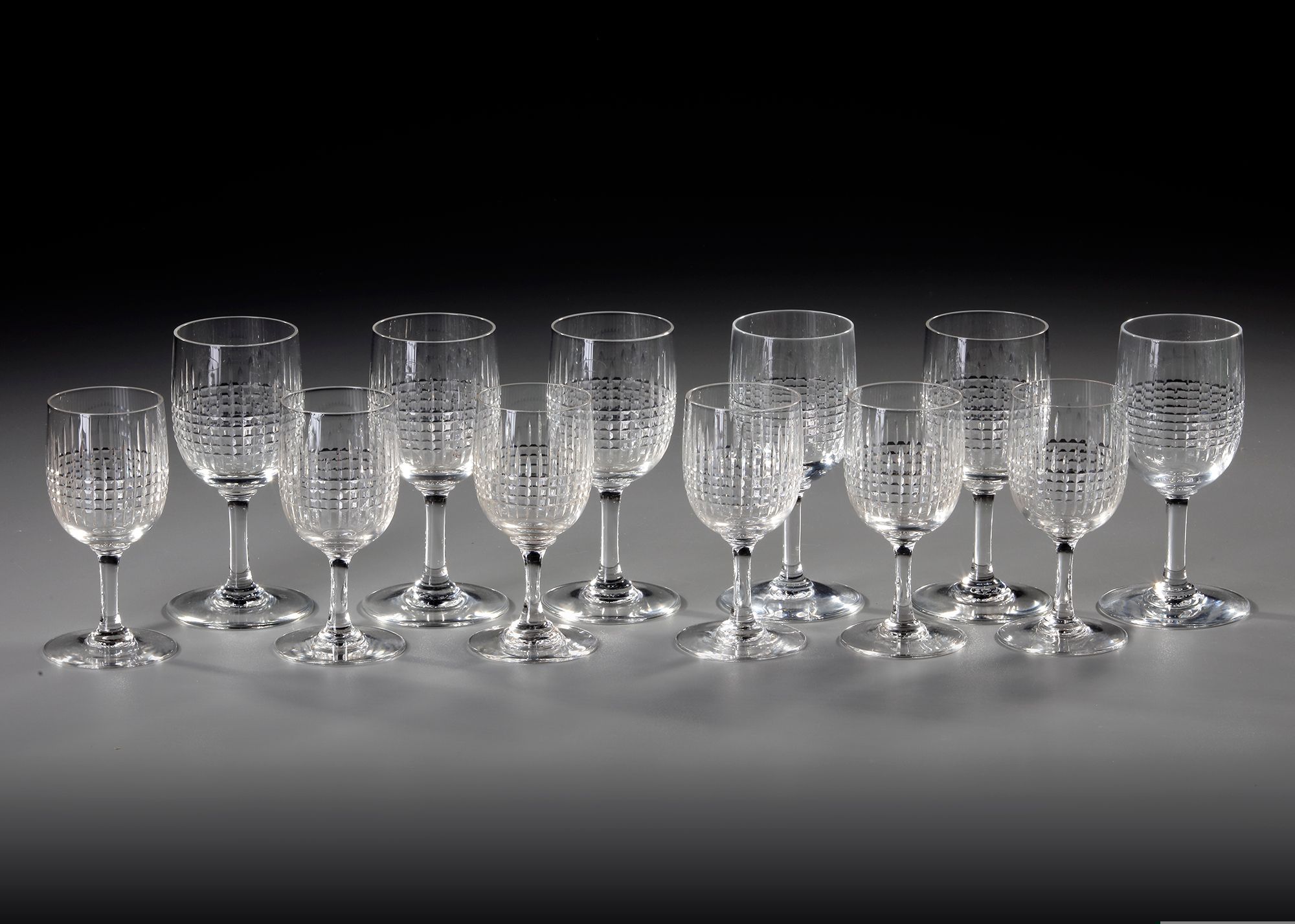 6 smaller and 6 larger glasses. Hand carved. Height small: 10.5 cm. Height large: 12.5 cm. Diam. large: 5.5 cm. Diam. small: 4.5 cm.