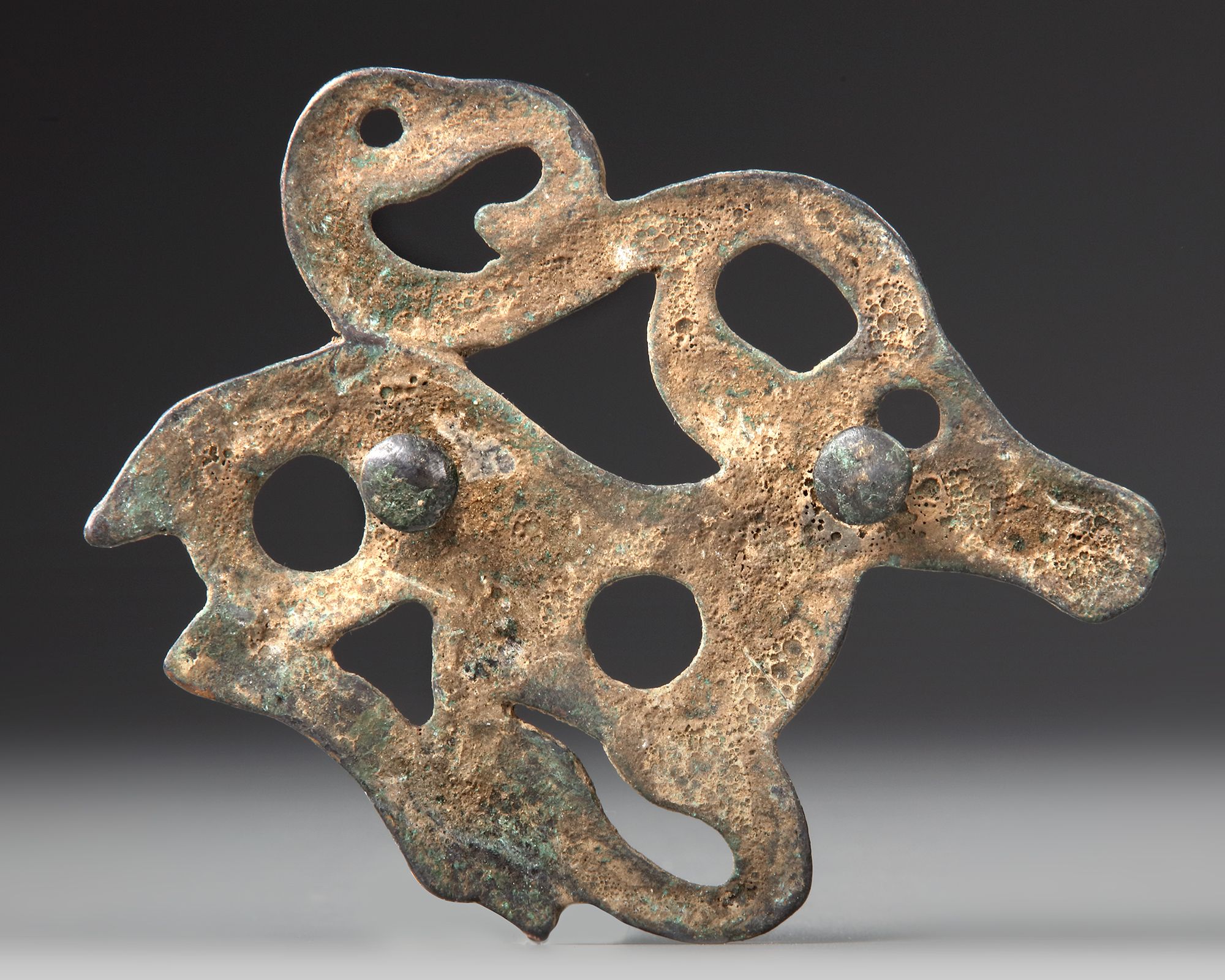 A large and impressive bronze applique of an antelope reeling with its legs folded facing to the left. The horn of the animal terminates in an eagle head finial. At the back are two studs for insertion into a heavy leather or cloth strap or saddle.
