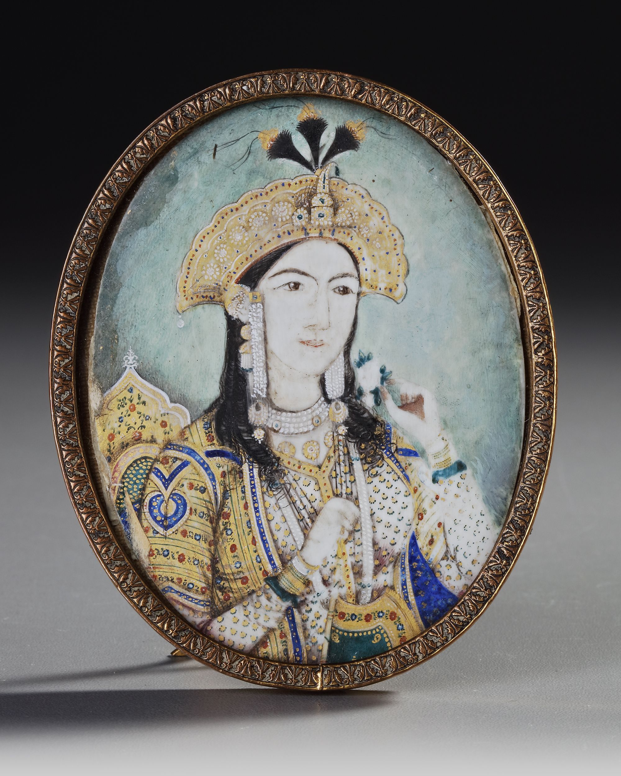 A miniature painting depicting the Mughal empress Nur Jahan. Framed and glazed 8 by 10 cm.