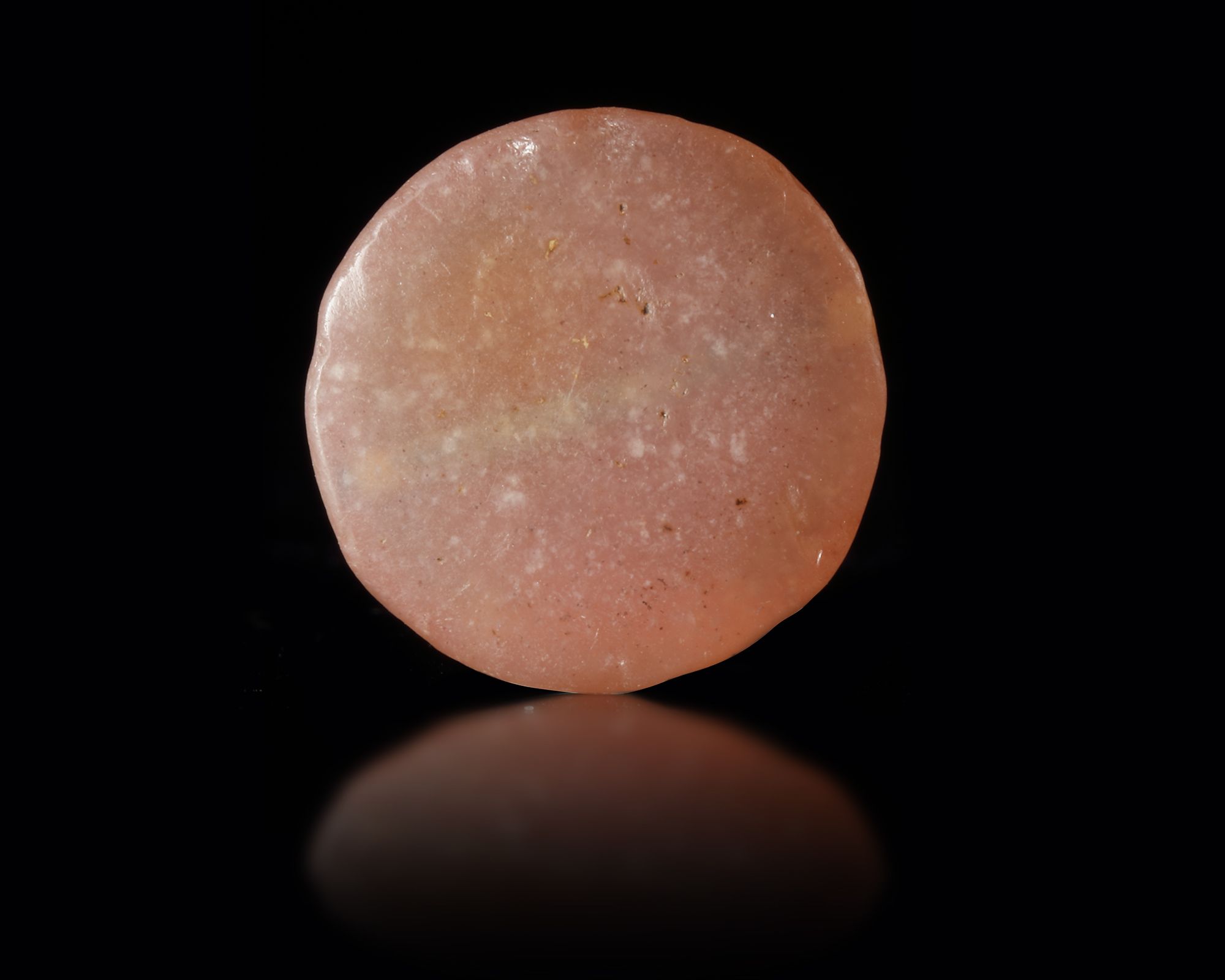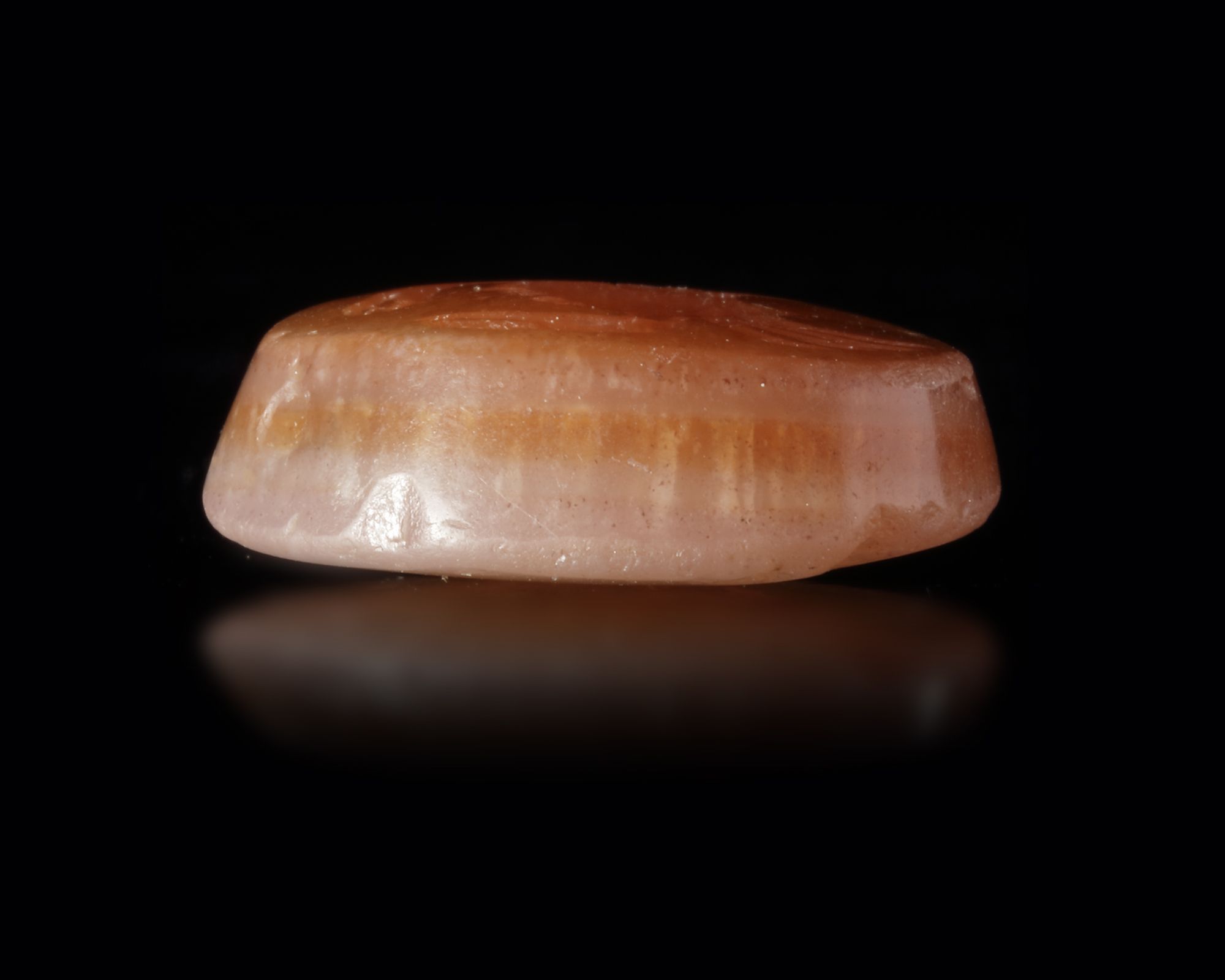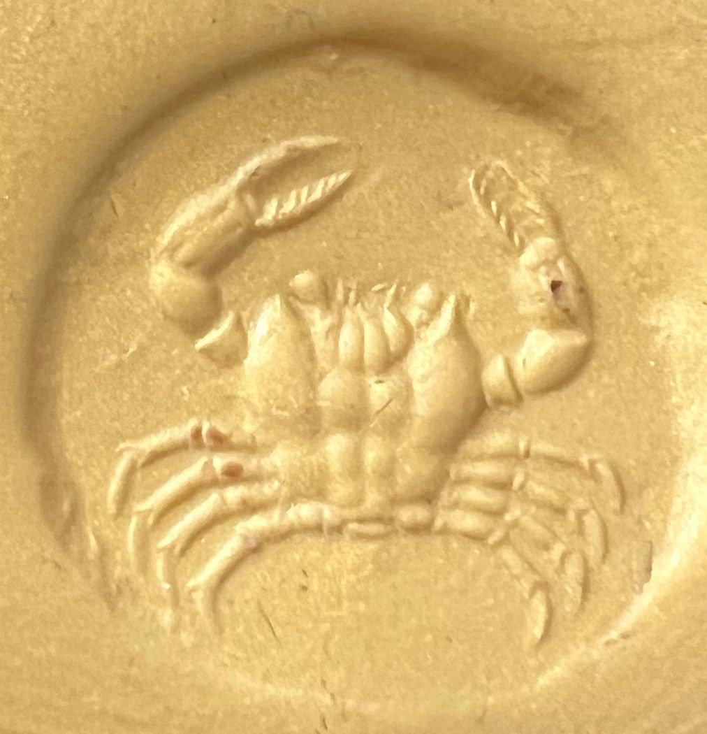A round orange carnelian bead shaped seal with an engraving of a crab. This seal might have been made from an earlier bead given the shape.
