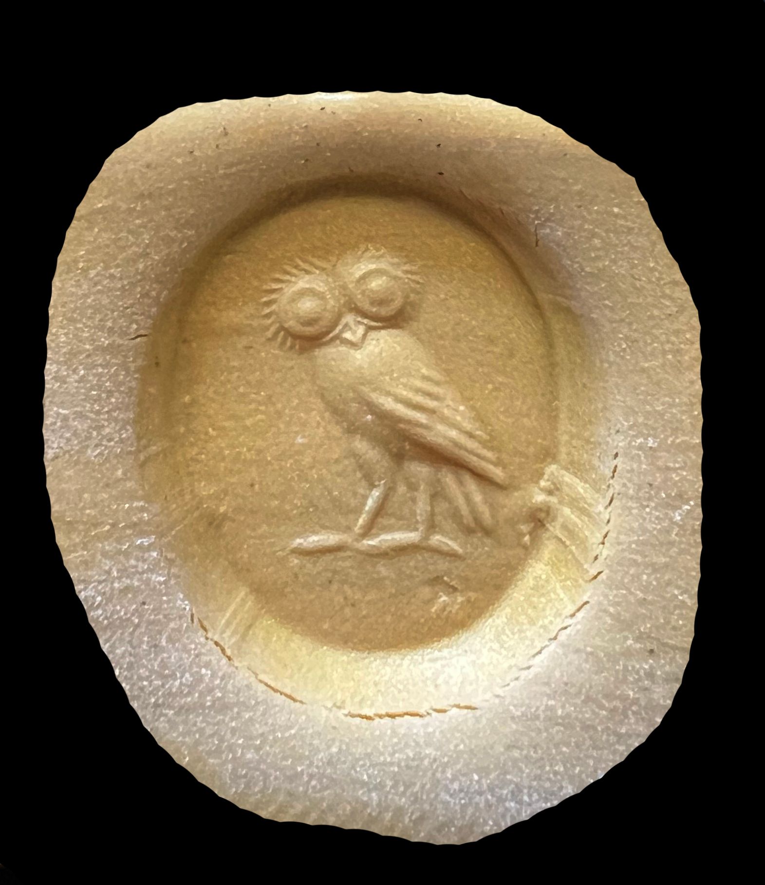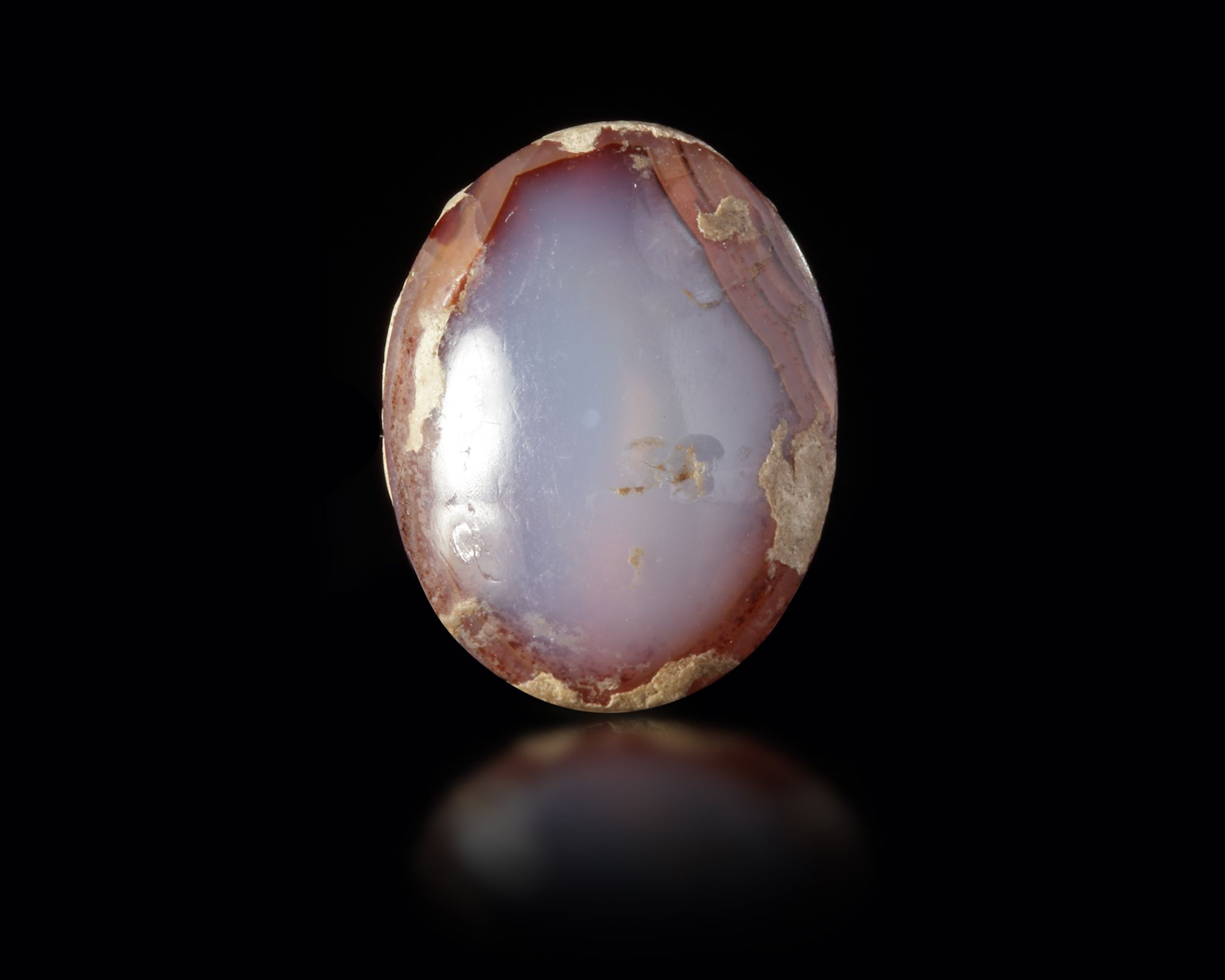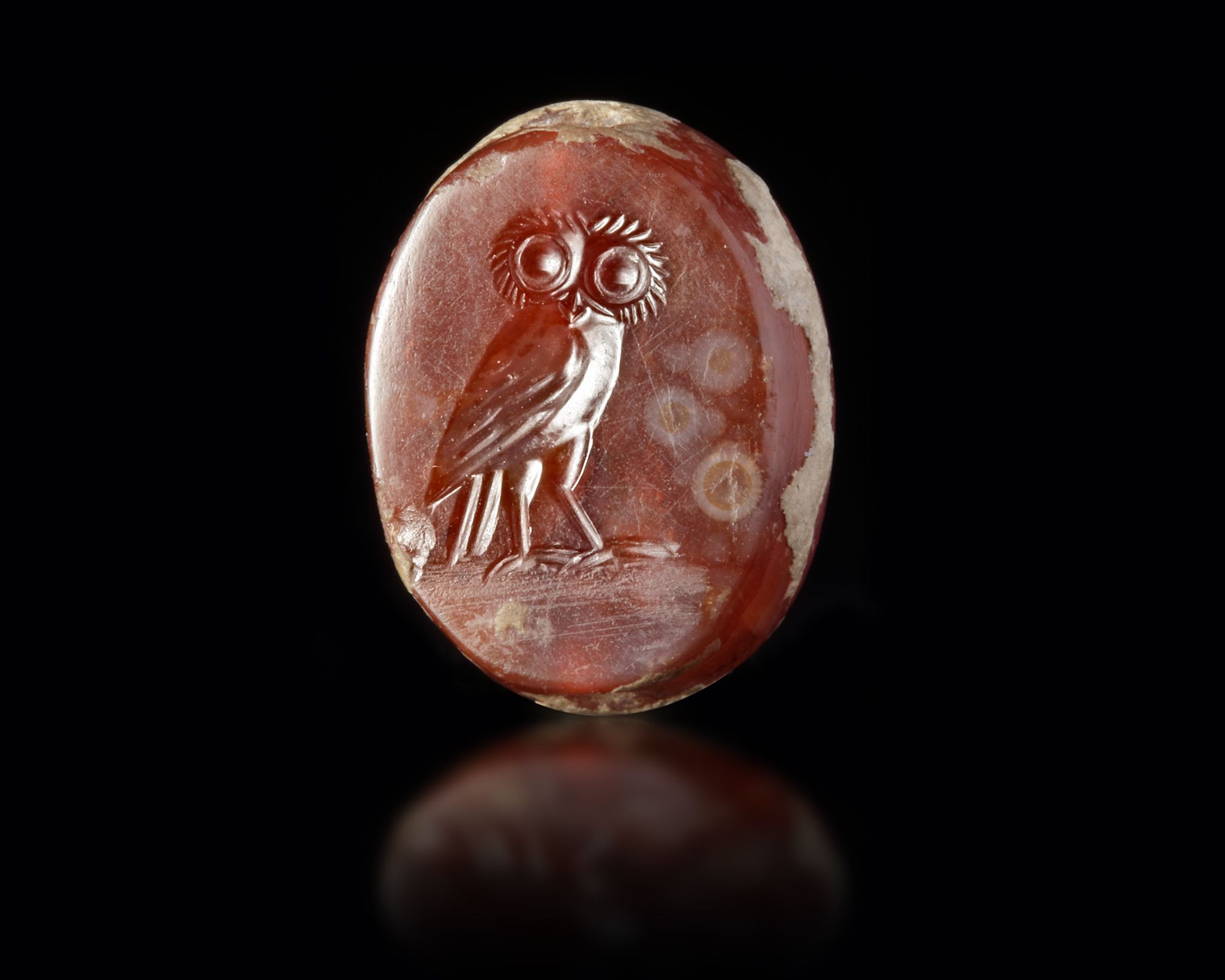 An Eastern Greek in red variegated agate with a chalcedony inclusion. This scaraboid is made from a a deep red/brown agate with the back showing a layer of a blue/grey stone. The seal is a standing owl as often seen on the coinage of Athens. This would have been used a personal seal and may have been the heraldic device of the family.