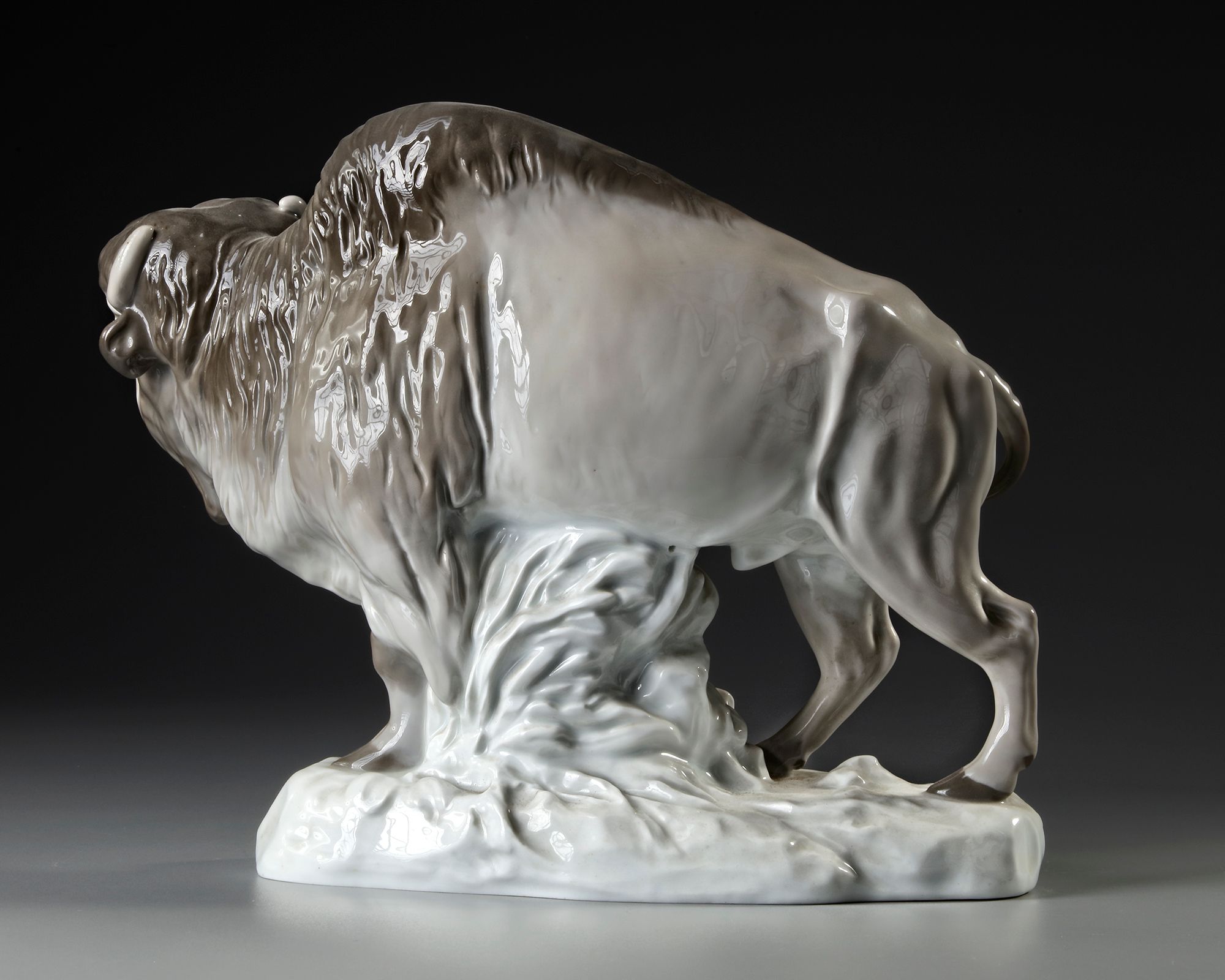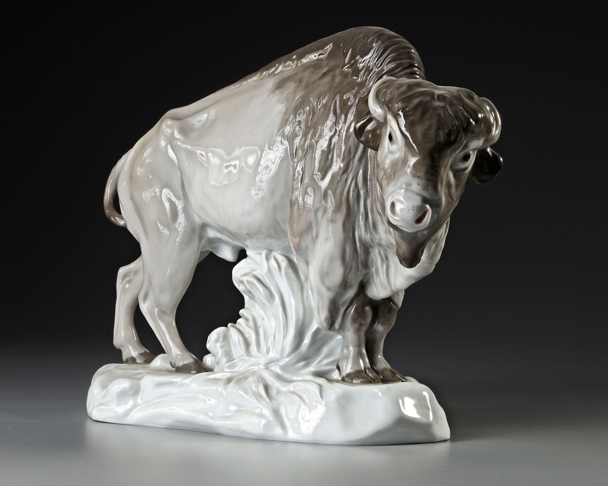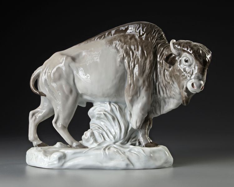 A porcelain sculpture of a bison. The sculpture depicts the bison in a powerful, dynamic posture, with its head slightly turned towards the viewer. The detailing is realistic, with the texture of the fur carefully represented. The porcelain has a glossy finish, and the colors range from light brown to white. The sculpture stands on a simple white pedestal that mimics the shape of a rock. 44 by 29 cm.