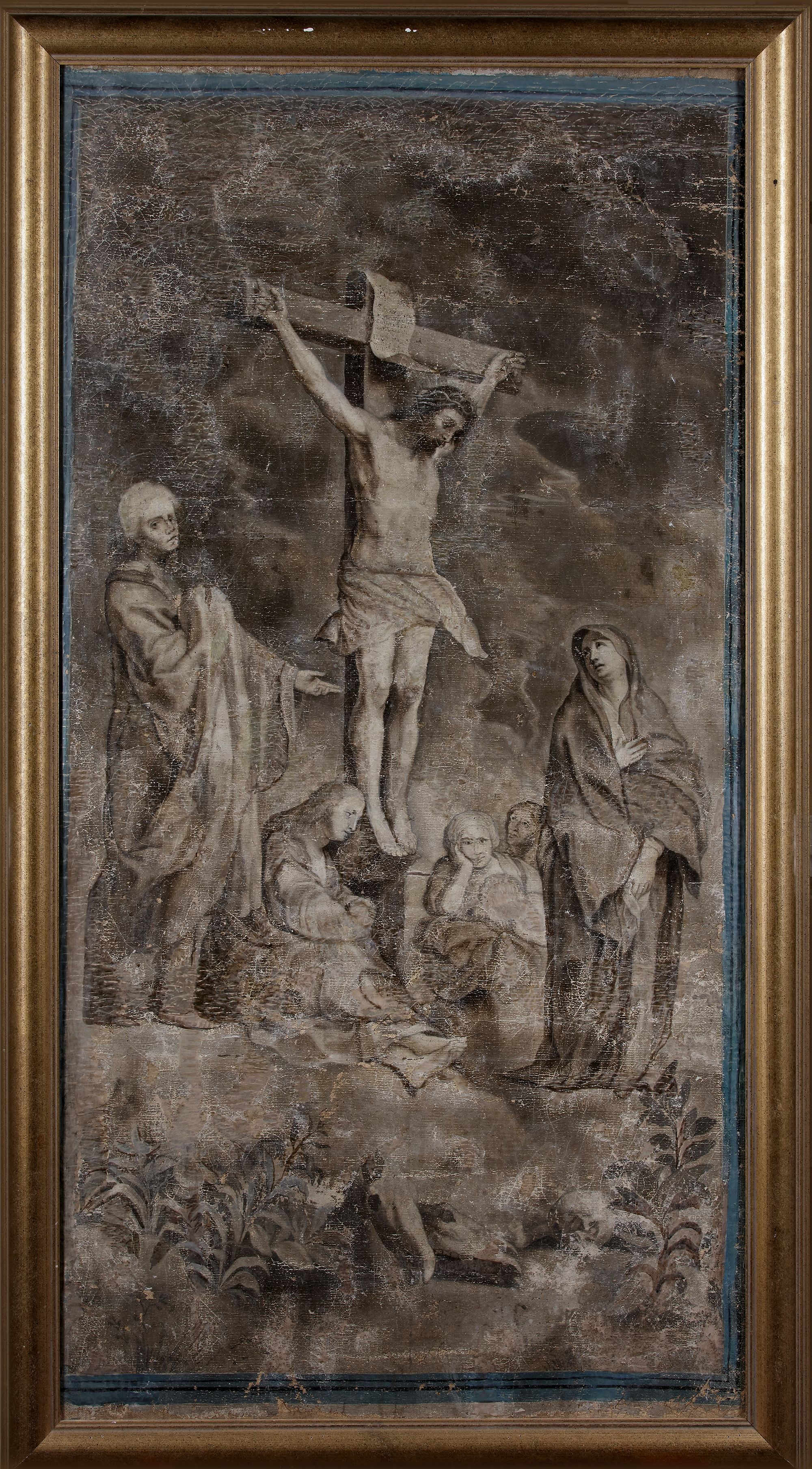 Rendered in a monochromatic or sepia-toned style. At the center, Jesus is shown on the cross, with his head bowed, symbolizing his death. Surrounding him are several figures commonly present in Crucifixion scenes, including the Virgin Mary on the right, possibly Saint John the Evangelist on the left, and other figures who could be mourning women or disciples. The composition suggests sorrow and mourning, emphasized by the postures of the figures, some kneeling in prayer or weeping.