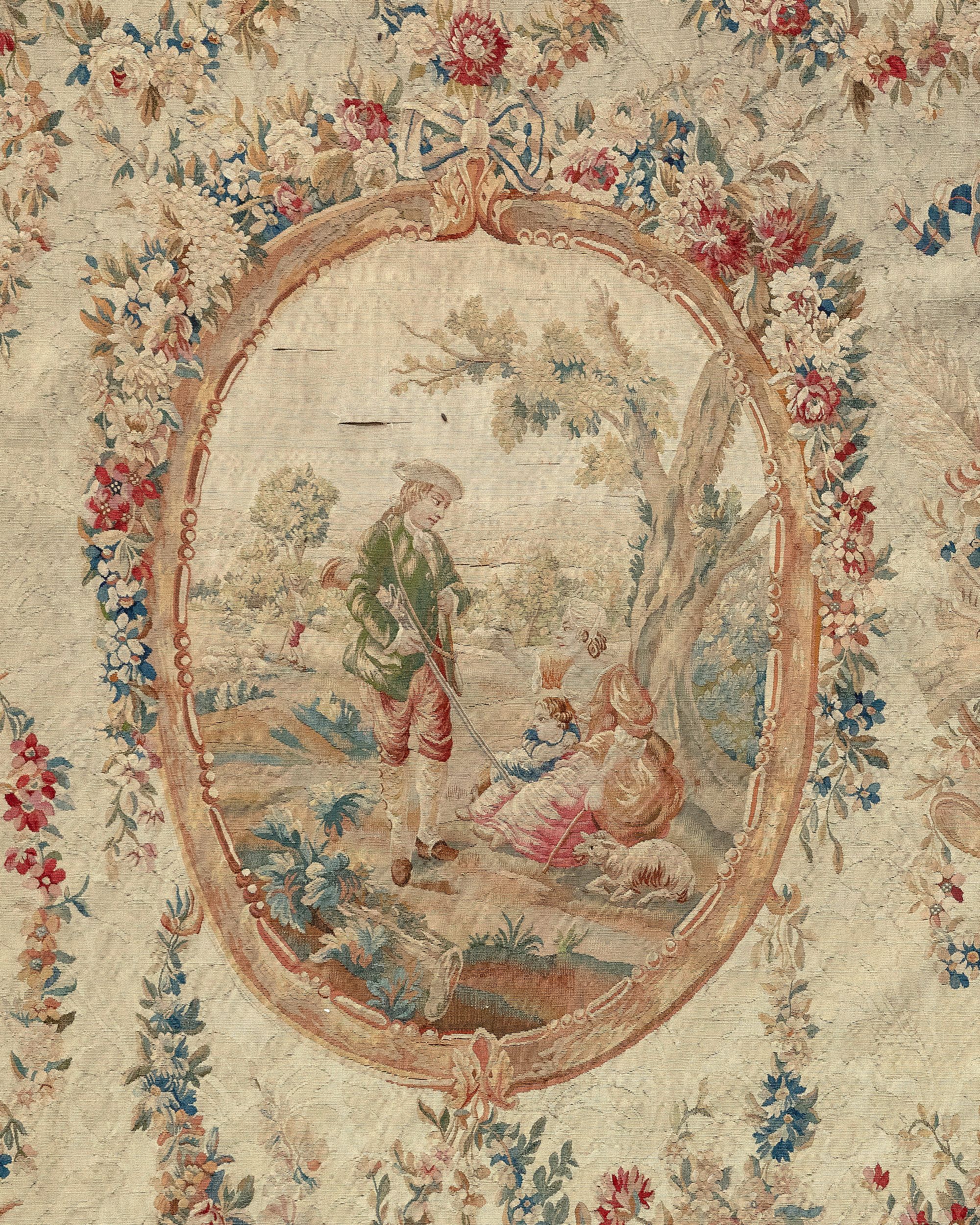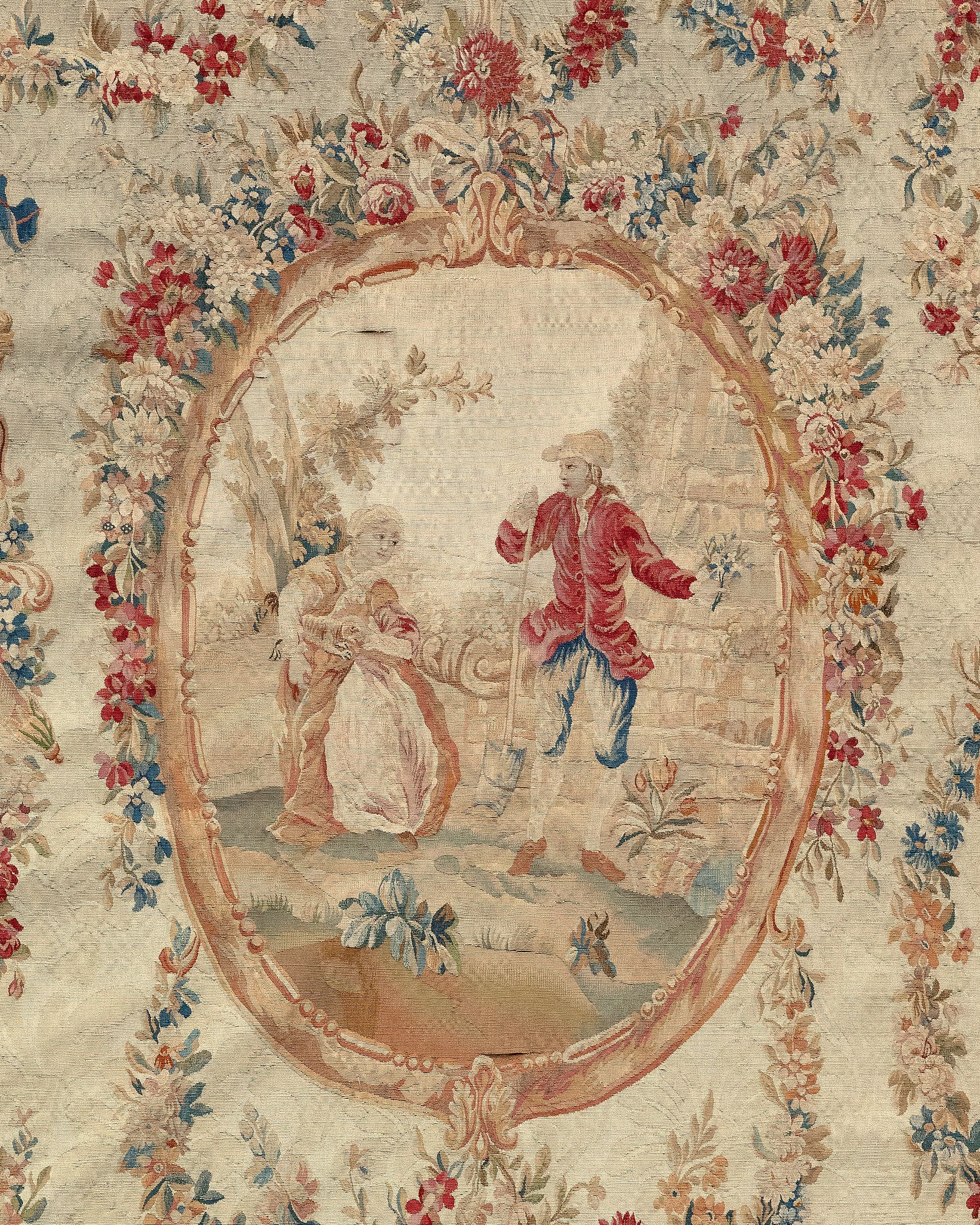 Rococo tapestry with a pair of pictorial locket roundels depicting courting couples surrounded by an acanthus leaf frame and delicate floral garlands each hanging from a blue ribbon Overall in good condition with some exposed warp threads, backed with fine linen. 290 by 240 cm Lit.: Dora Heinz, Europäische Tapisseriekunst des 17. und 18. Jahrhunderts, ill.: 108.