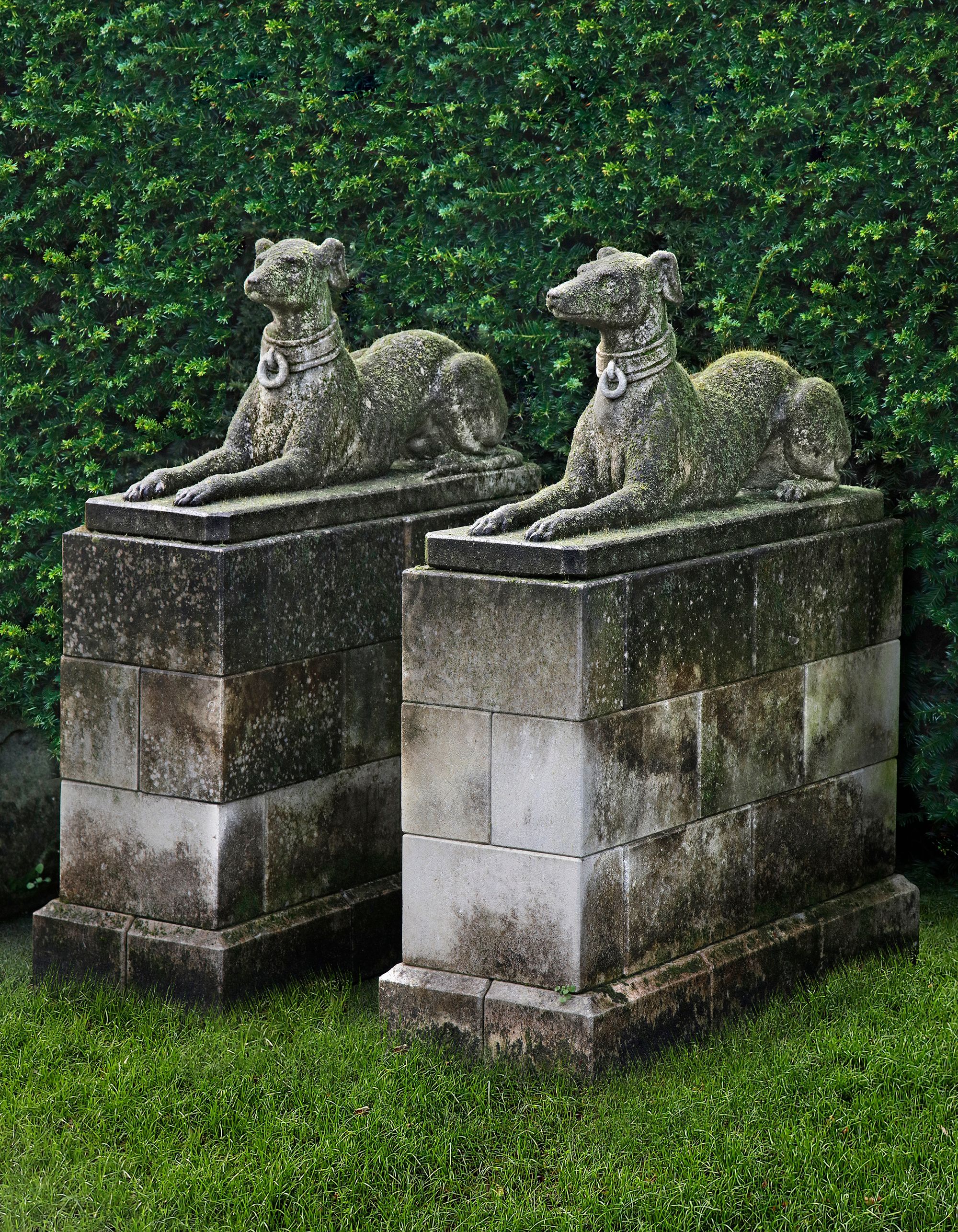 A PAIR OF SCULPTED LIMESTONE MODELS OF RECUMBENT HOUNDS, SECOND HALF 20TH CENTURY