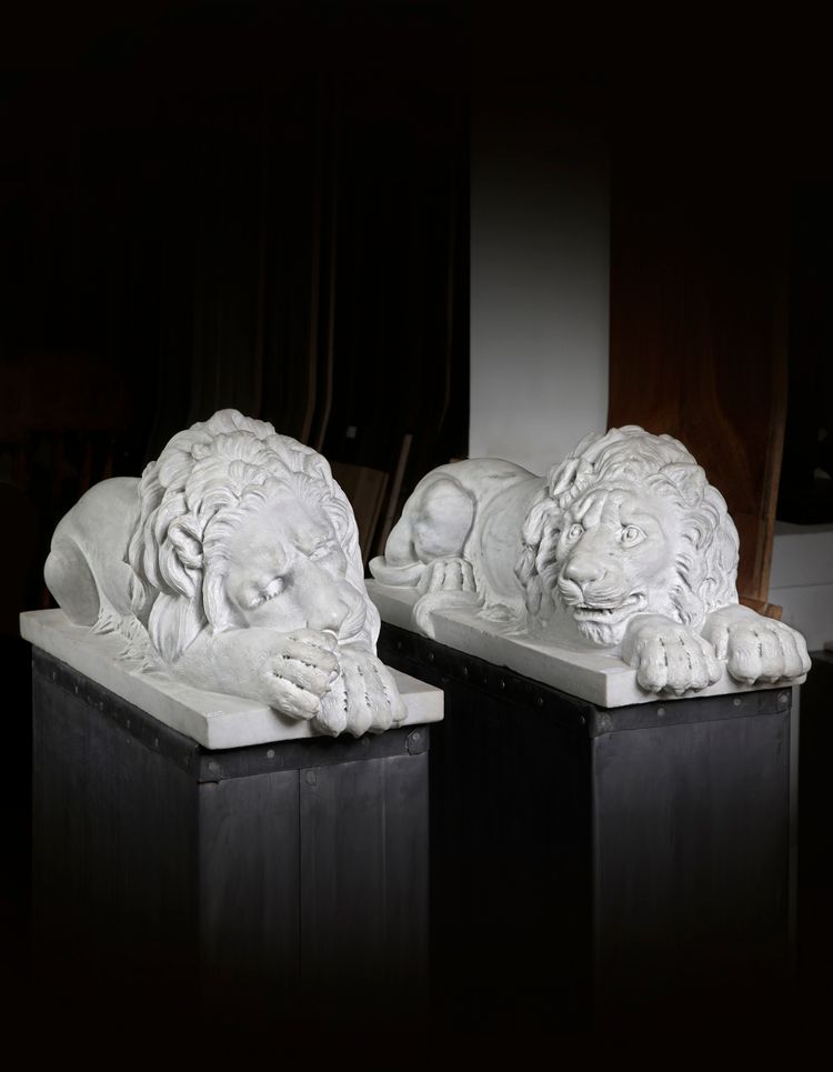 Loosely after the manner of Antonio Canova (Venetian 1757-1822), one portrayed sleeping, the other alert. Signed D. Cervietti to plinths. The larger 33 cm. high, 79 cm. long, 26 cm. wide.