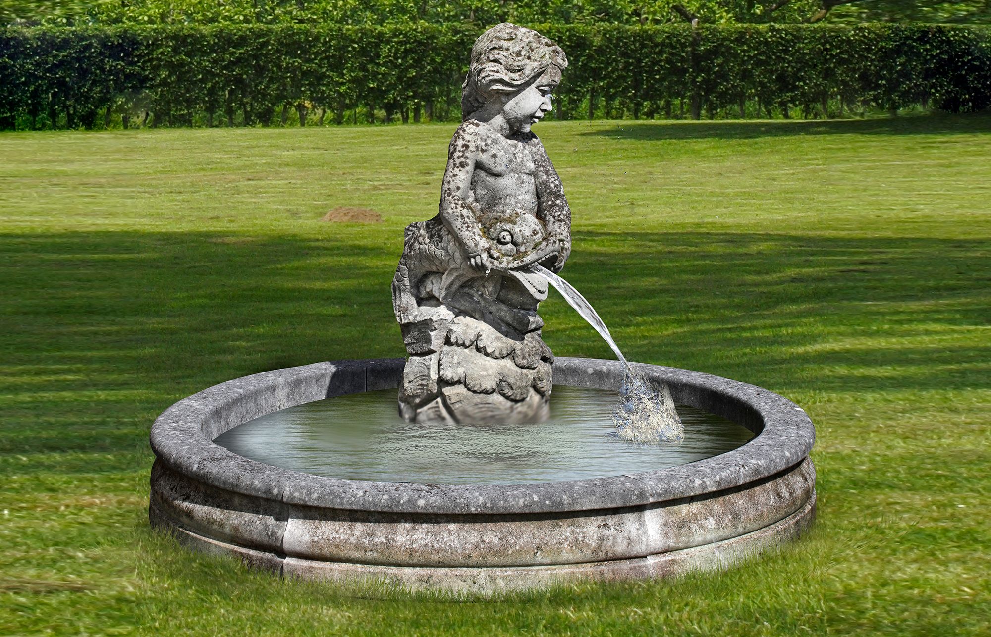 Modelled as a putto holding a dolphin, the water designed to issue from the agape mouth, above a block base.