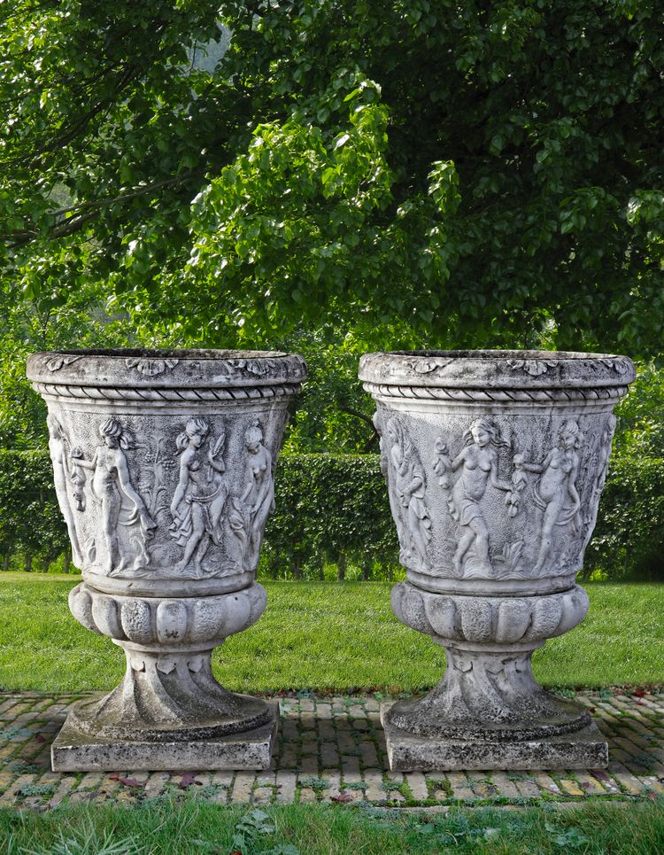Each with body decorated with a band of classical dancing maidens. 118 cm. high, 83 cm. diameter, 62 cm. square at the base.