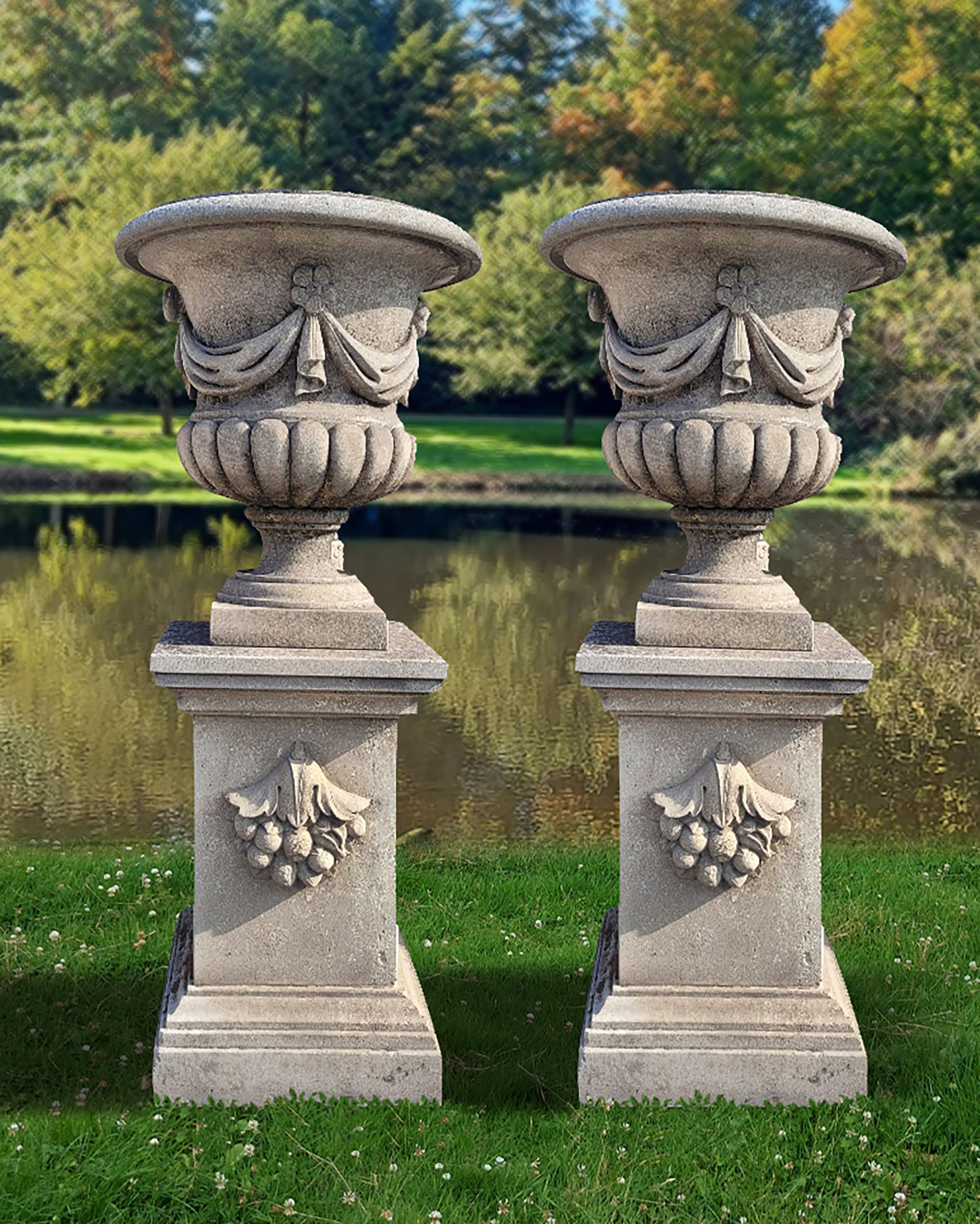 The urns decorated with festoons. Pedestal at one side decorated with grapes. High overall 205 cm. Vase high 100 cm. diameter 75 cm. diameter.