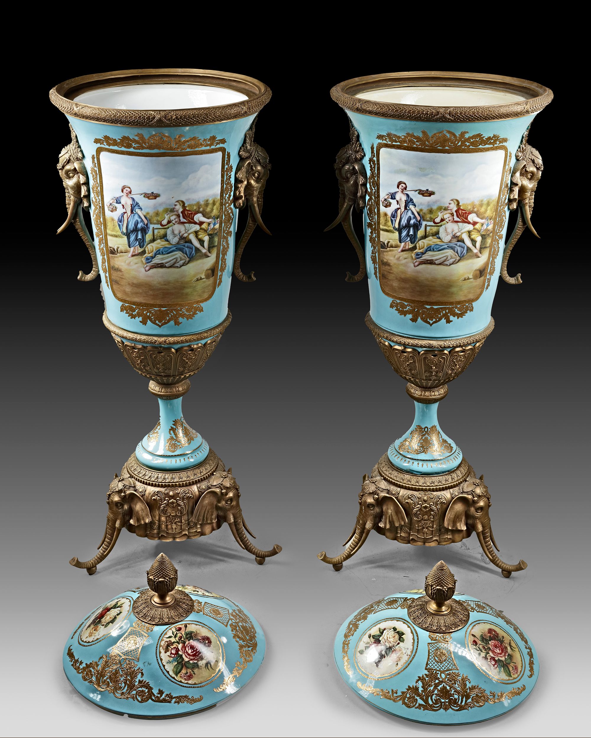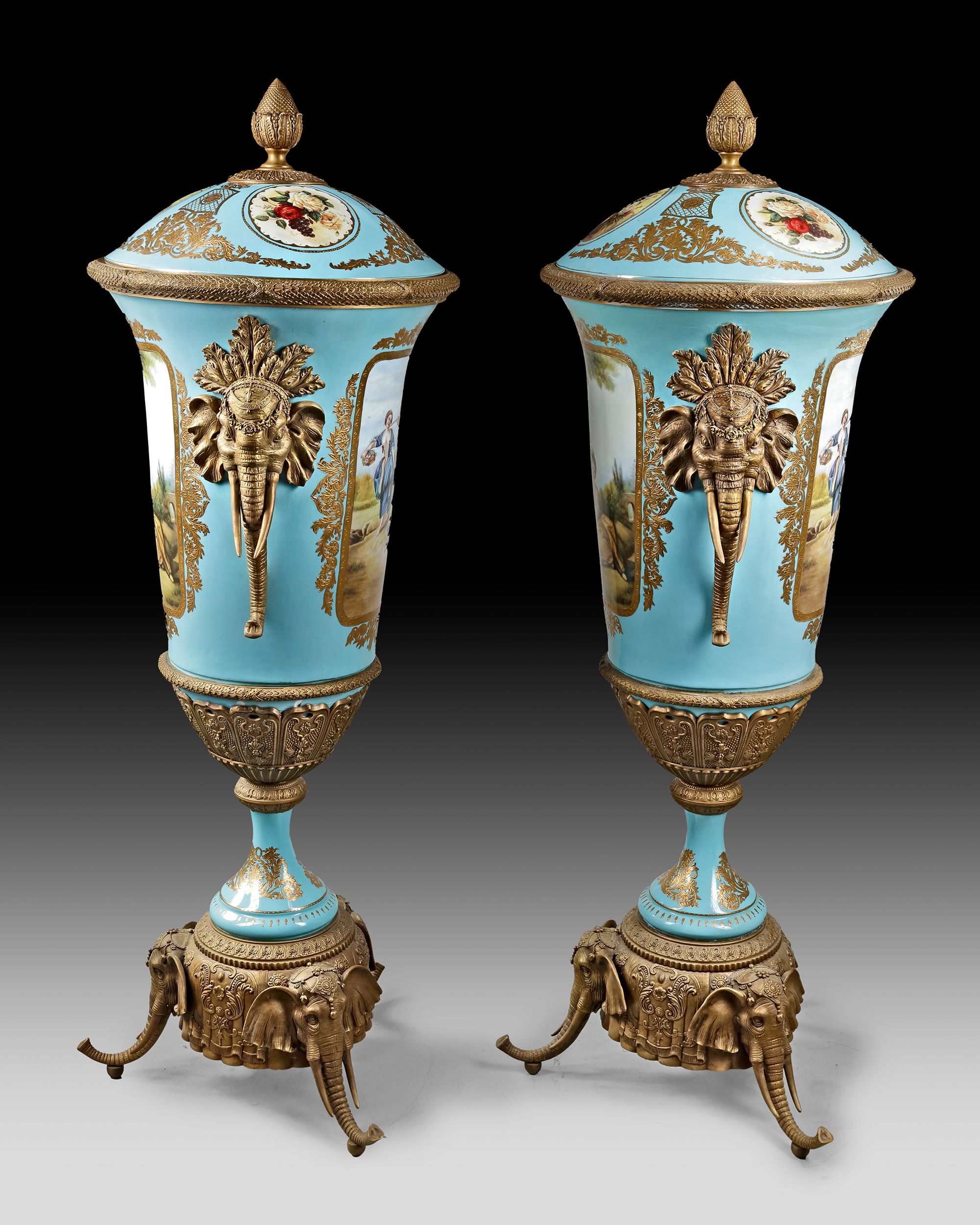 Turquoise background, golden decoration of scrolls and flowers. Rch bronze ornamentation. Elephant head handles.