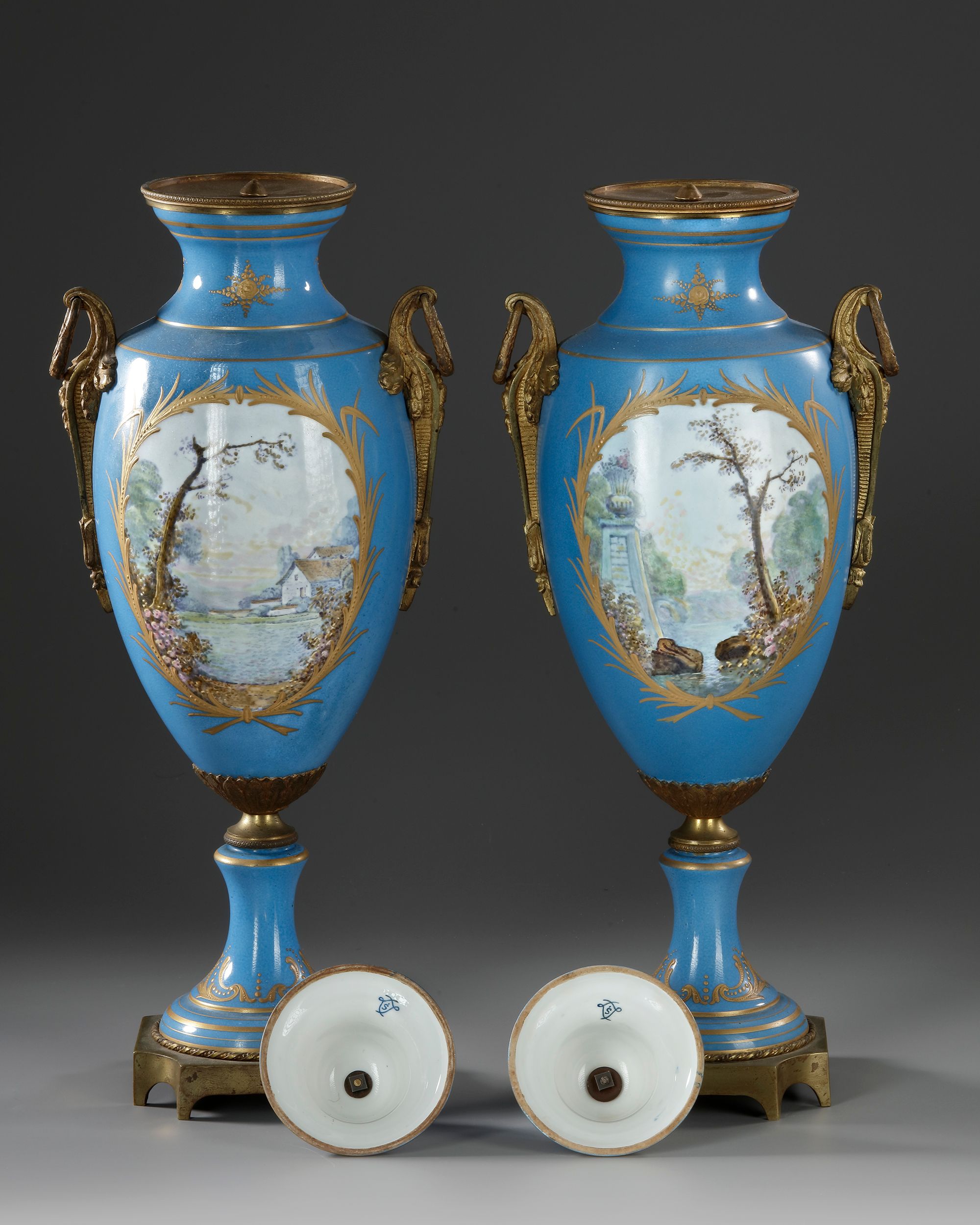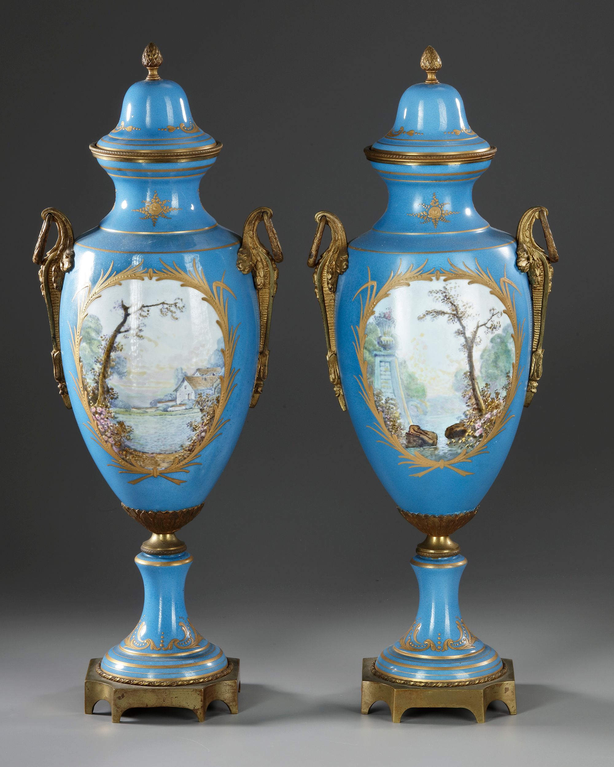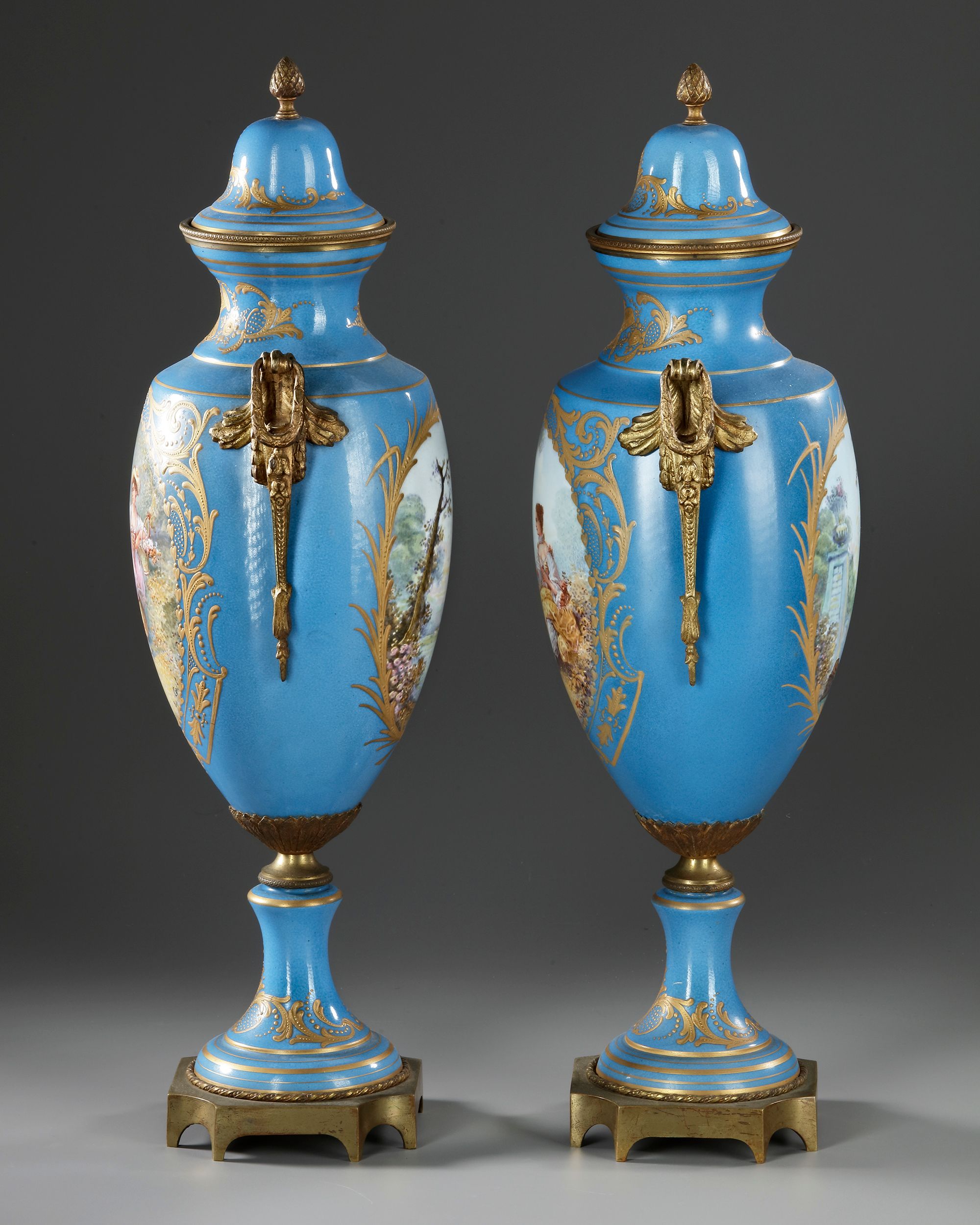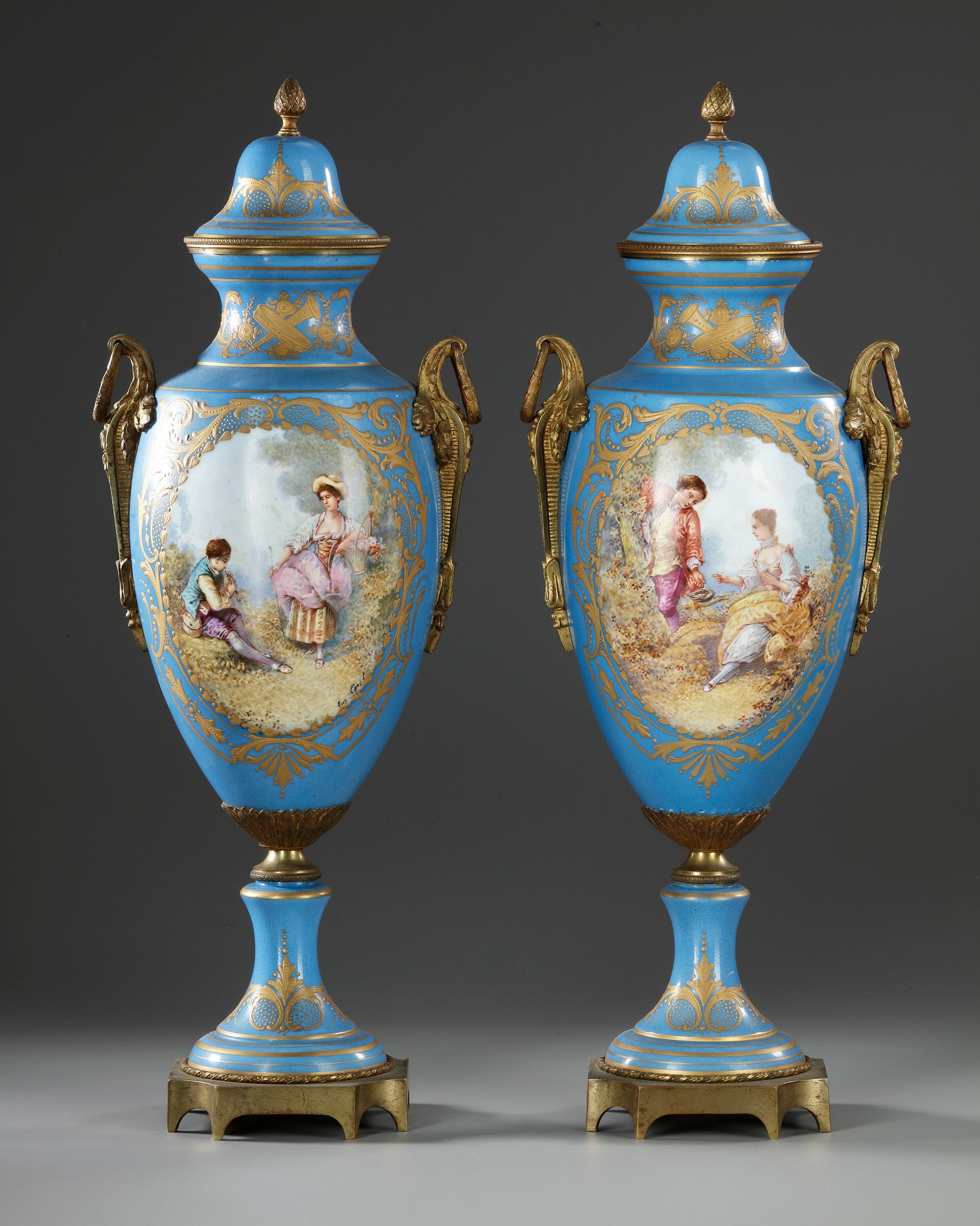 With gallant scenes. Painted in the butcher's style, with gilded bronze mounts. Height: 48 cm. Base: 11 by 11 cm.