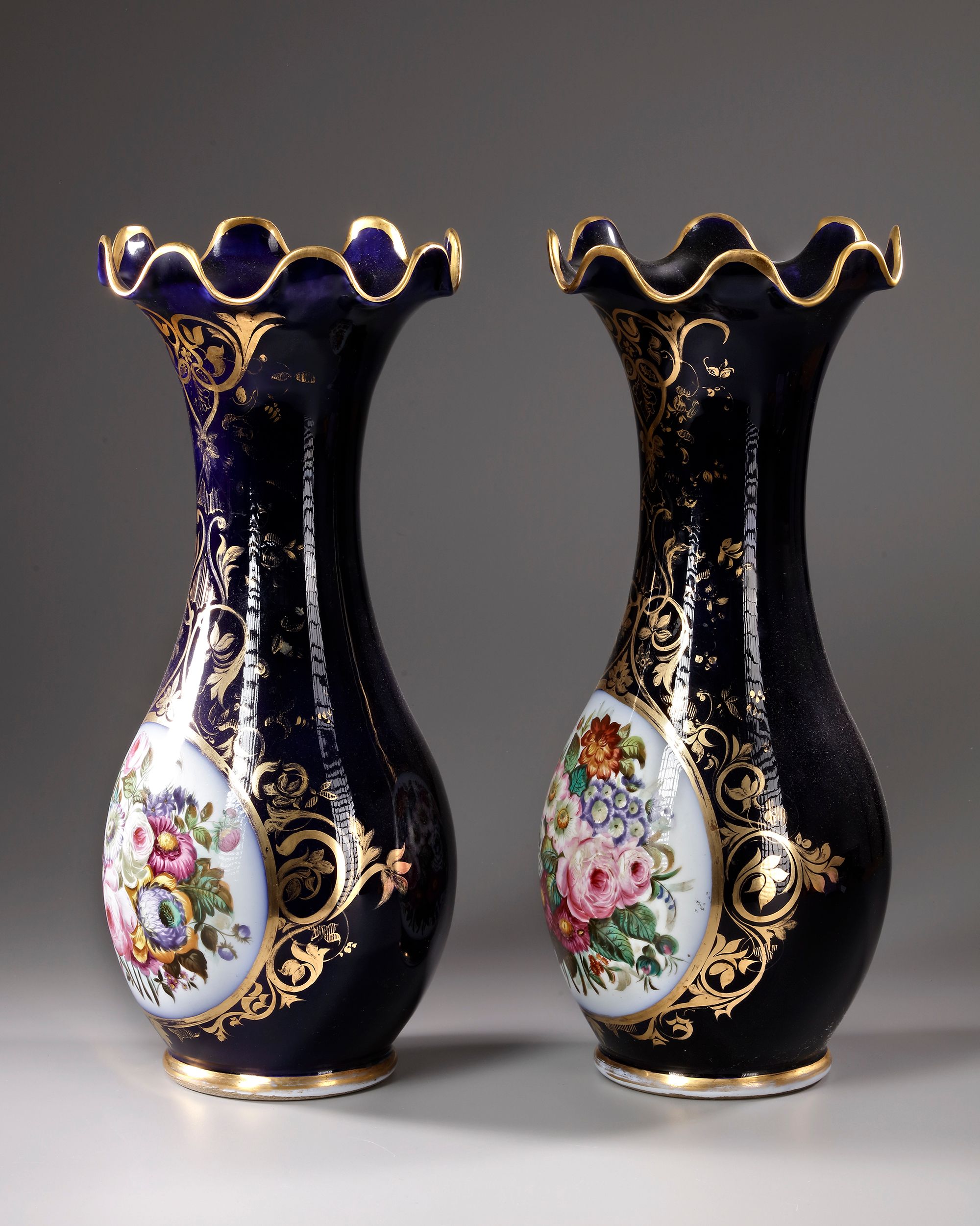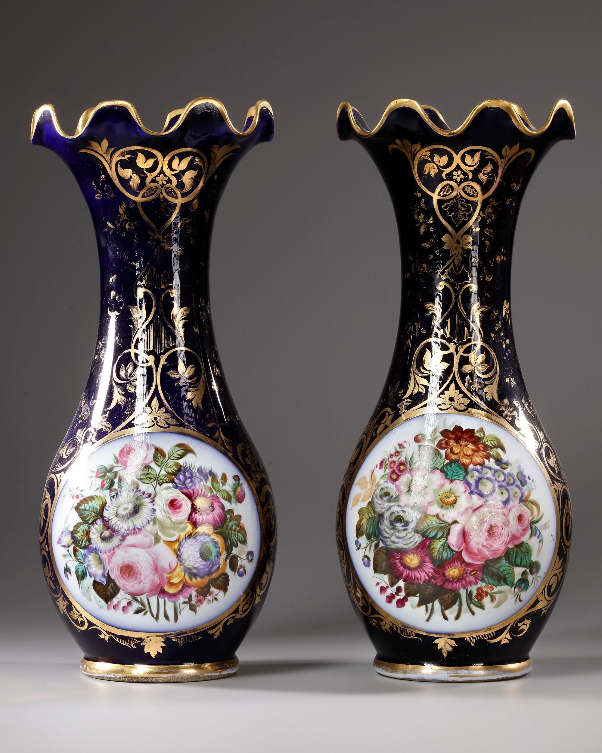 Blue enameled porcelain with gold highlights, and reserve decoration of bouquets of flowers.