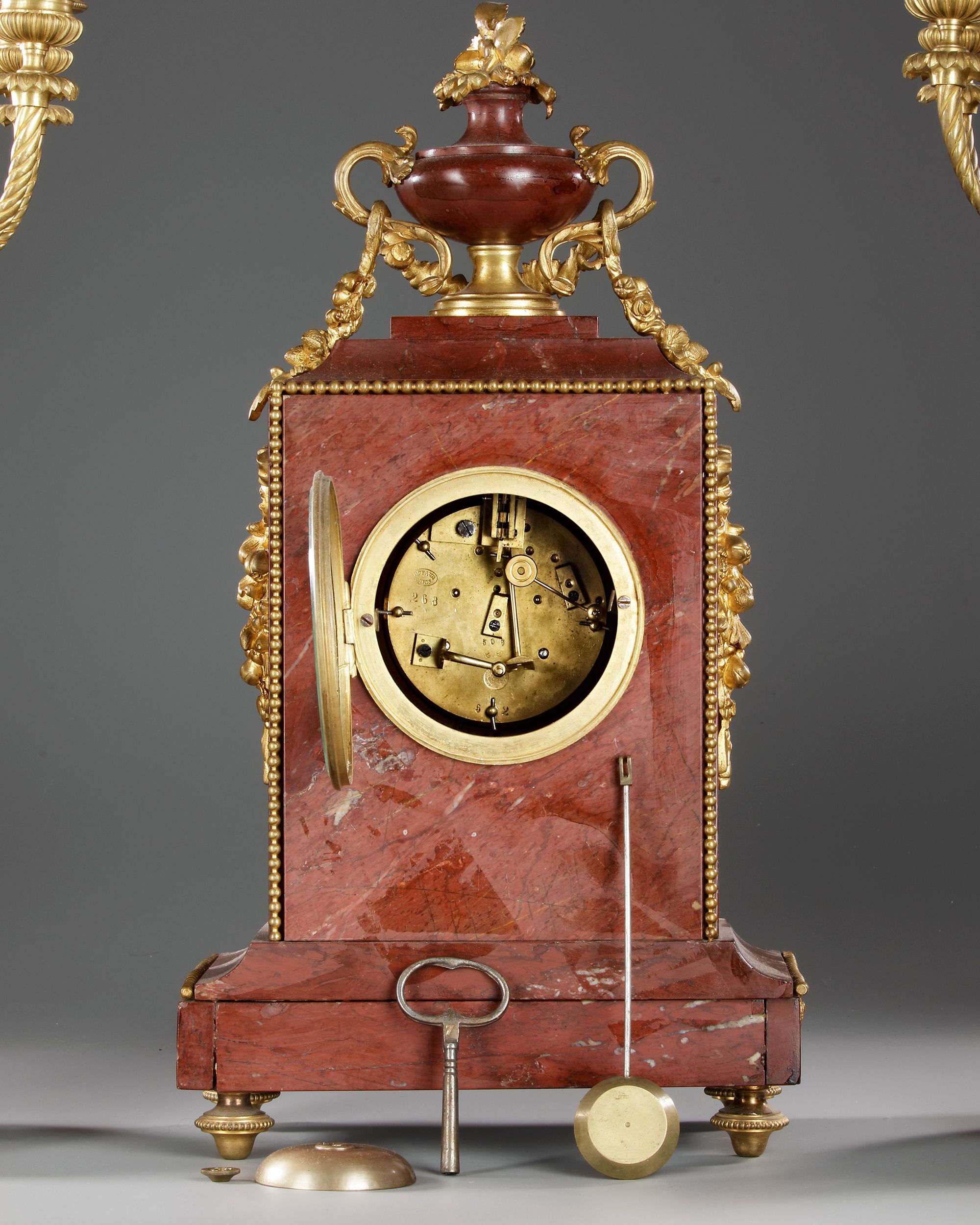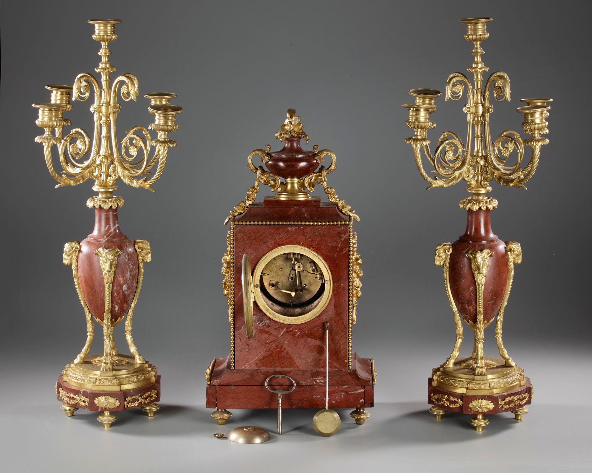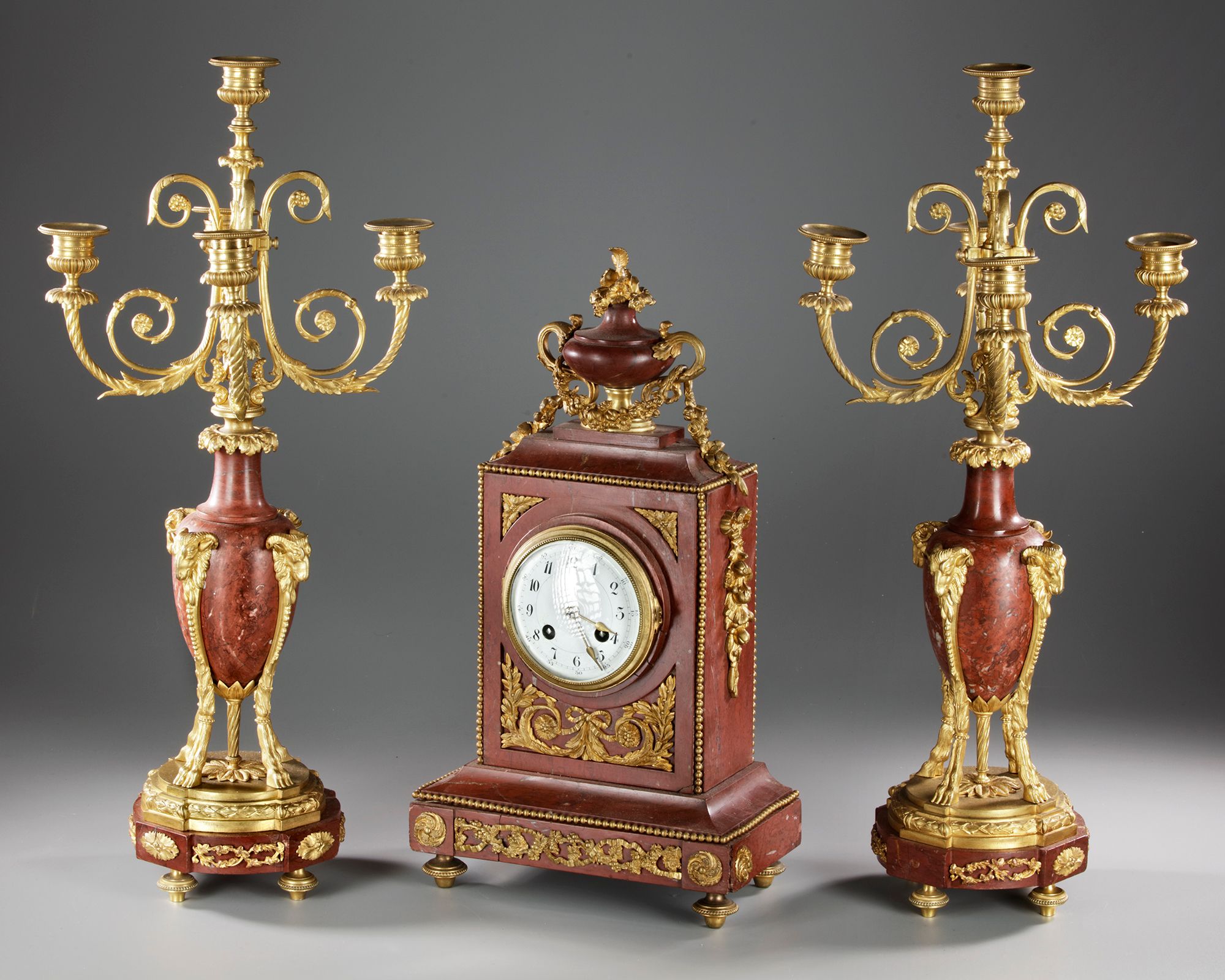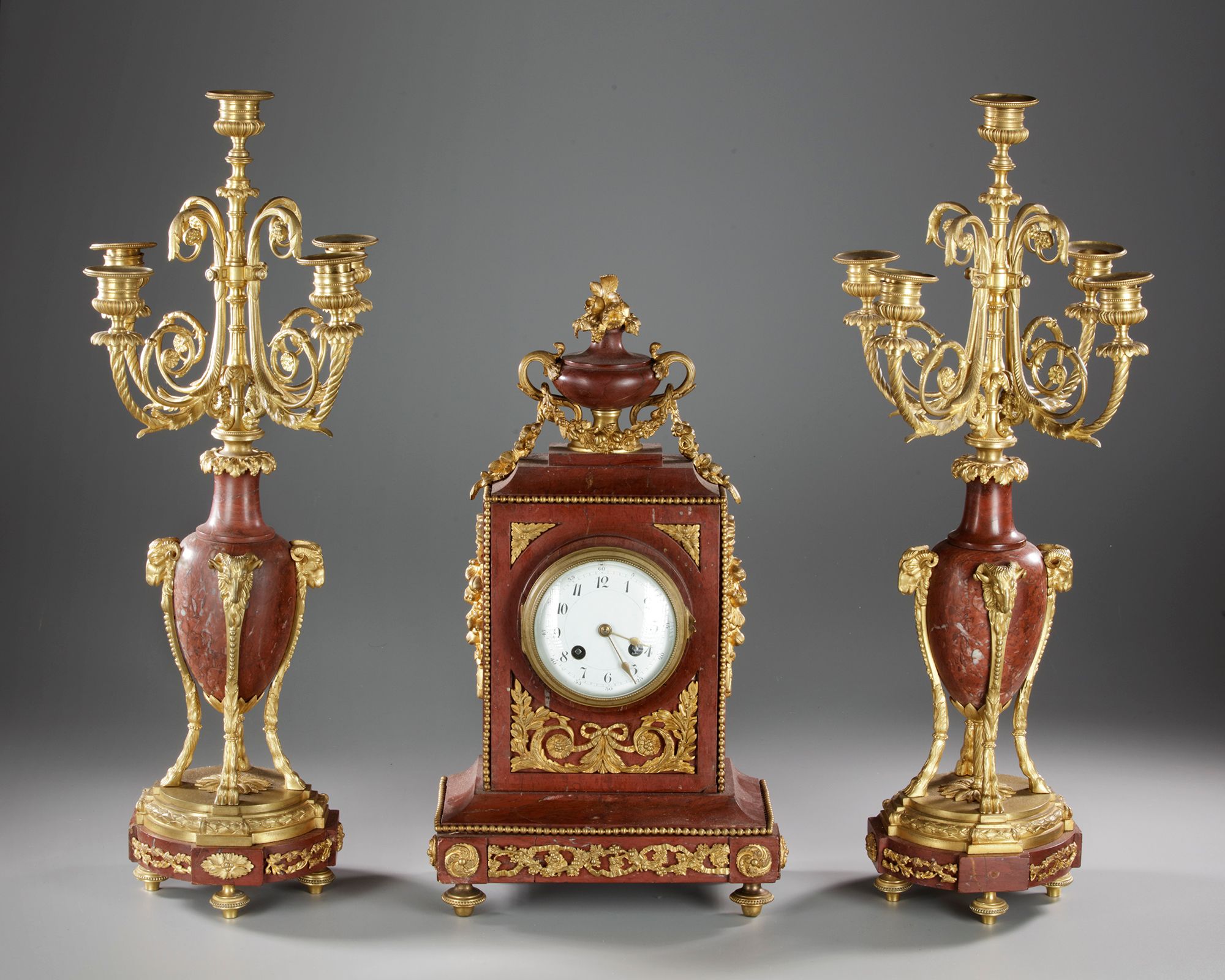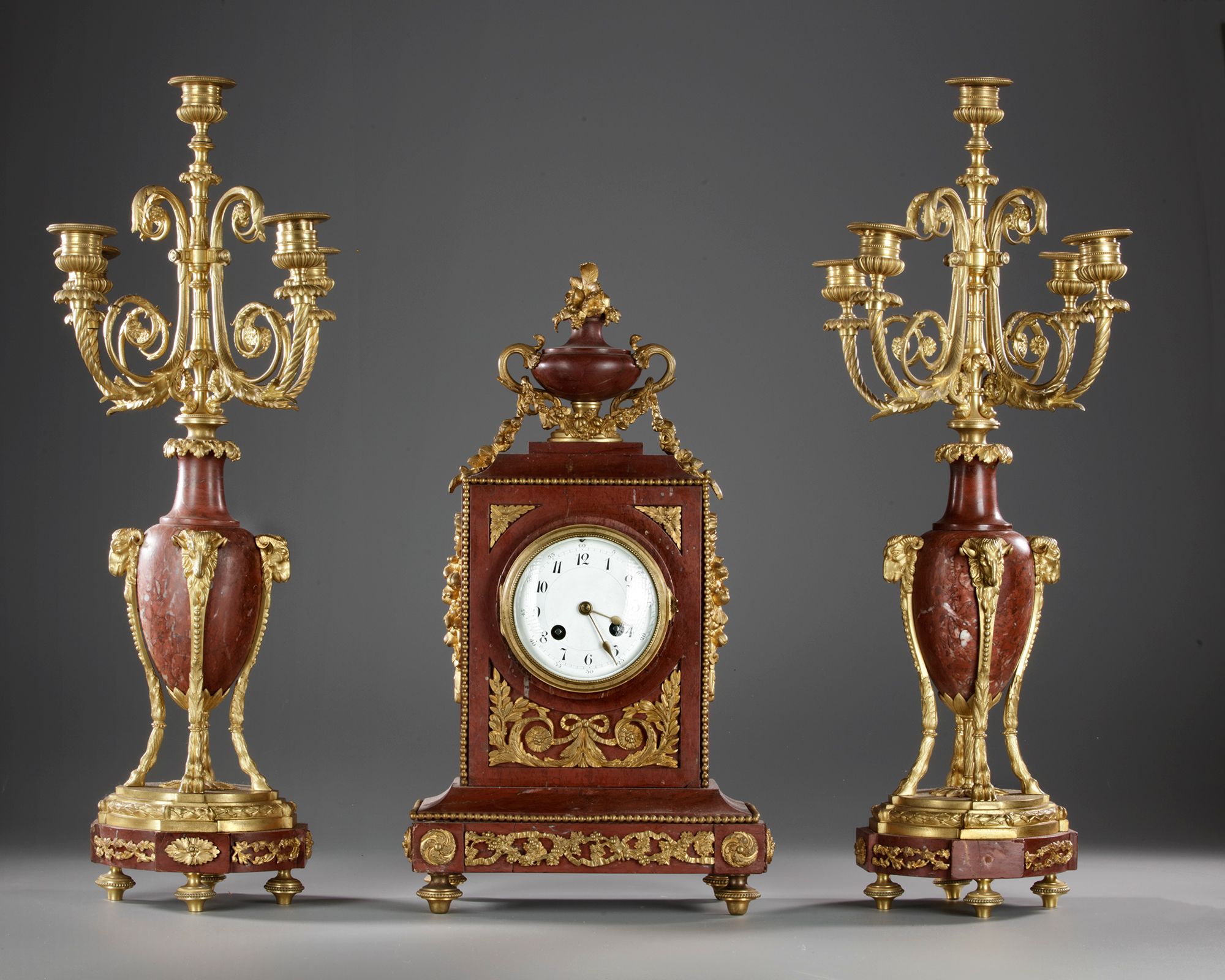 Composed of a clock and a pair of five-light candelabra. Signature on a calabra.