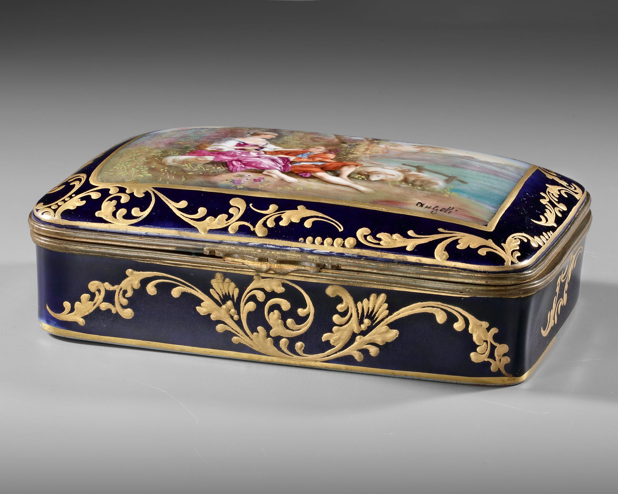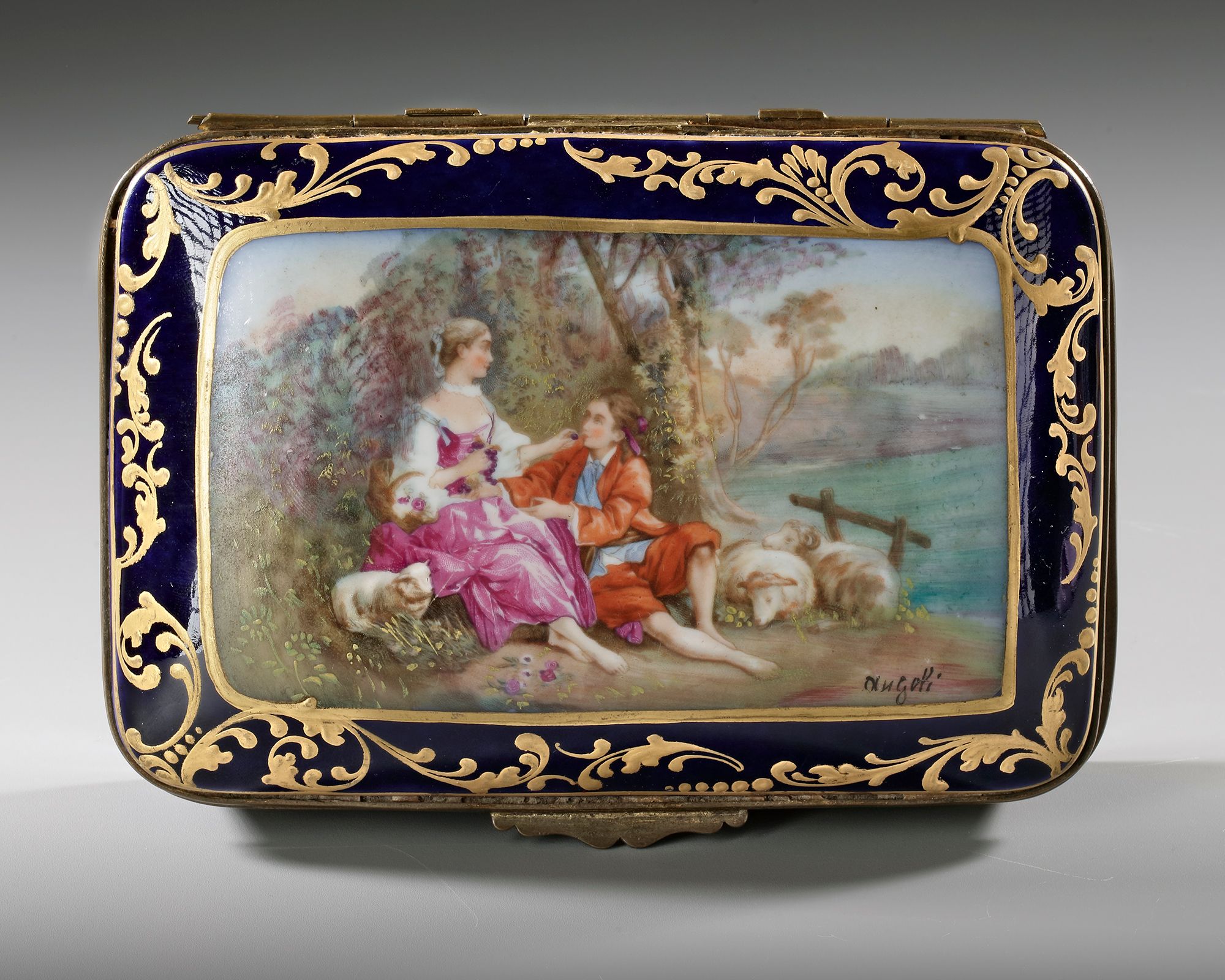 Rectangular with a painting of a gallant scene, golden decoration and floral inside the box.