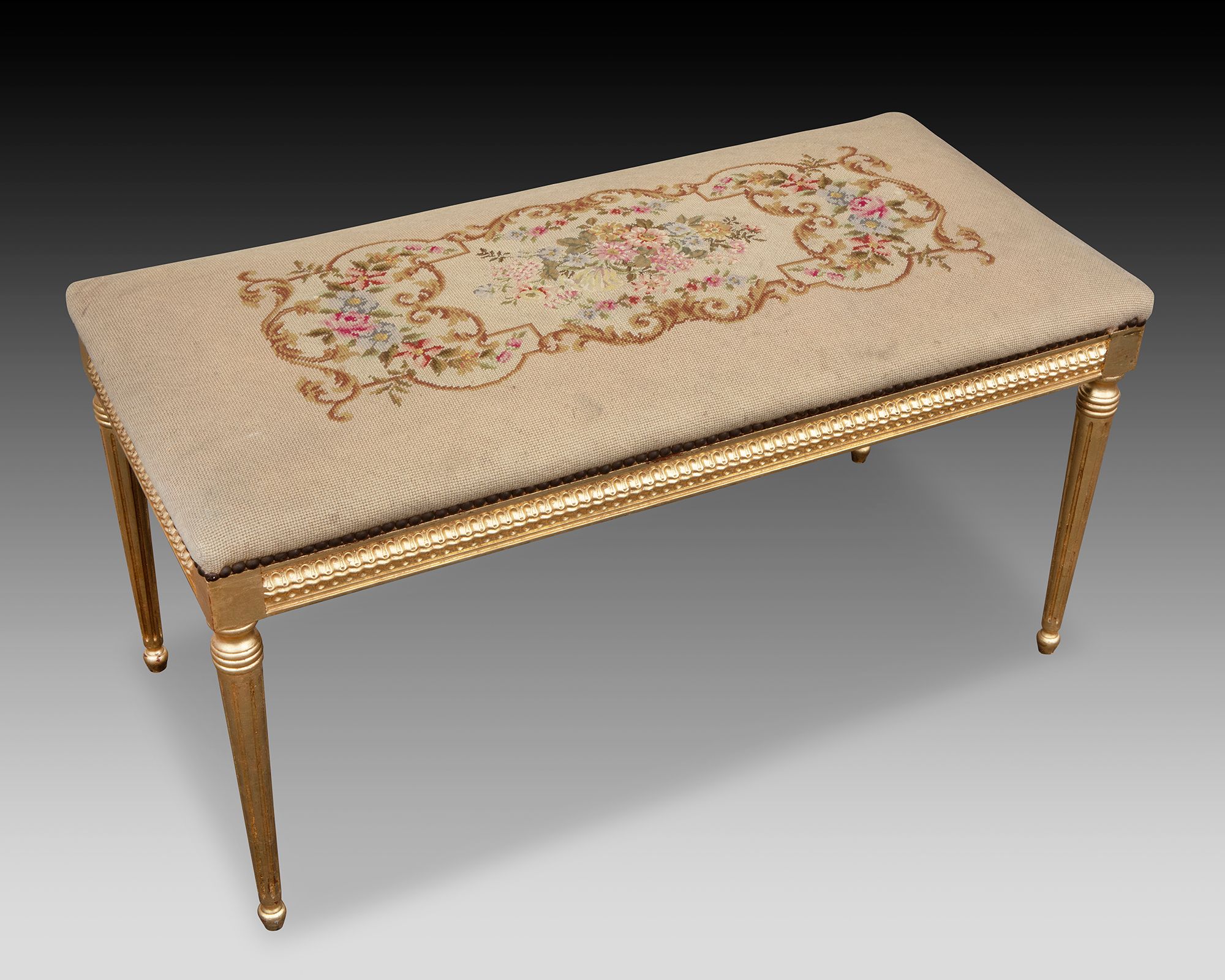 Trimmed with petit point fabrics. Height: 48 cm. Width: 99 cm. Depth: 46 cm. In very good condition