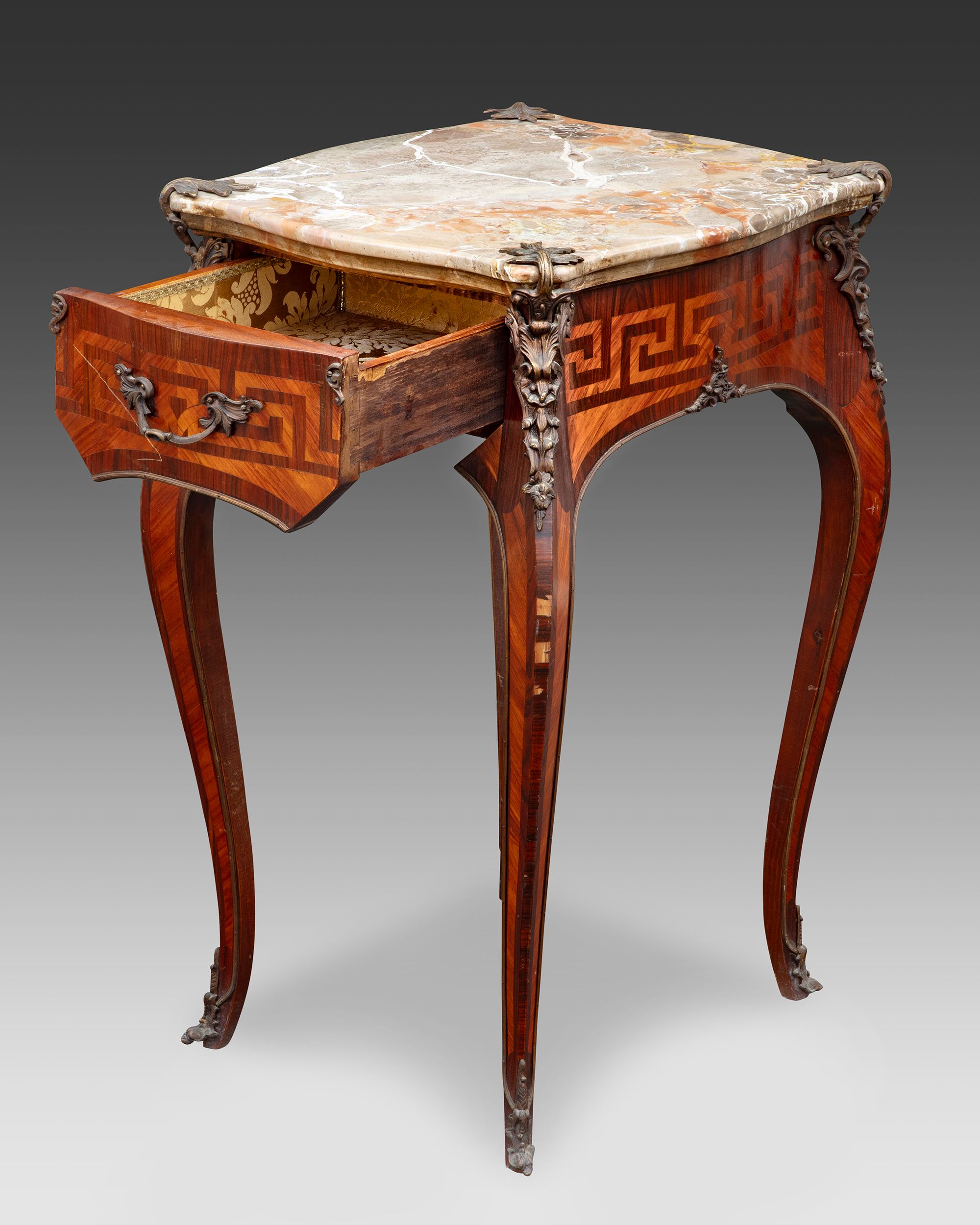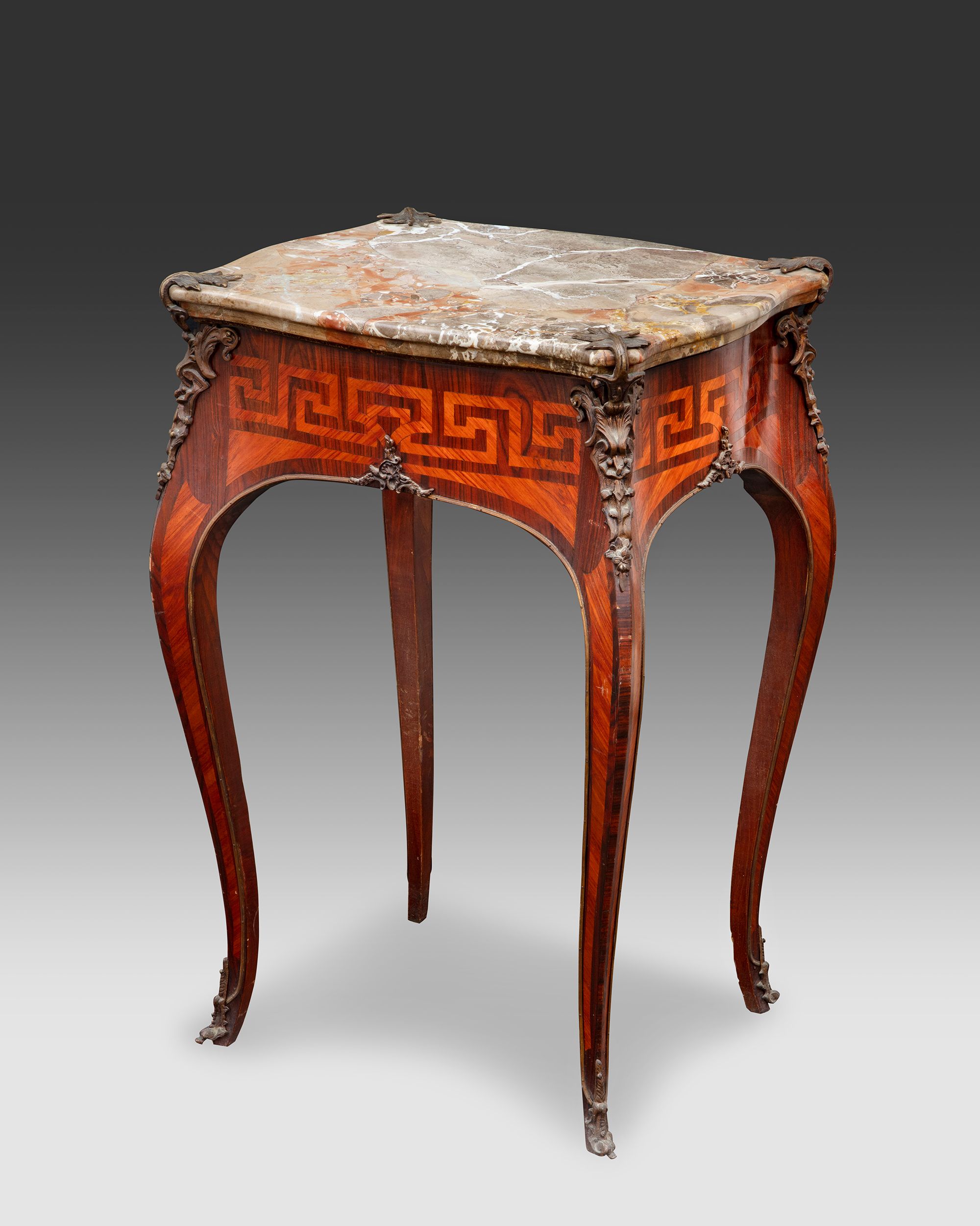 With rosewood veneer and gilded bronze ornamentation, a marble top. Height: 77 cm. Mable top: 51,5 by 43 cm. In fairly good condition.
