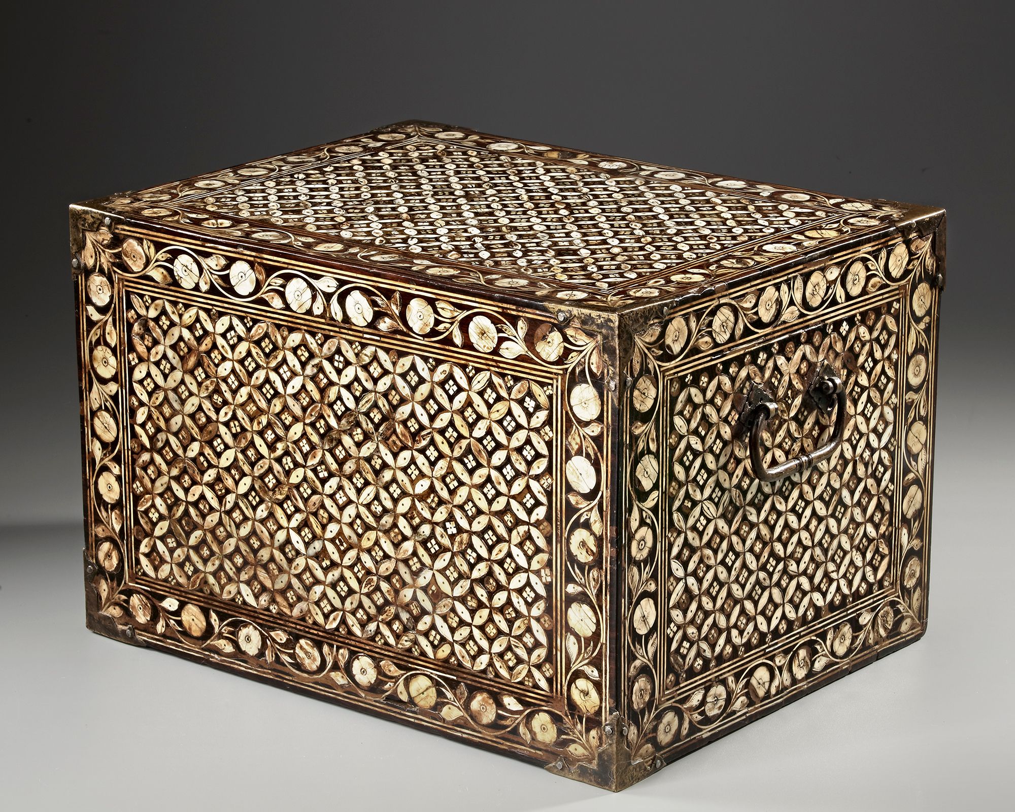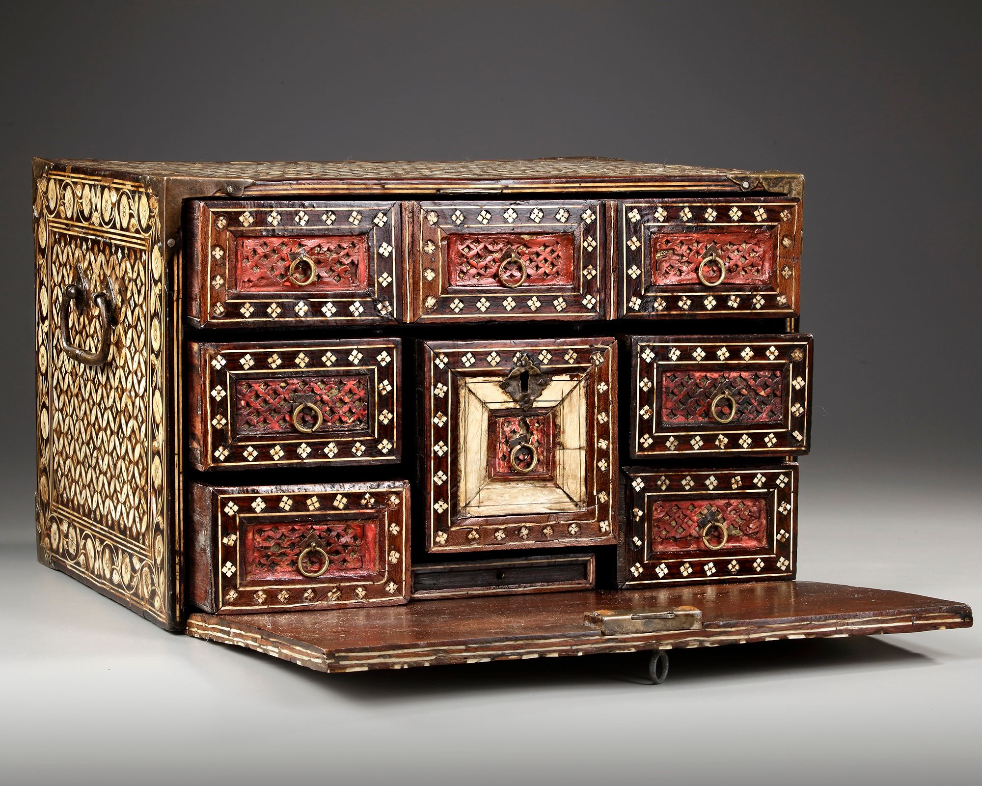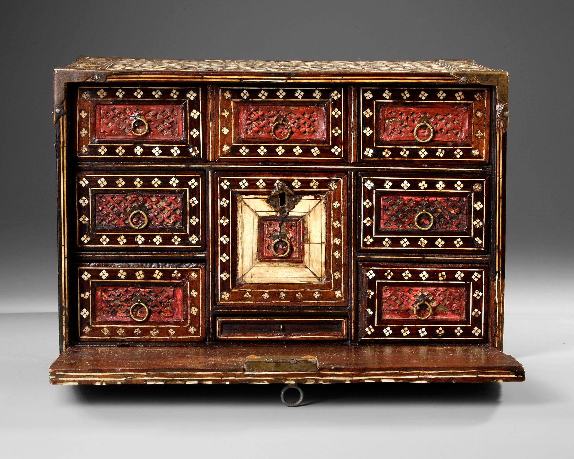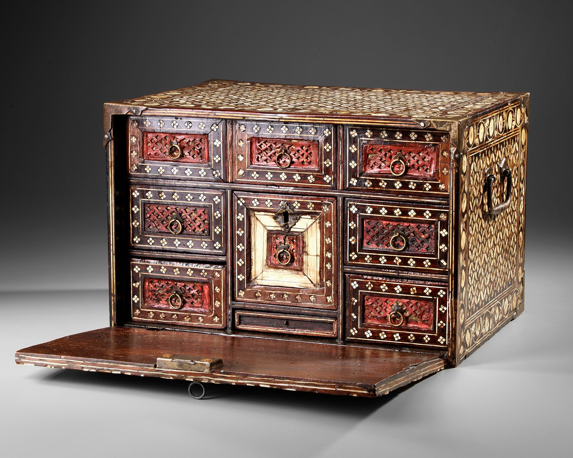 Of rectangular form with drop front opening to reveal seven drawers, each with gilt copper handle and decorated to the front with floral pierced wooden panel and bands of quatrefoil motifs surrounded by plain borders. The top and the sides with a lattice of four-petalled rosettes and cross-shaped motifs, bordered by a classic scrolling foliage, the sides with handles, with lock and key.