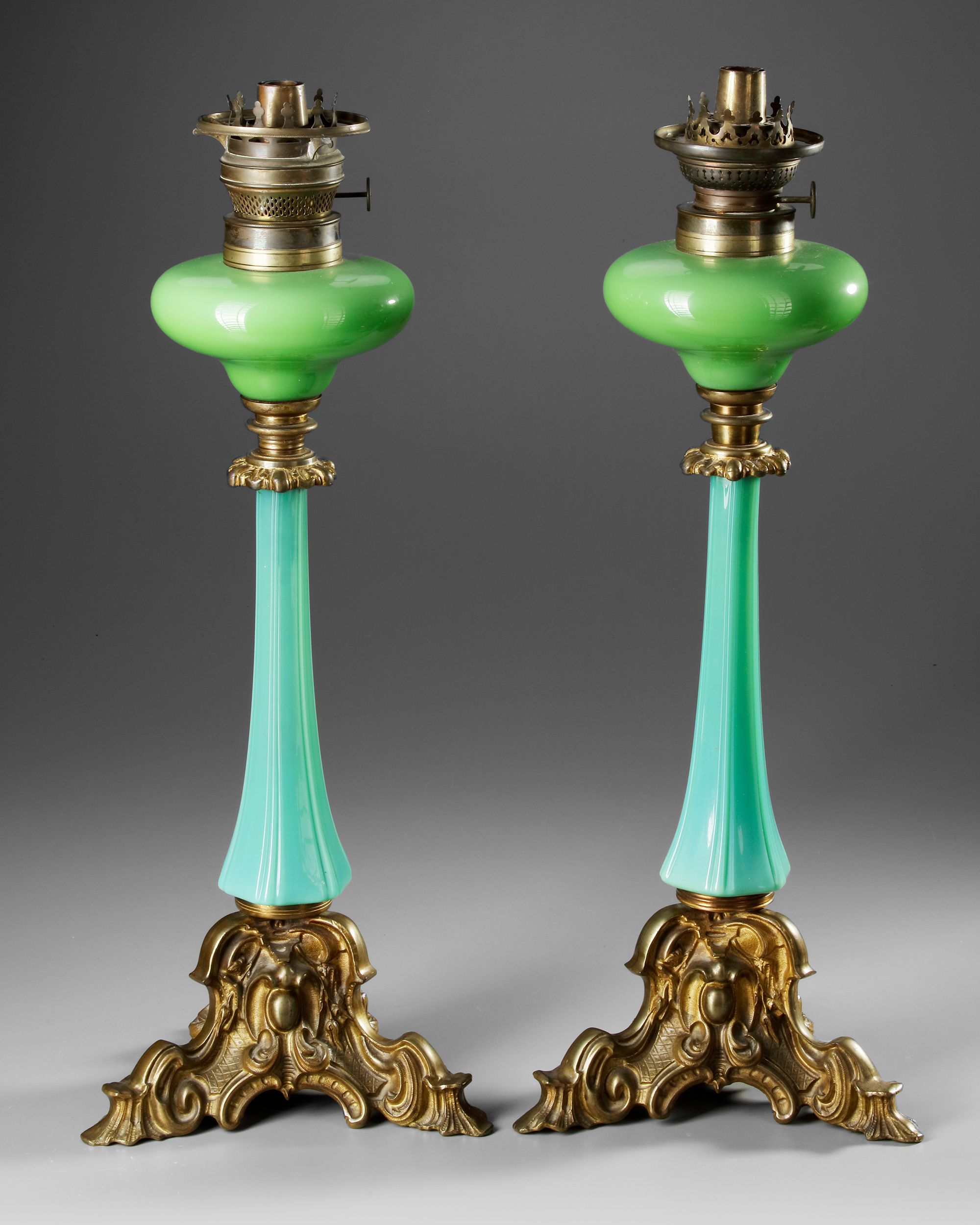 A pair of 19th-century oil lamps featuring ornate gilt bronze rococo-style bases and slender turquoise glass stems. Topped with green glass reservoirs, these lamps combine elegance and craftsmanship, making them both functional and decorative. Height: 56 cm