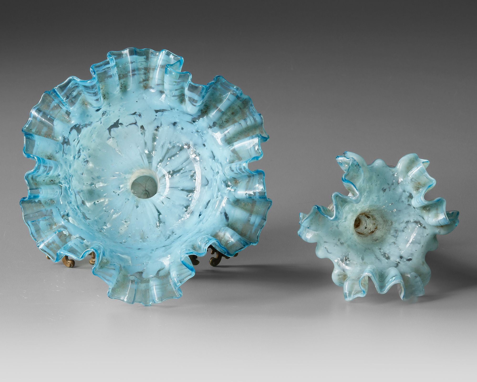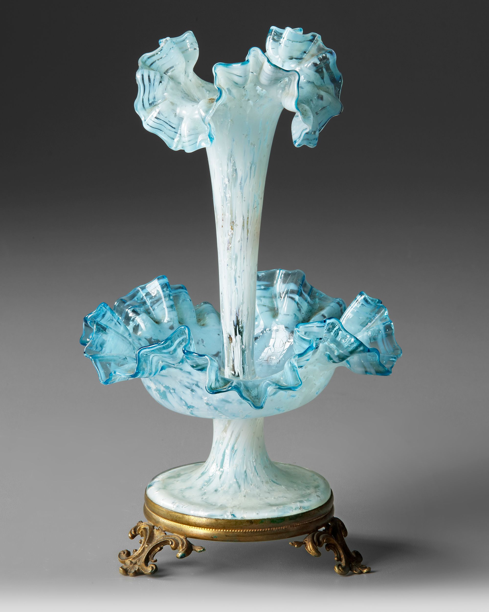 This elegant 19th-century epergne is crafted from opalescent glass, featuring a stunning blend of white and light blue hues. The design showcases a central fluted trumpet vase with delicately ruffled edges, gracefully rising from a broad, scalloped bowl. The glass displays a subtle iridescence, highlighting its intricate patterns and delicate craftsmanship. The epergne is mounted on an ornate gilt bronze base with scrollwork, Height: 24 cm