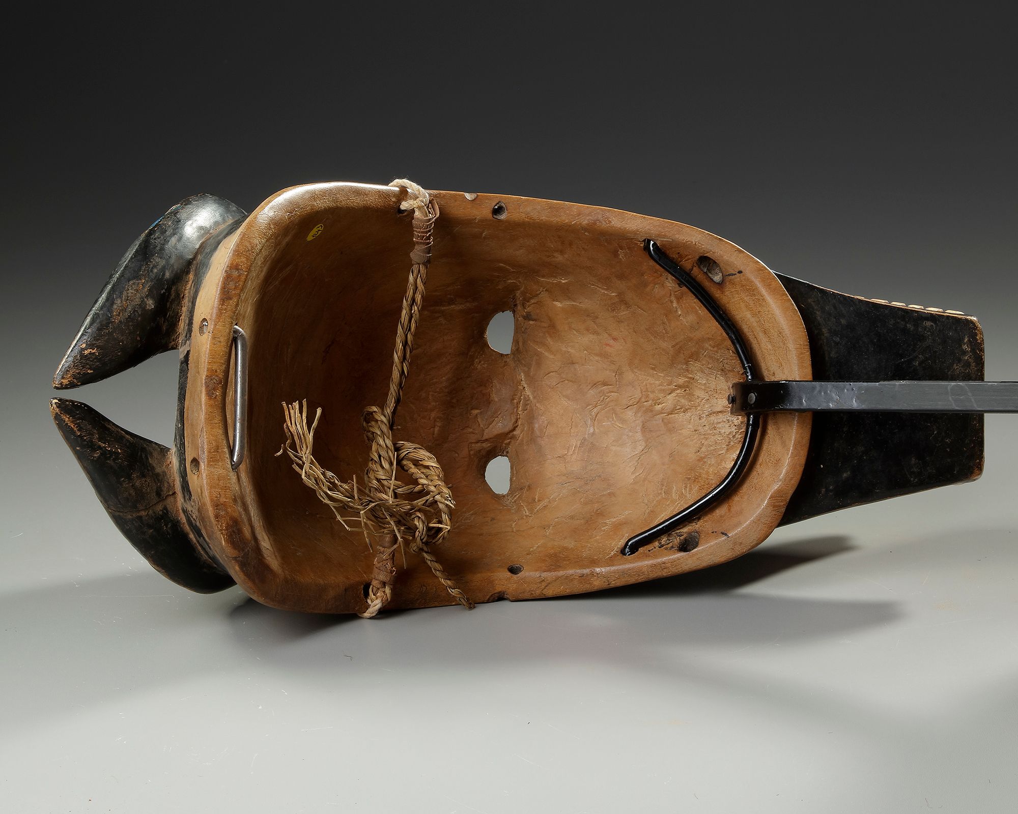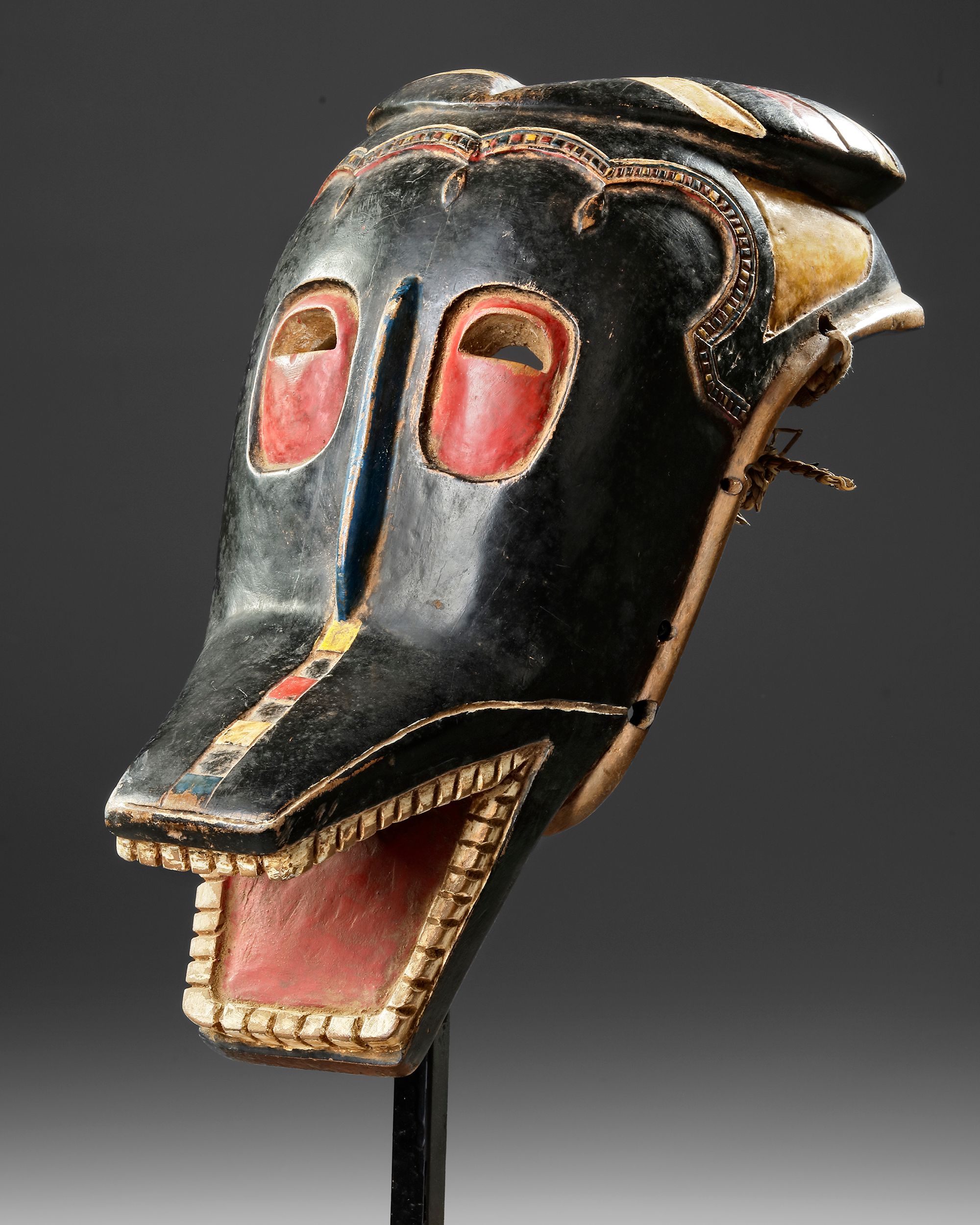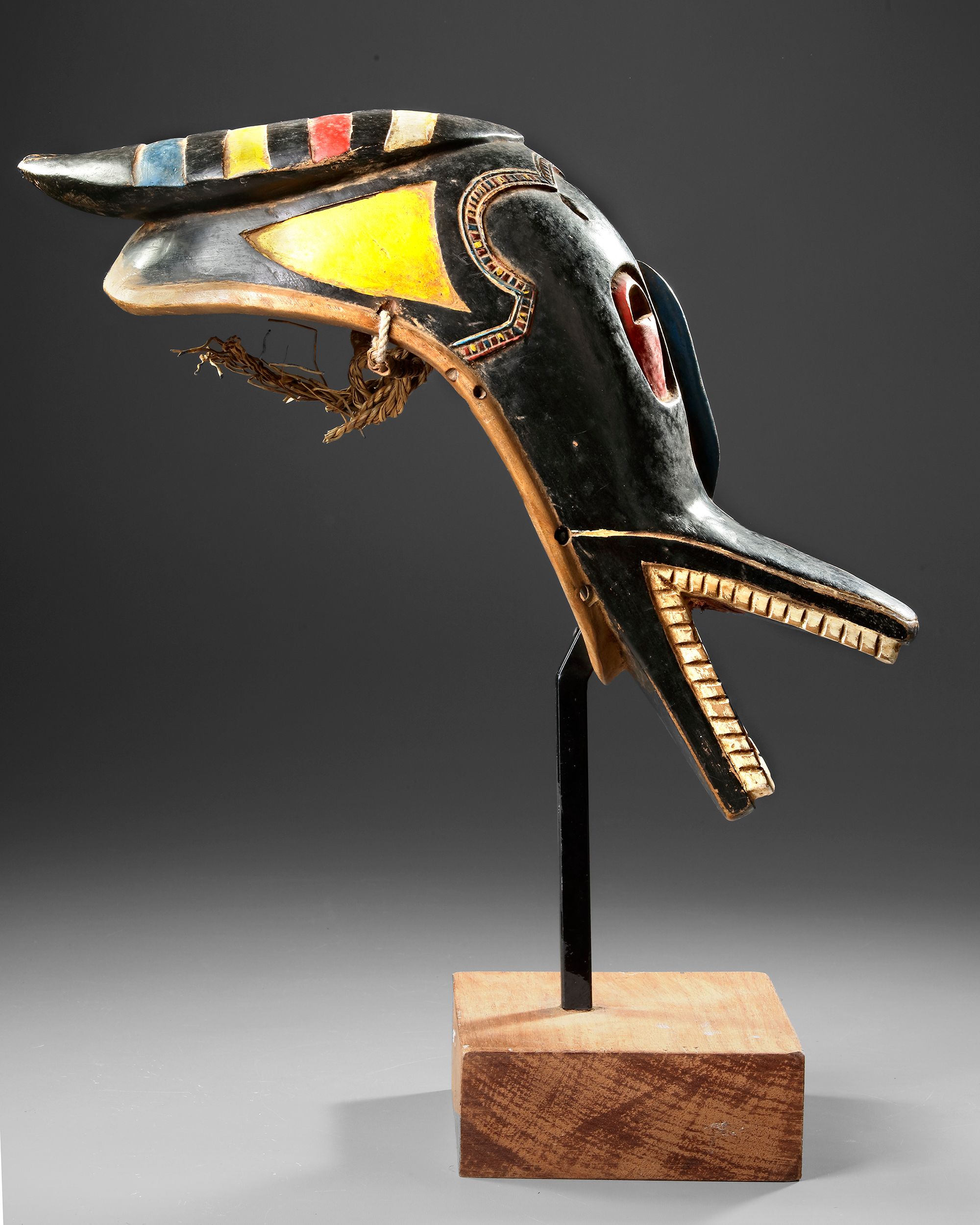 Height INVULLEN. wood, fiber, metal, pigments. Old indigenous repair. Custom made stand. Old collection number on the stand. The mask figure Zamble is part of the Goli dance ensemble. Expressive old mask. Old French collection.