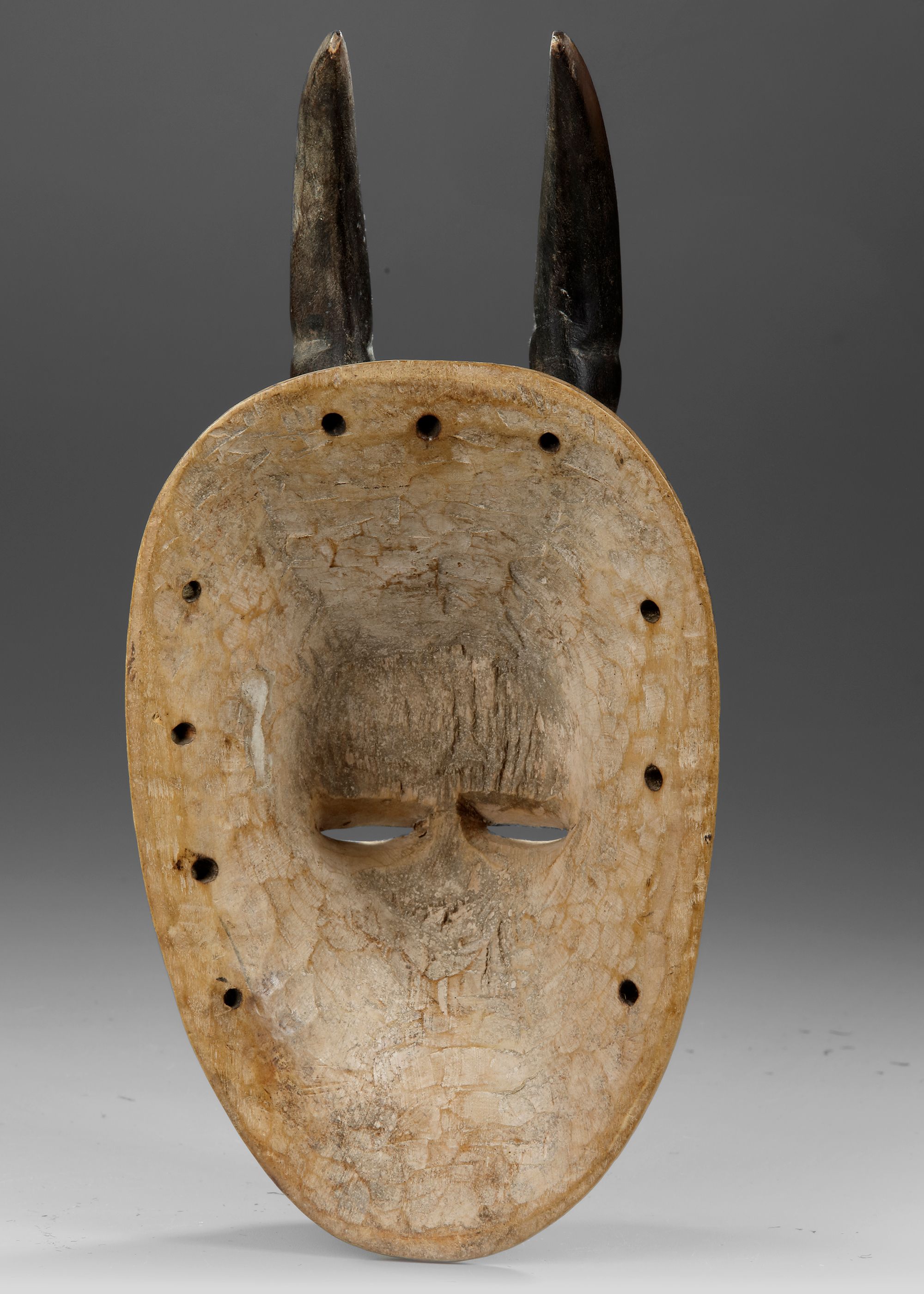 Wood. Small anthropomorphic mask with horns. Old French colonial collection, by repute collected 1950’s. The double ears, both human and animal, are very interesting.