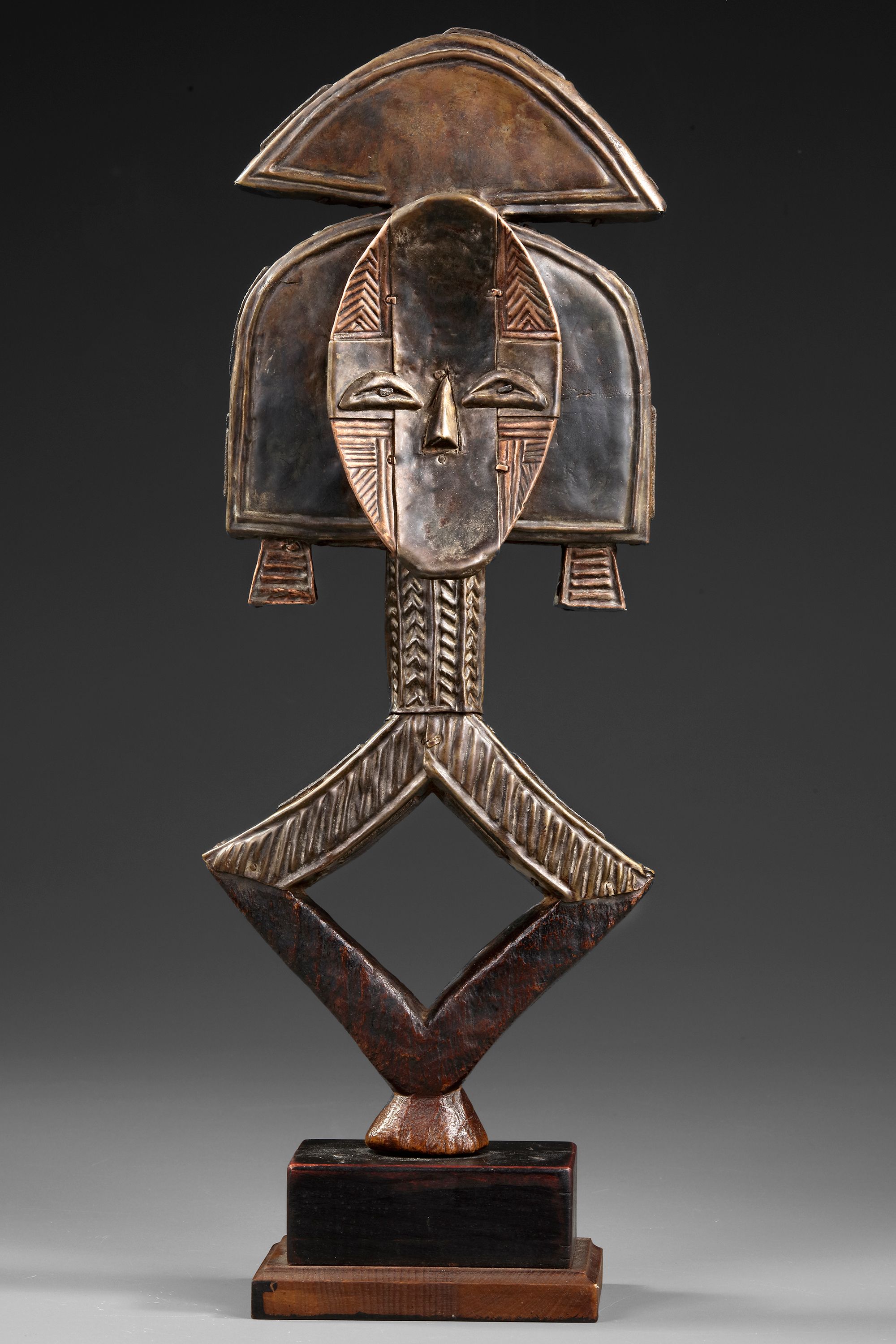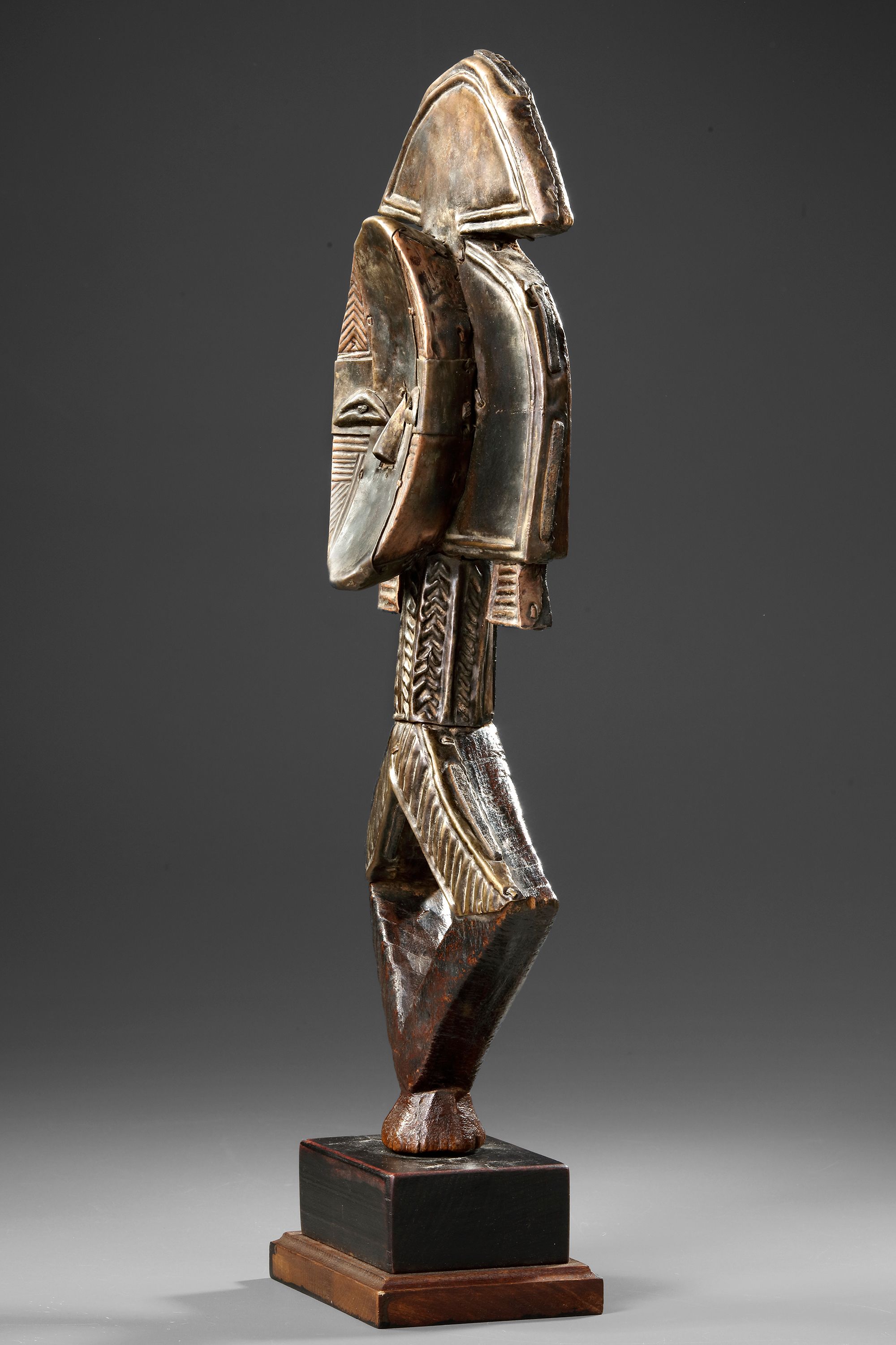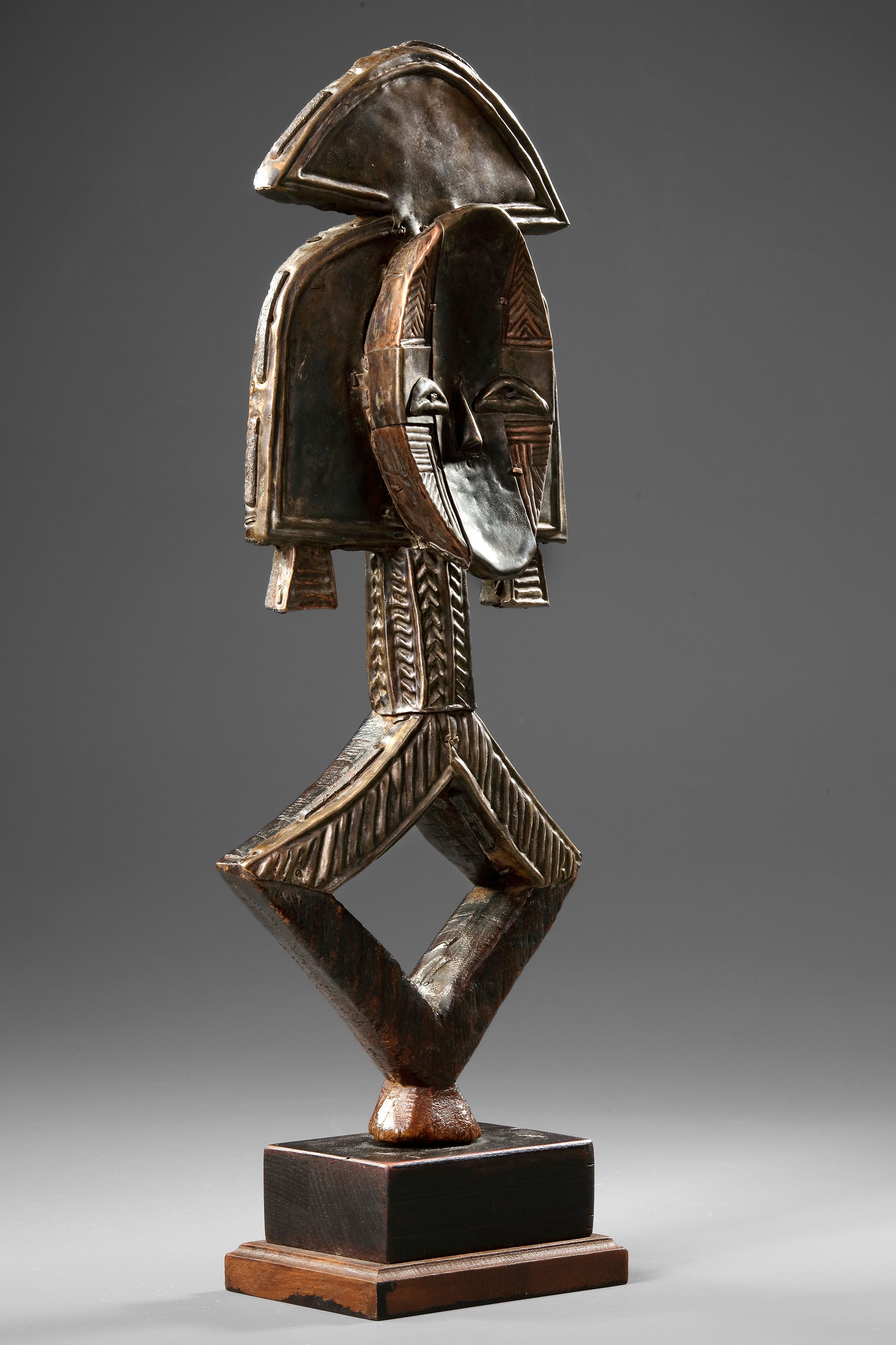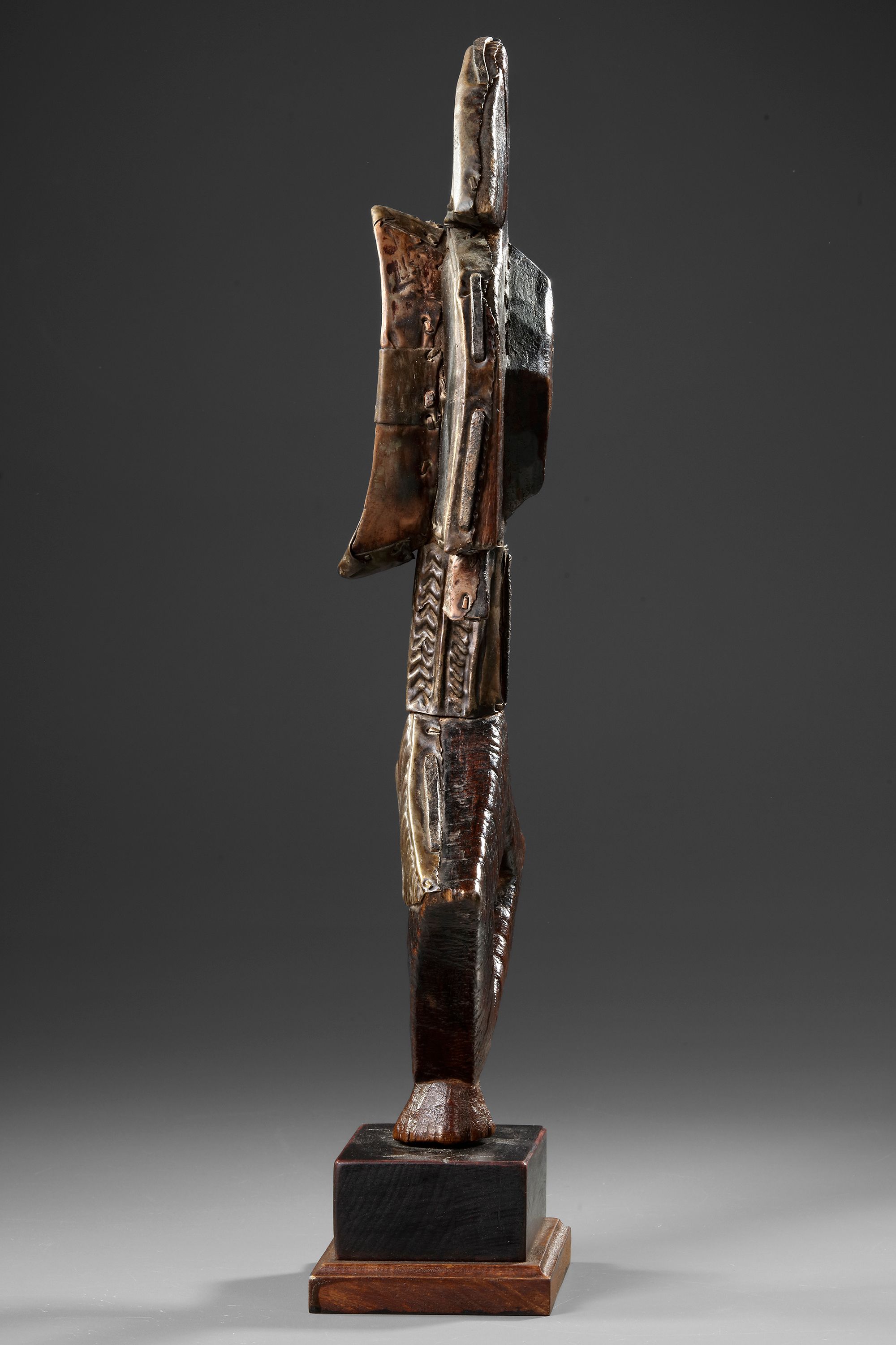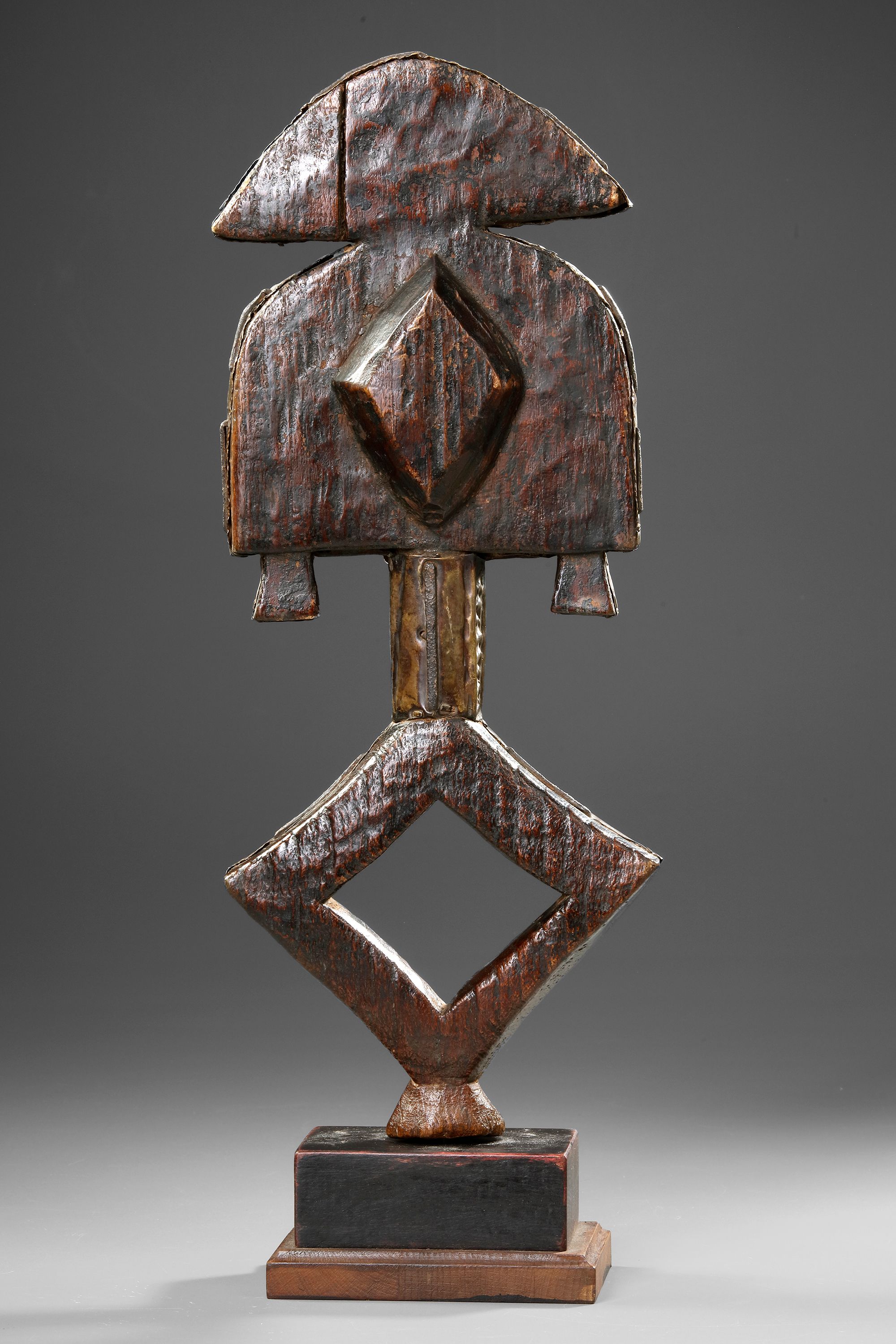 Wood, metal, base. Small sized figure with lots of presence. Beautiful deep patination, the shiny figures were cleaned after arrival in Europe. Expressive and well carved lozenge form on the back. Old French collection.