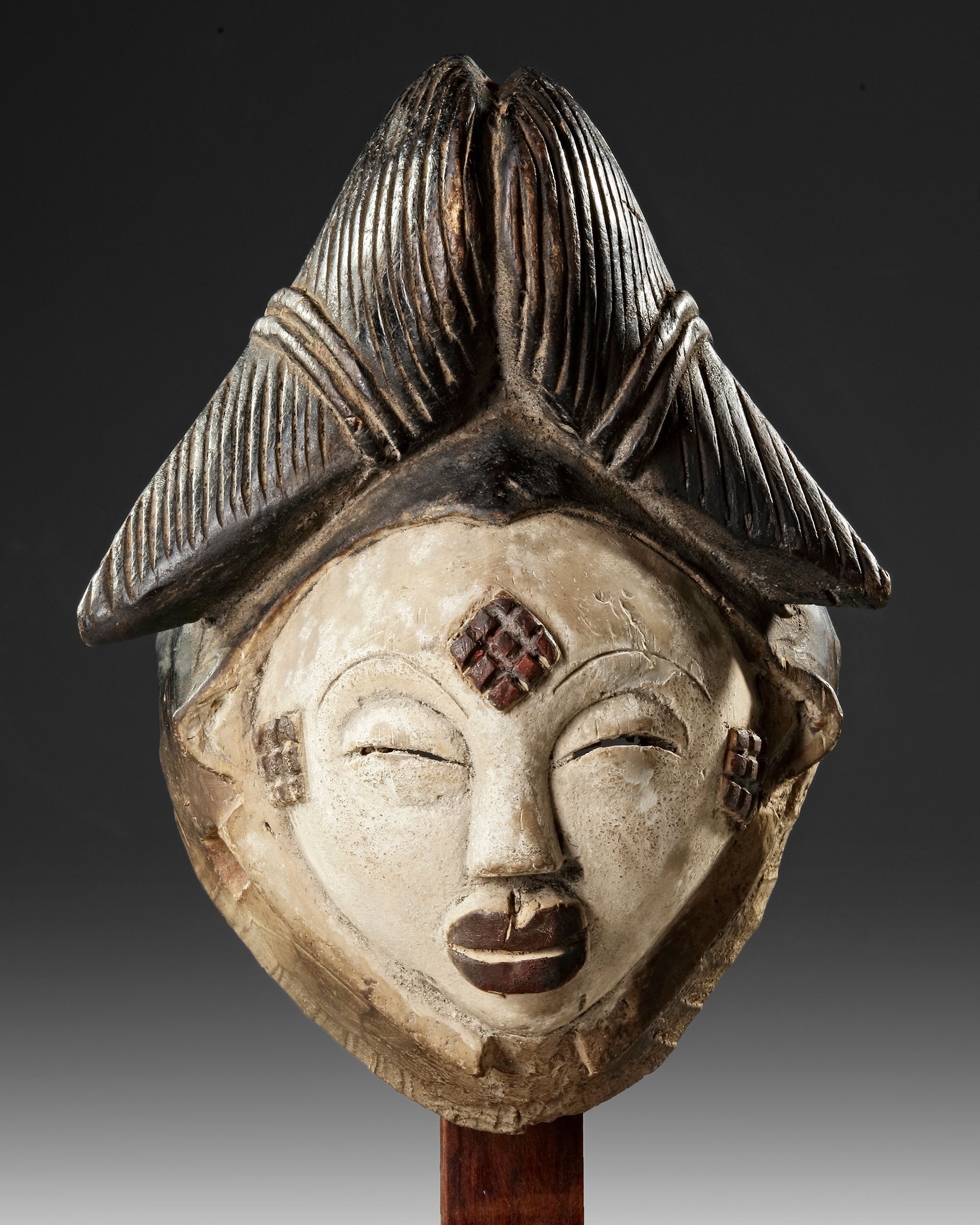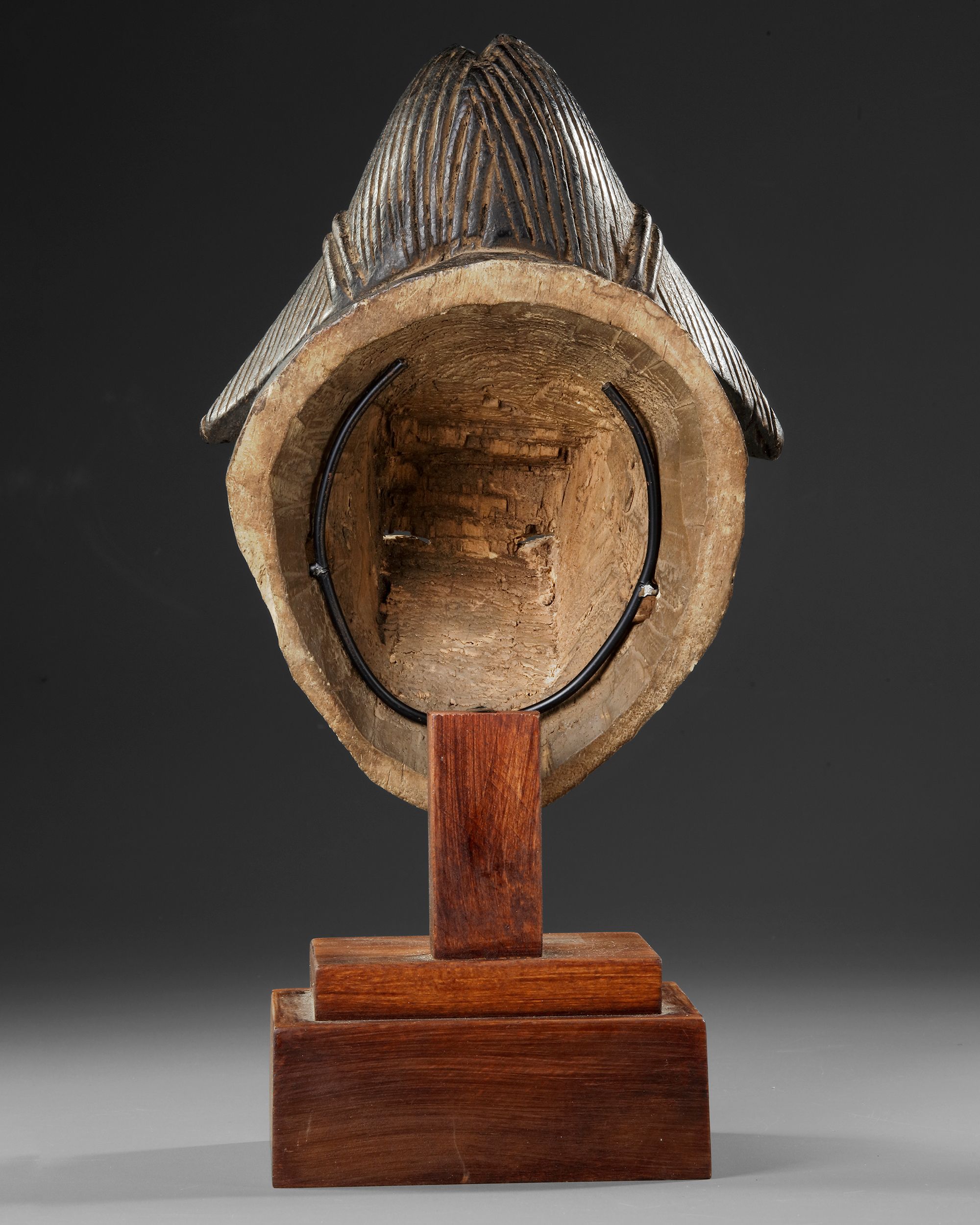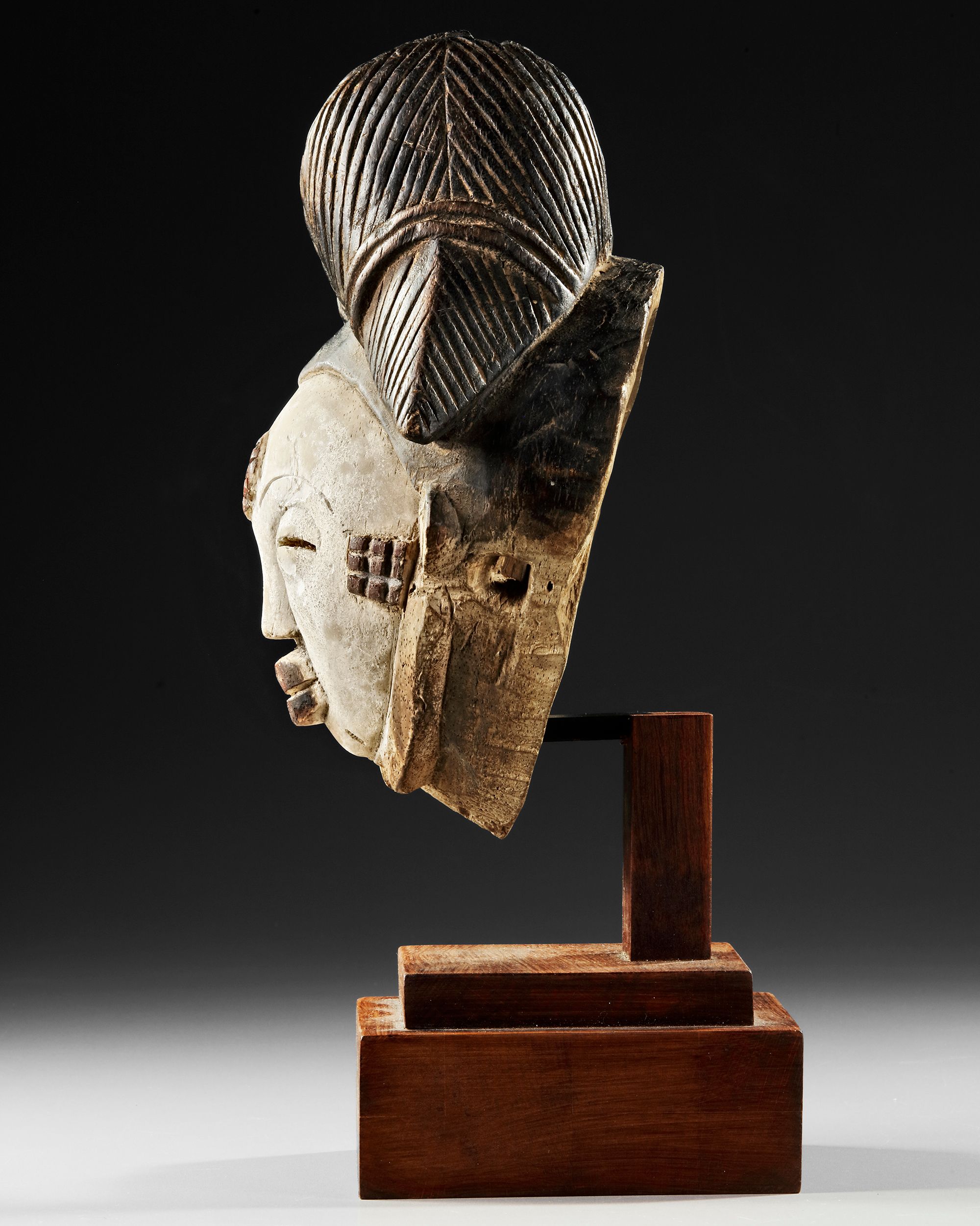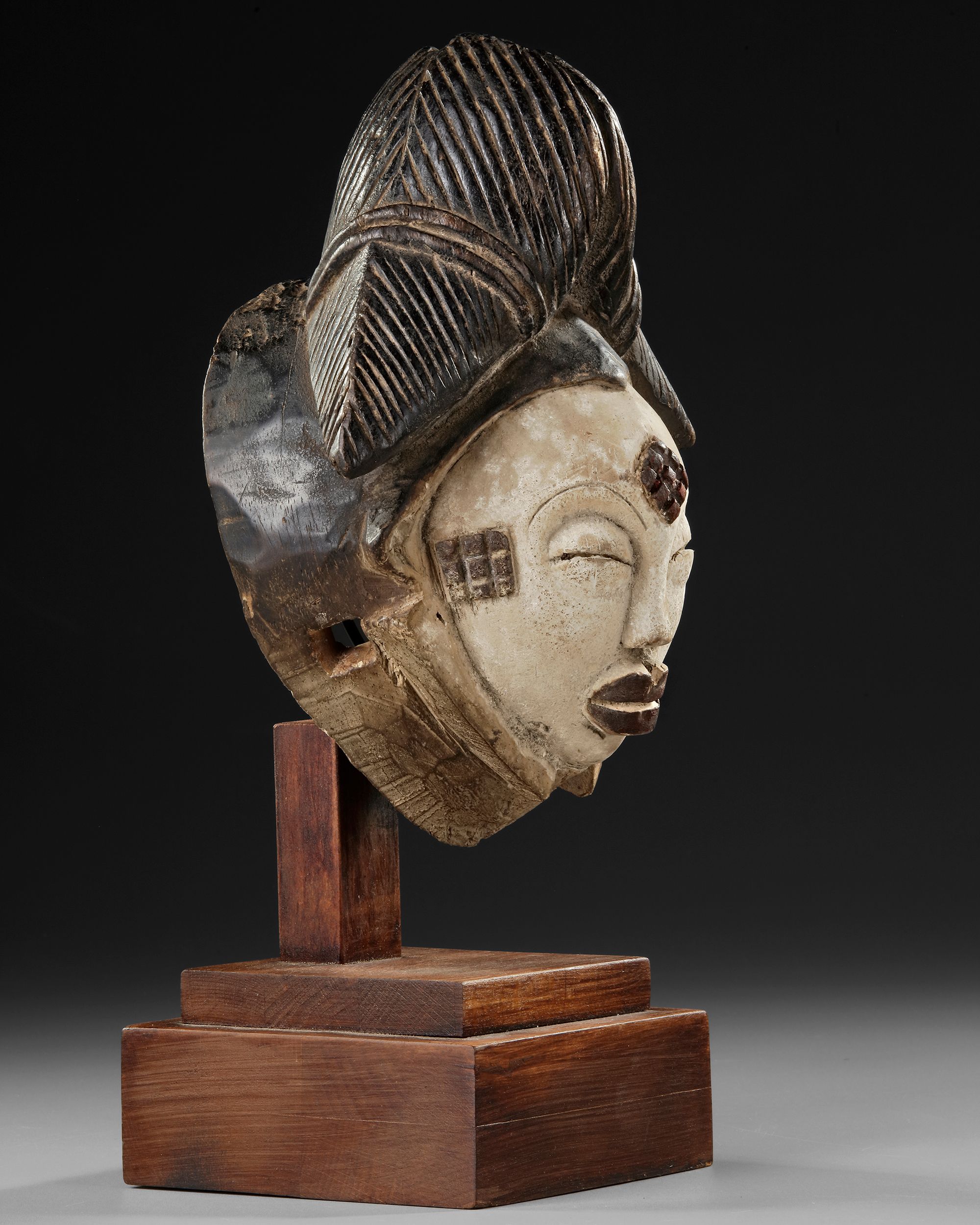 On a beautiful custom made stand. Wood, kaolin. Serene expression. Signs of use. Provenance: Old French collection. Height 29 cm.