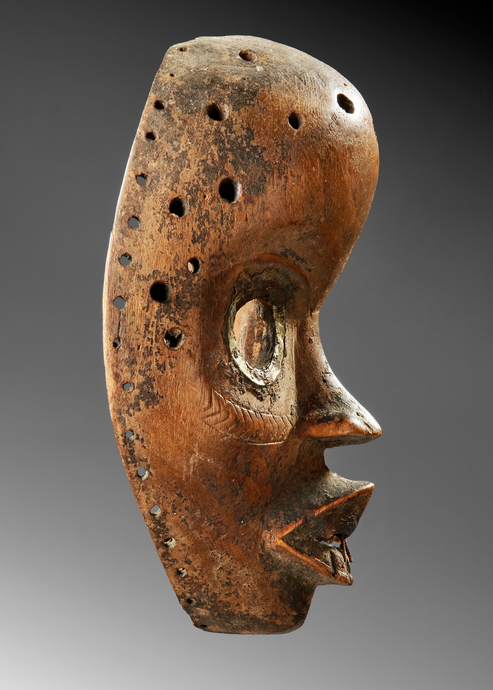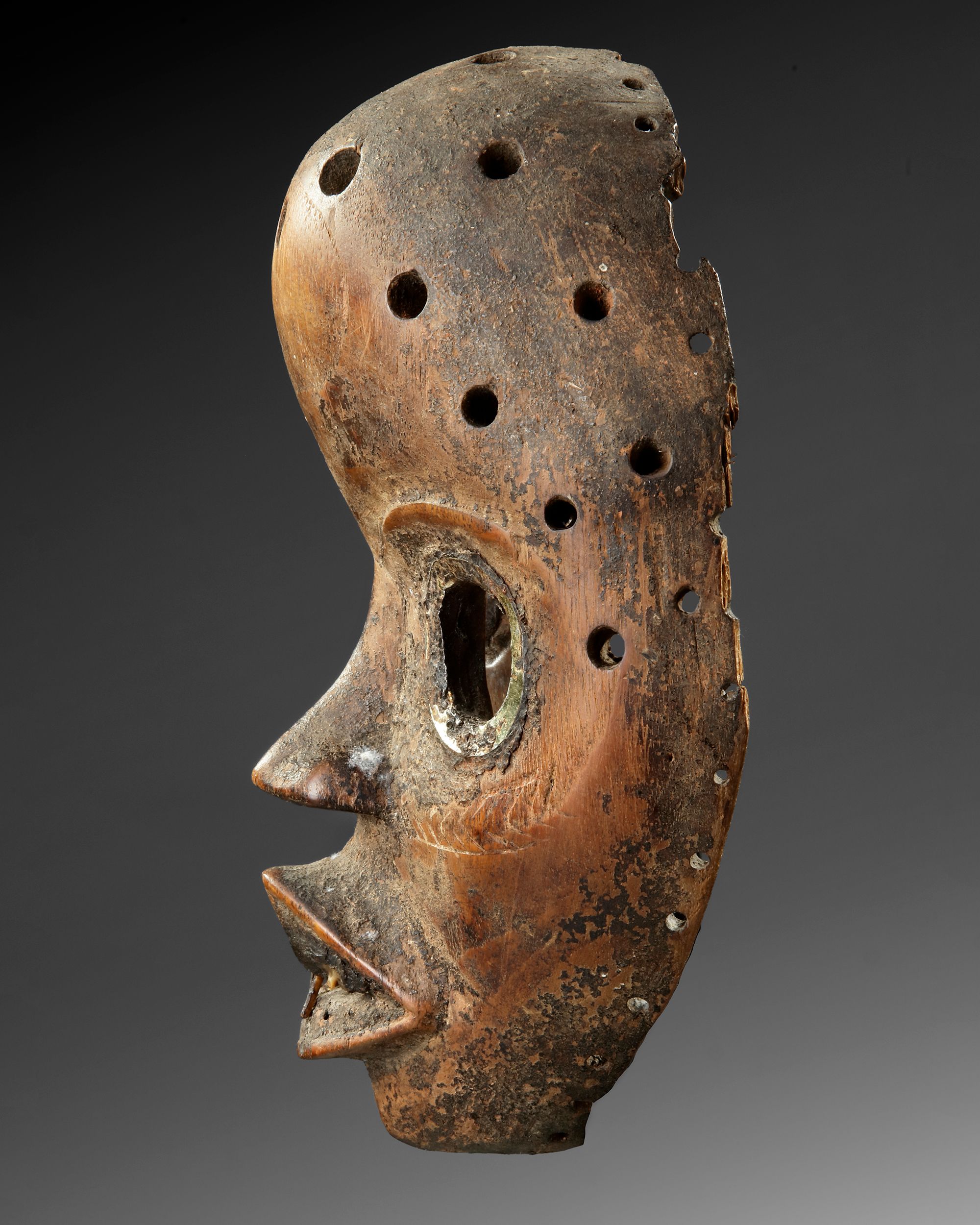Wood, metal, sacrificial patina, bone. Old collection number on the back. There is a small corpus of light colored Dan masks, see the AHDRC database of African Art. Excellent carving. Old Dutch collection.