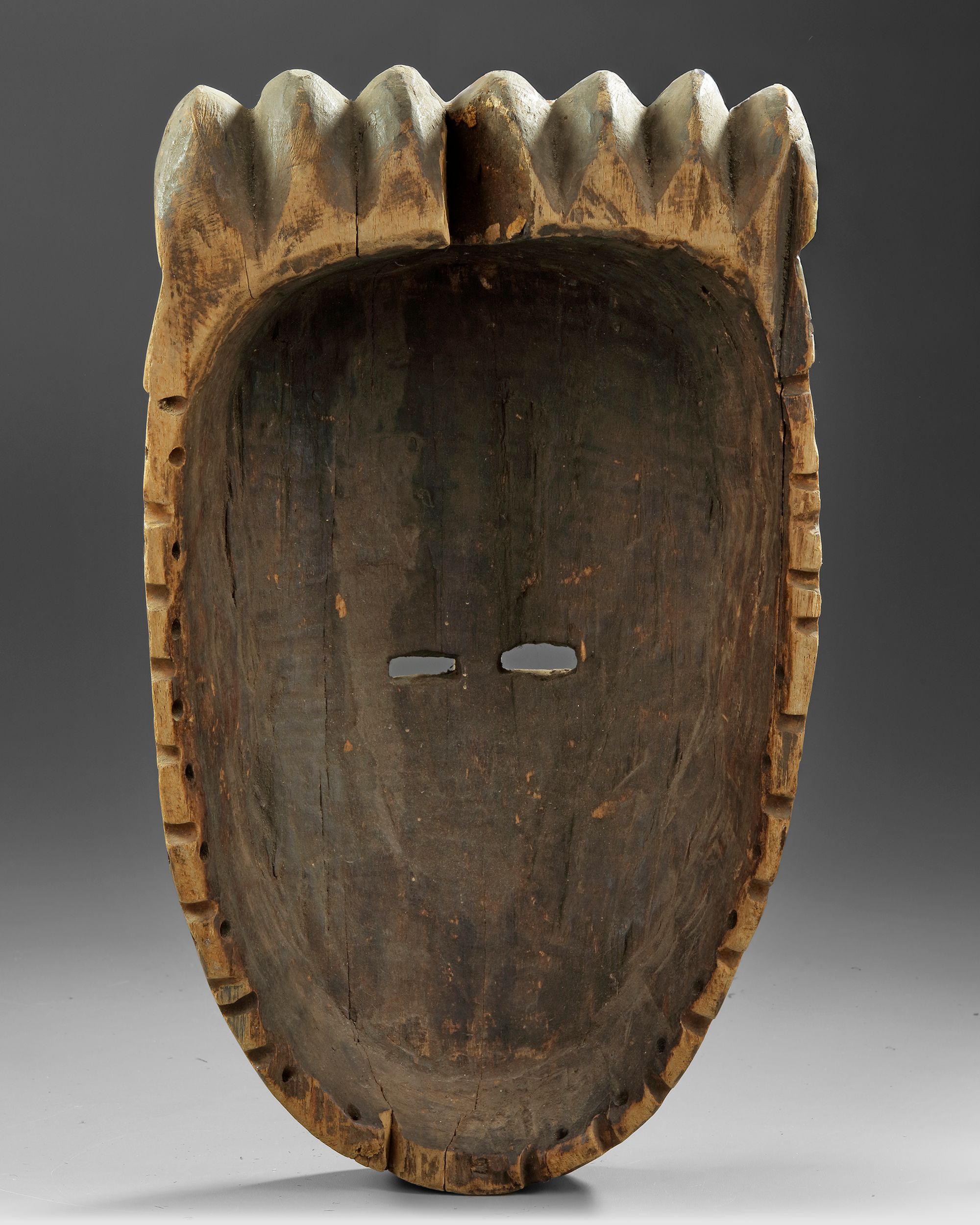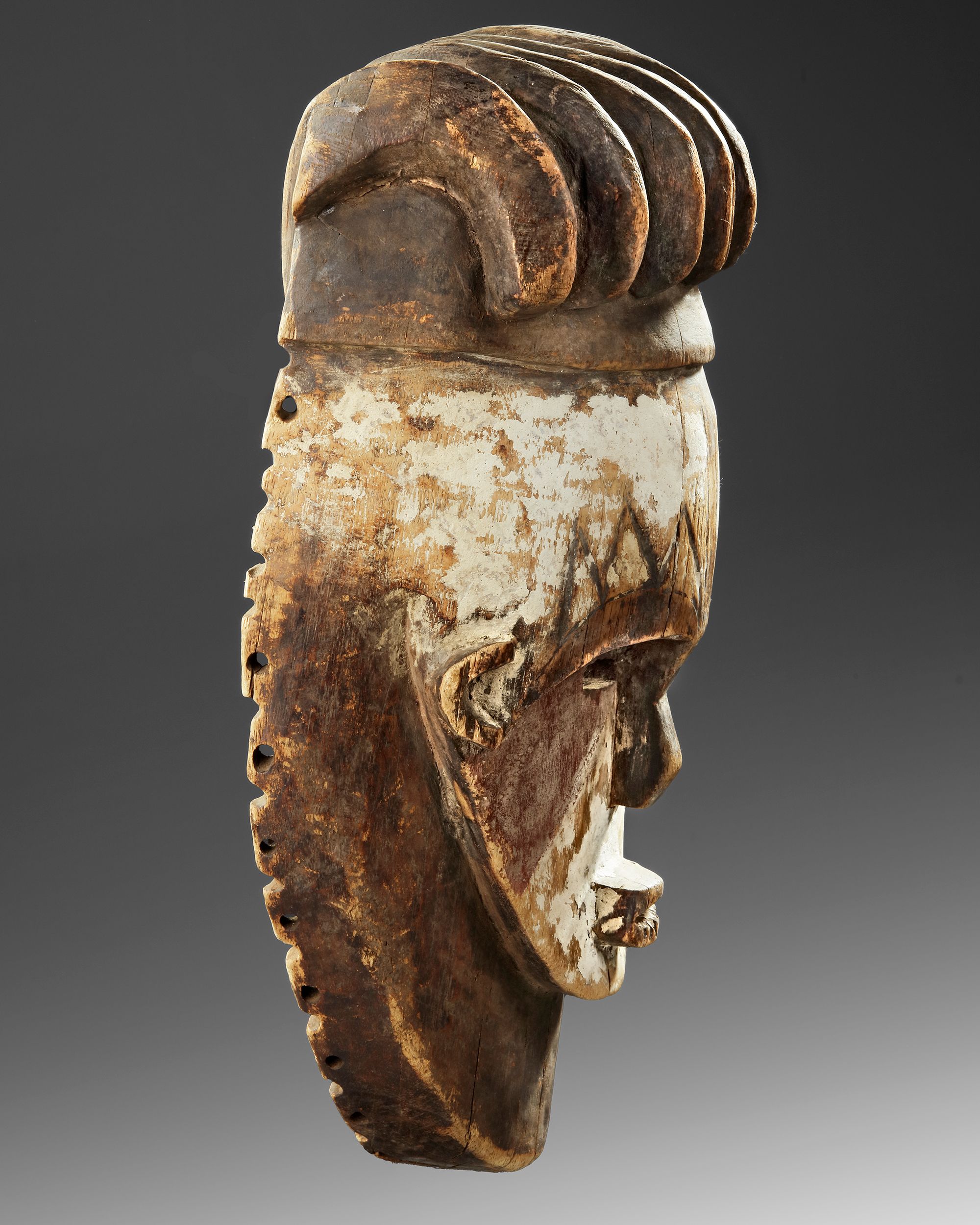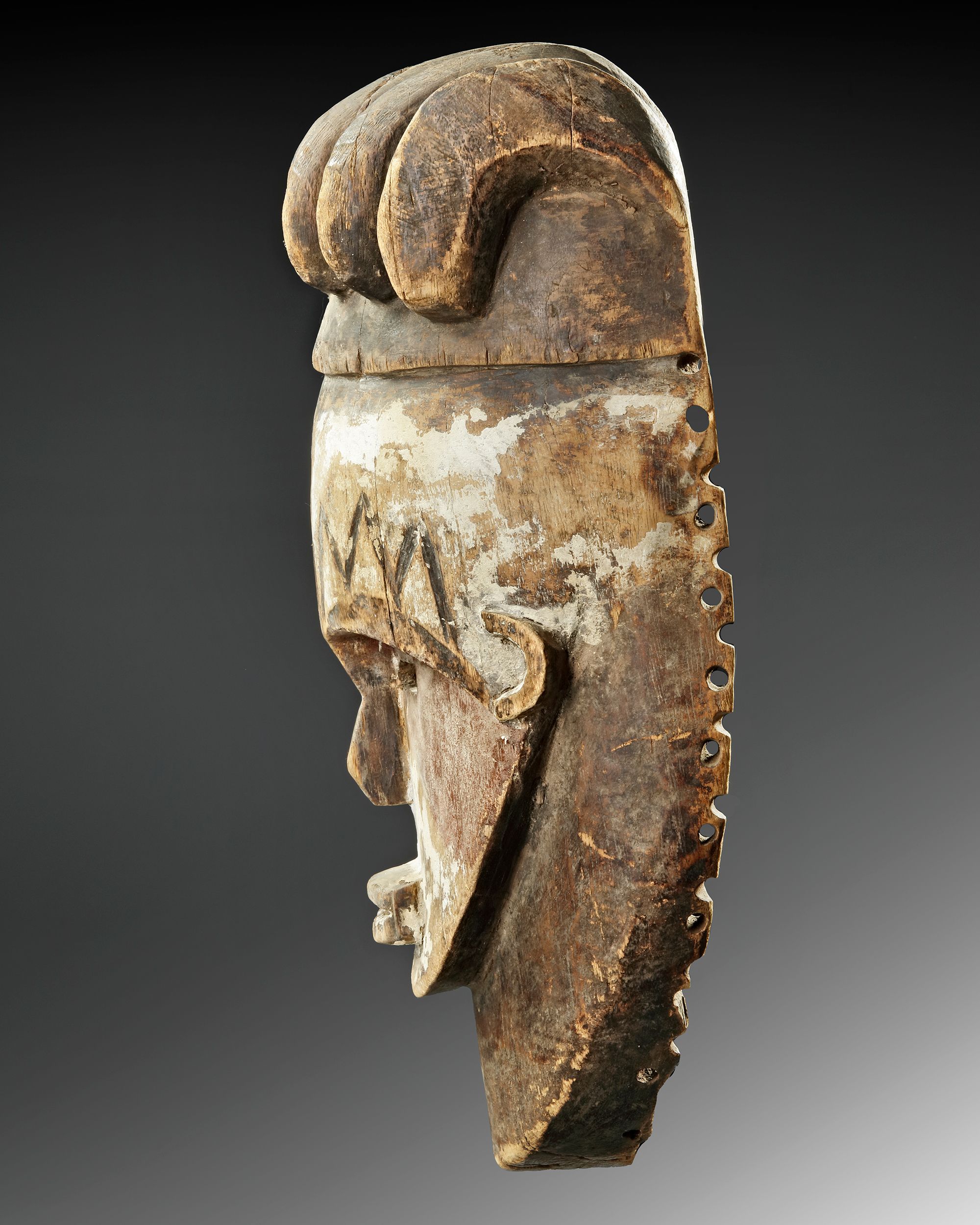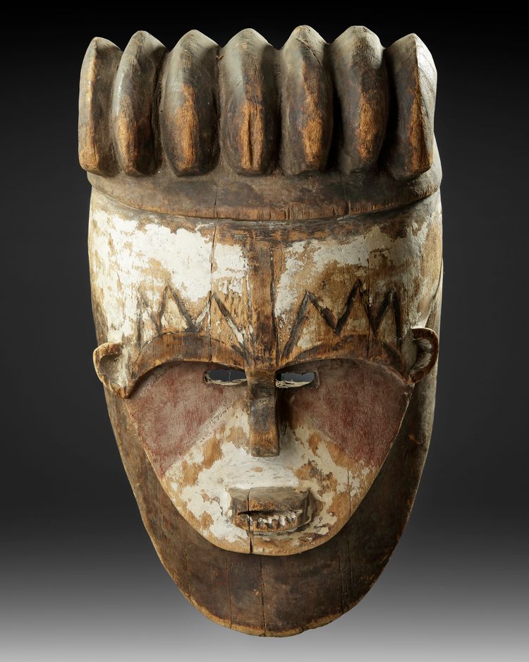 Kaolin, pigments, pokerwork. There are several Fang masks in the AHDRC database of African Art which share characteristics with this one. There is one very similar, AHDRC 0050926, which is in the collection of Museum Dapper, Paris. Our mask however is the better one. The Dapper mask is listed as Vili, from Gabon, but the treatment of the eyes and nose makes this unlikely. The lower end of the Dapper mask is obscured by a plant fiber beard, in our mask there is a concave end which makes an attribution to Fang more likely, as do eyes and nose. There is considerable idiosyncrasy in Fang masks, making it sometimes difficult to assign a specific cultural function to a specific type of mask, as is the case here. Very rare and impressive mask. Old French collection. Height 37 cm.