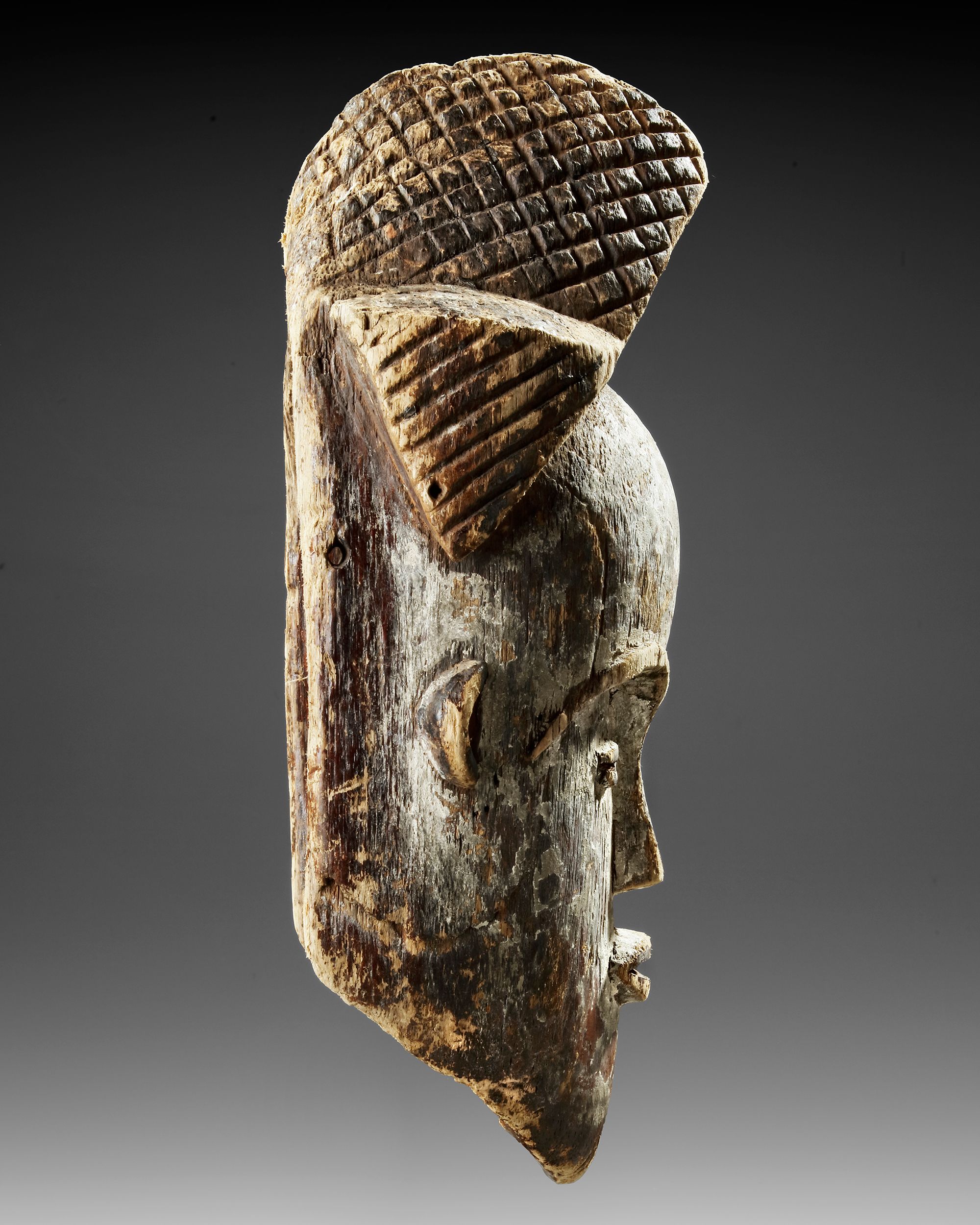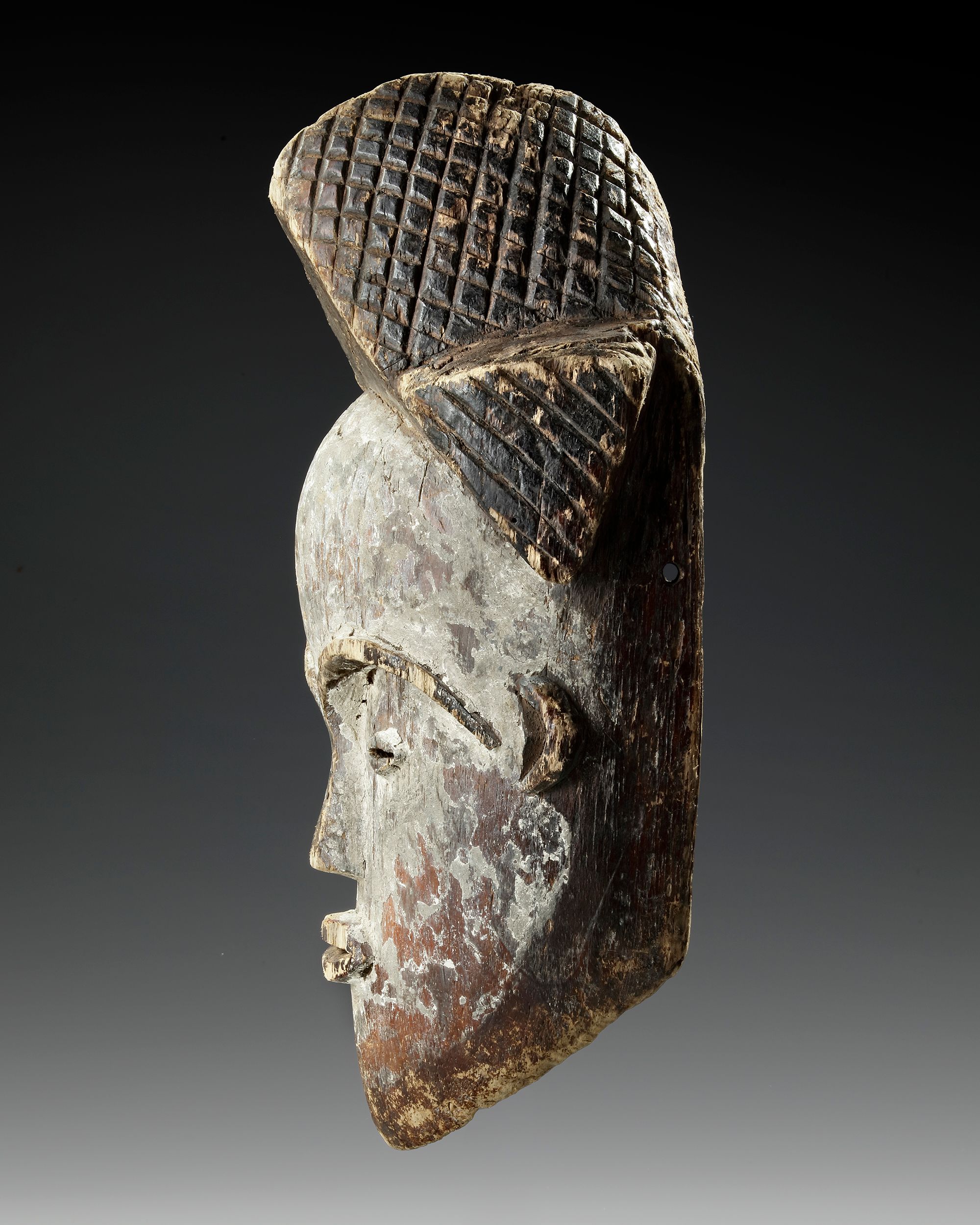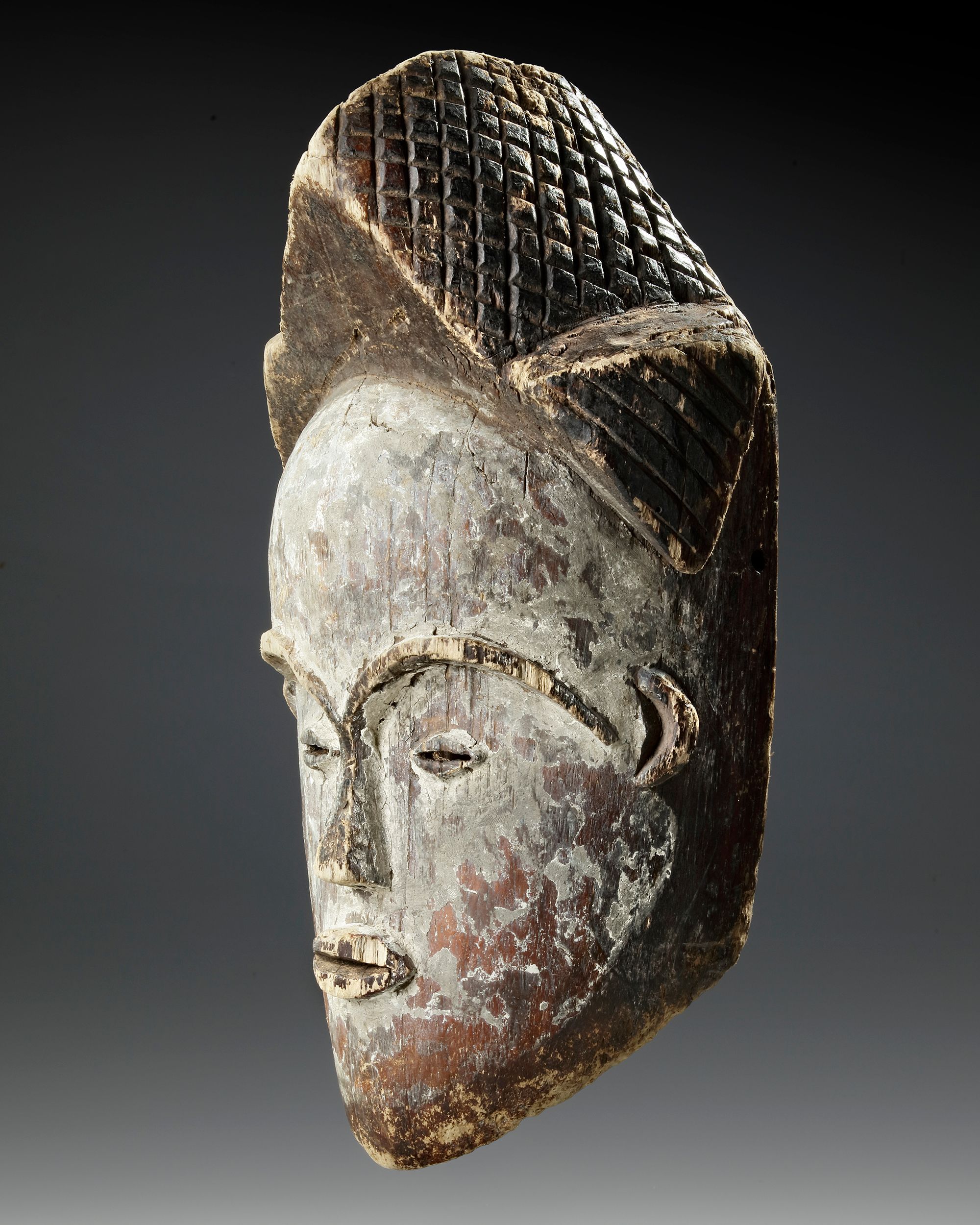 In the tradition of ‘white faced’ Okuyi masks. There is a similar mask depicted in Ancestral Art of Gabon (1985), Louis Perrois, then in the Rietberg Museum. Rare type. Wood, kaolin. Signs of use. Old Belgian collection.