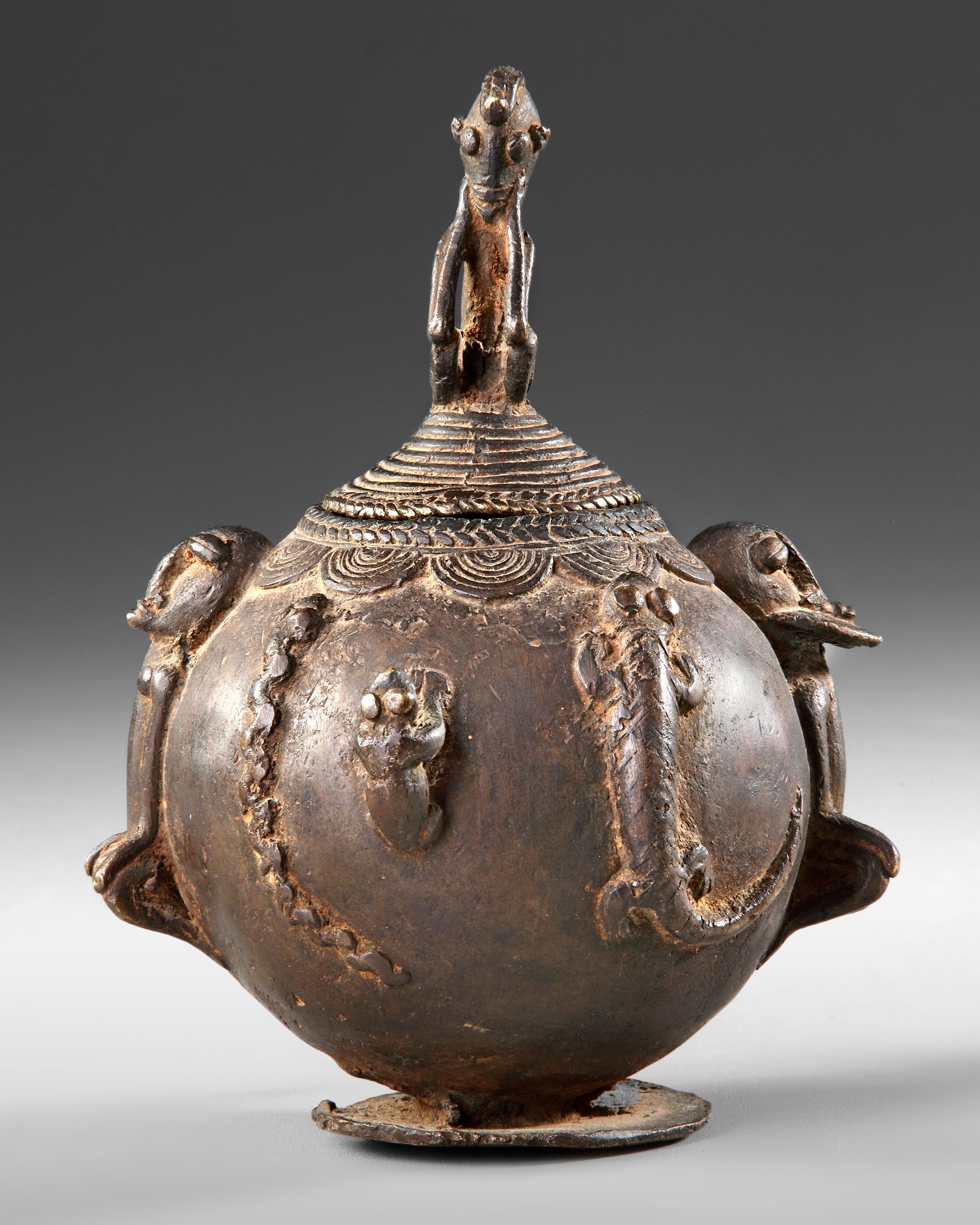 Bronze. Excellent and expressive casting. Evocative figure on the lid with very clear lines. Wonderful 3D figures on the sides. Old Dutch collection.