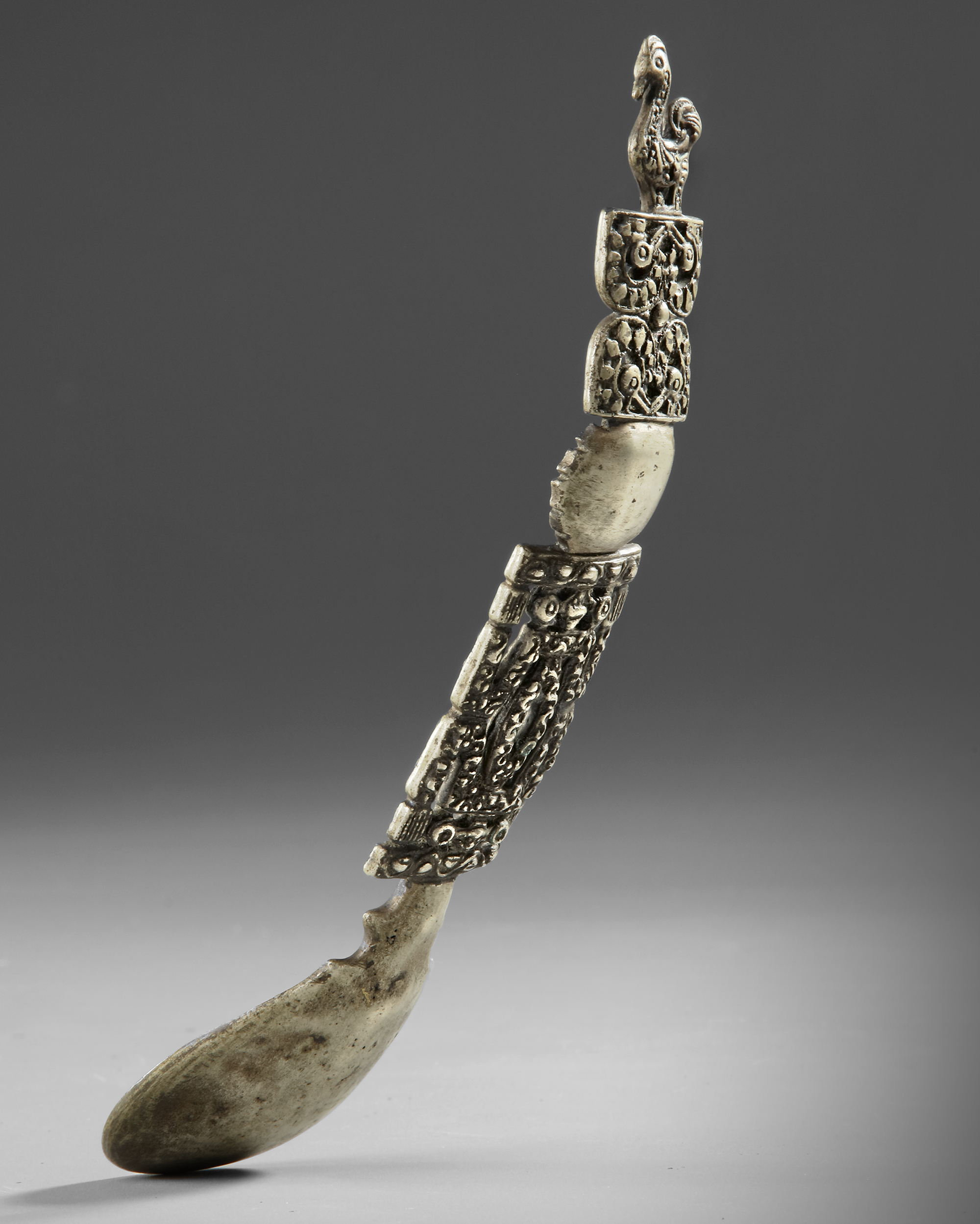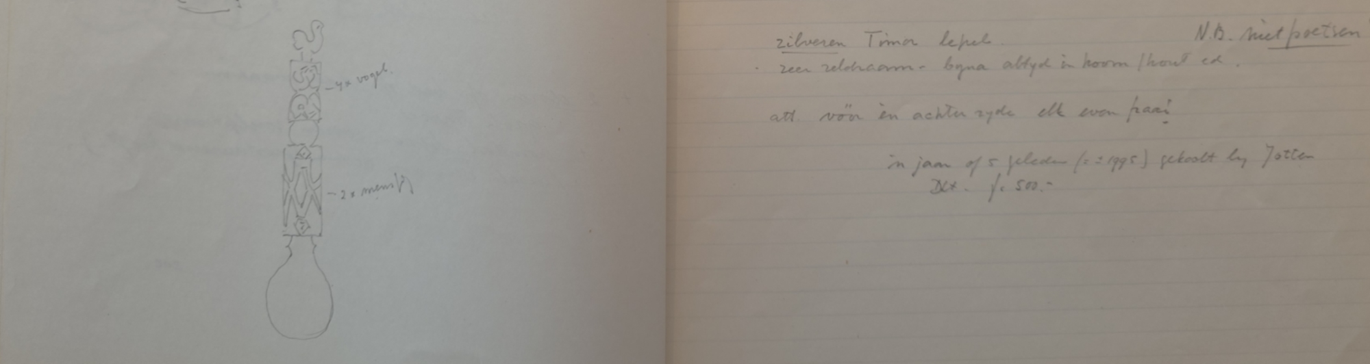 Timor. Low grade silver spoon collected by Jac Hoogerbrugge. See his drawing and collection notes. Hoogerbrugge notes: Timor spoon in silver. Very rare. Do not polish. Bought from father Jötten Msc. around 1995. Father Jötten was a member of the Congregation of the Sacred Heart (Tilburg), based in Djakarta. He was responsible for shiping all by the congregation collected tribal art tot the Netherlands. Hoogerburgge paid f. 500,= Length : ca. 20 cm.