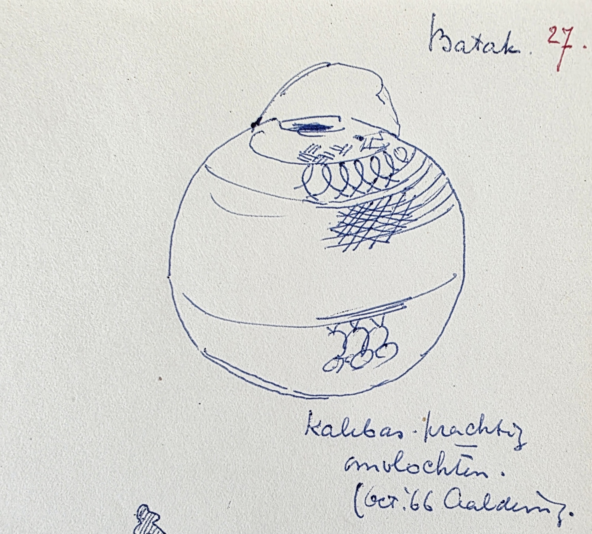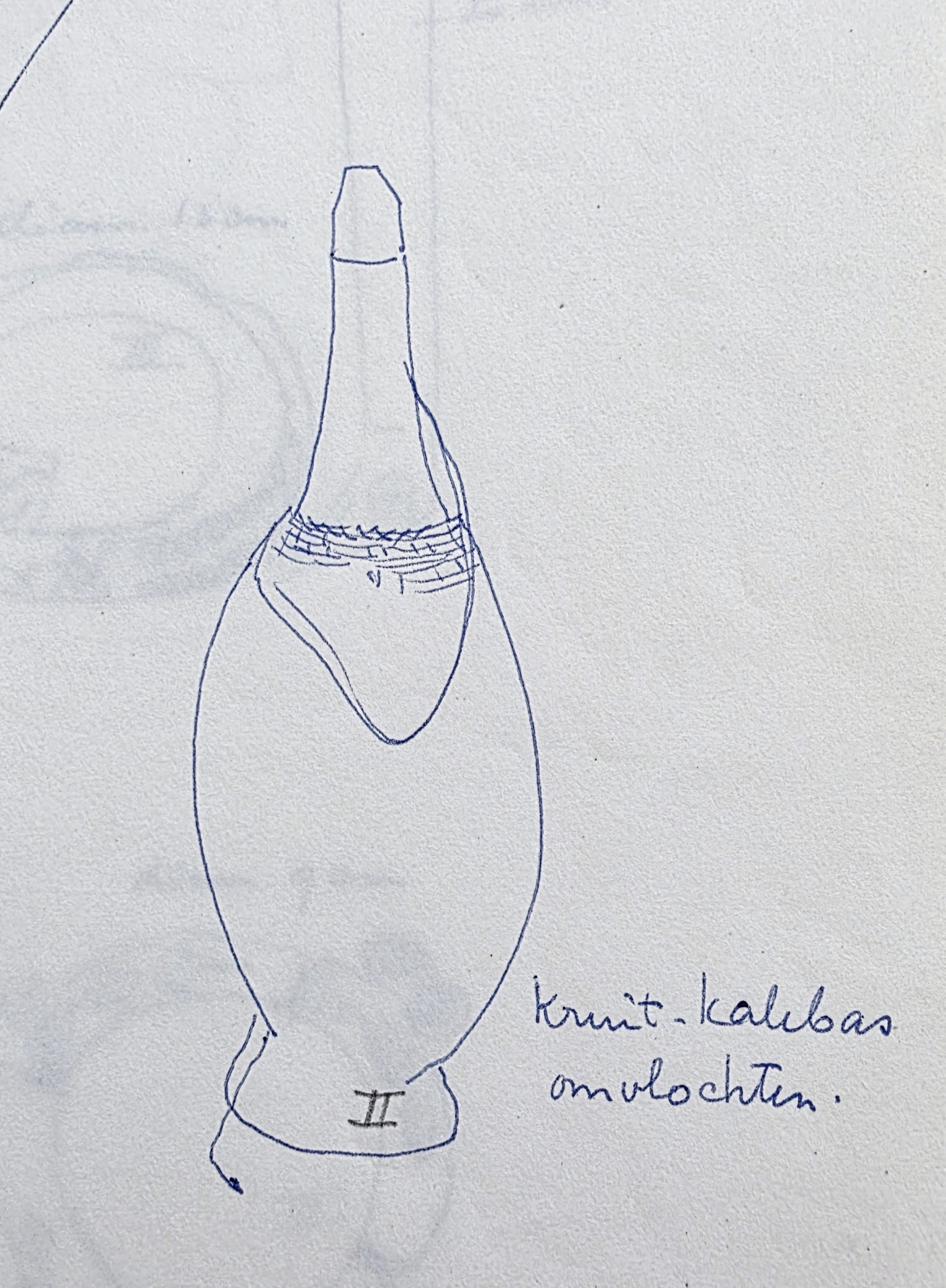 Sumatra. Collection of Batak containers. All collected by Jac Hoogerbrugge in the 1950’s and 1960’s. Among these a gourd, wonderfully plaited, which Hoogerbrugge bought from Aalderink in october 1966 and a plaited gourd gunpowder flask. 1. H. 29 cm. and d. 19 cm. 2. H. 14 cm. and d. 12 cm.