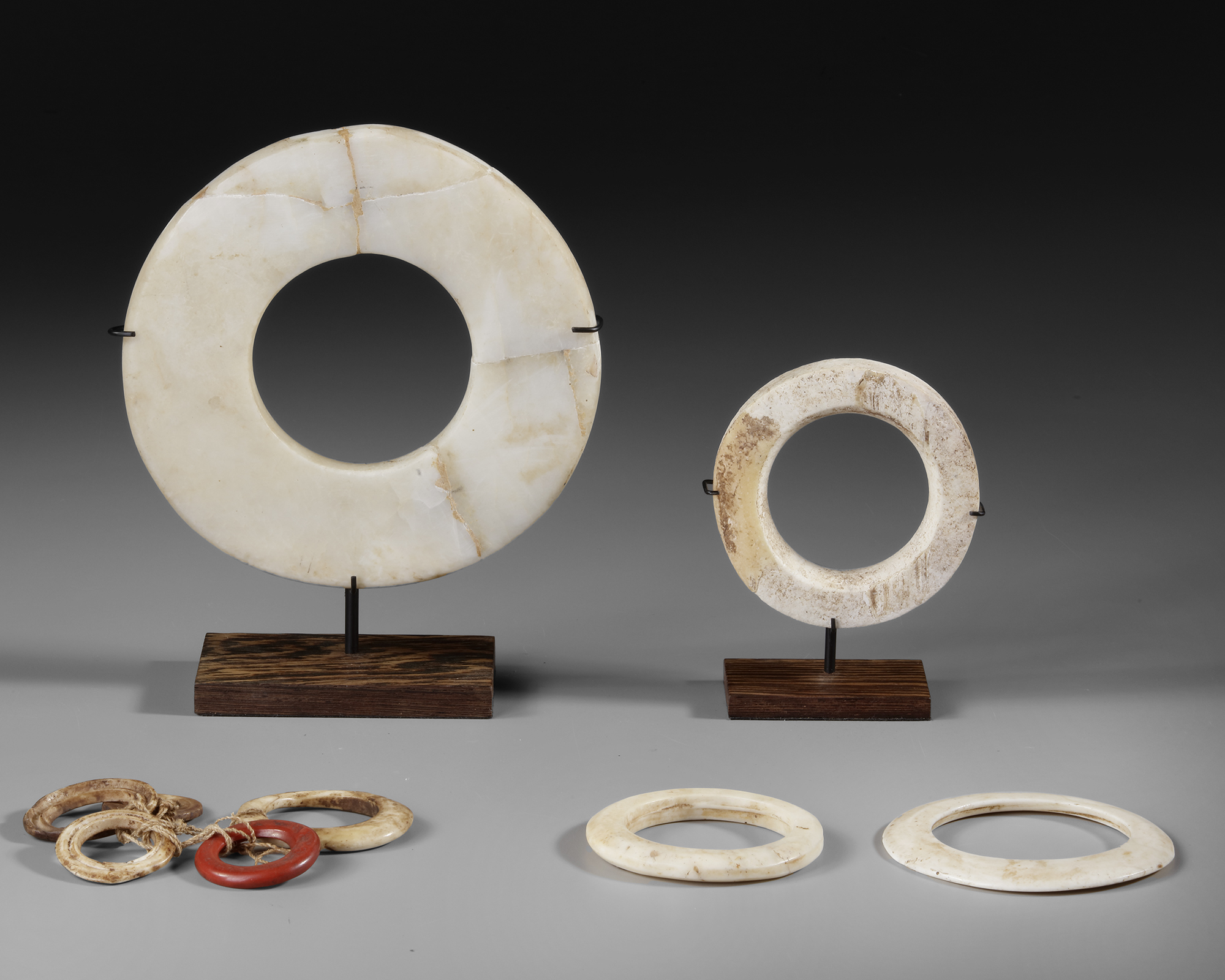 Small collection of fossil Tridacna shell valuables. Two rings on custom made stands from the Solomon Islands, provenance Koos Knol. Two Abelam rings collected by Jac Hoogerbrugge in the 1960’s and a bunde of shell and porcellan money rings. Between : D. 18 and 6 cm.