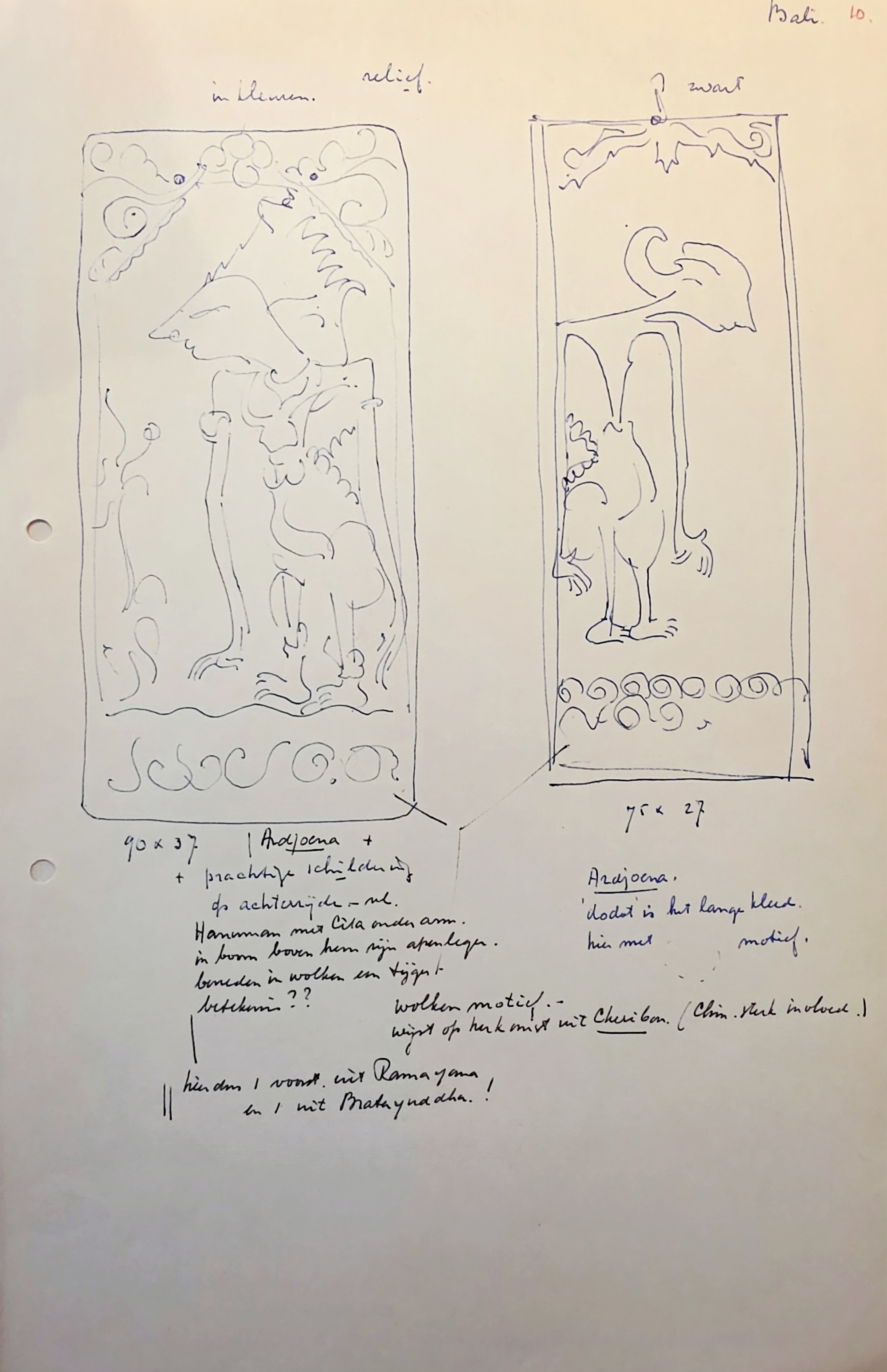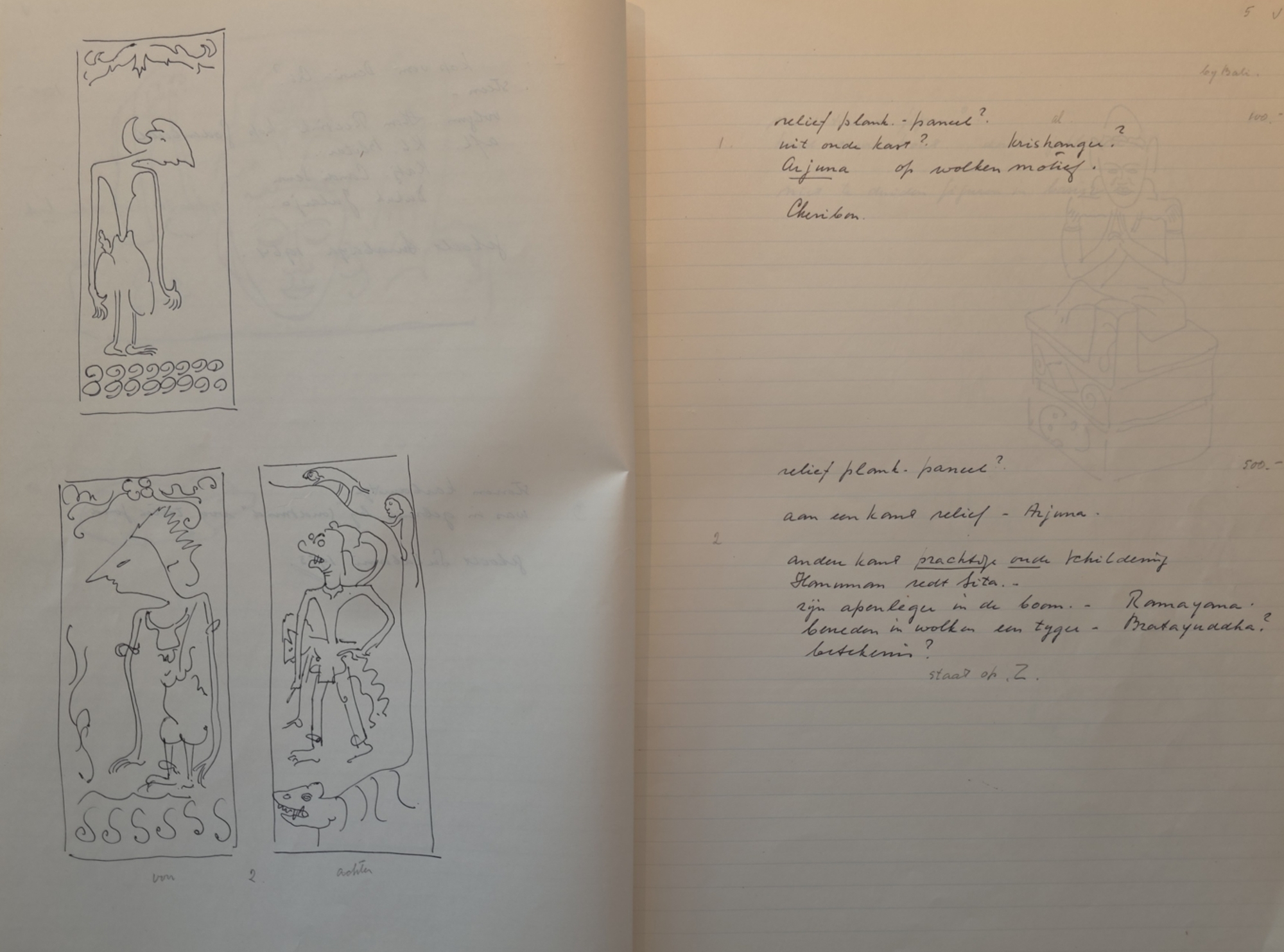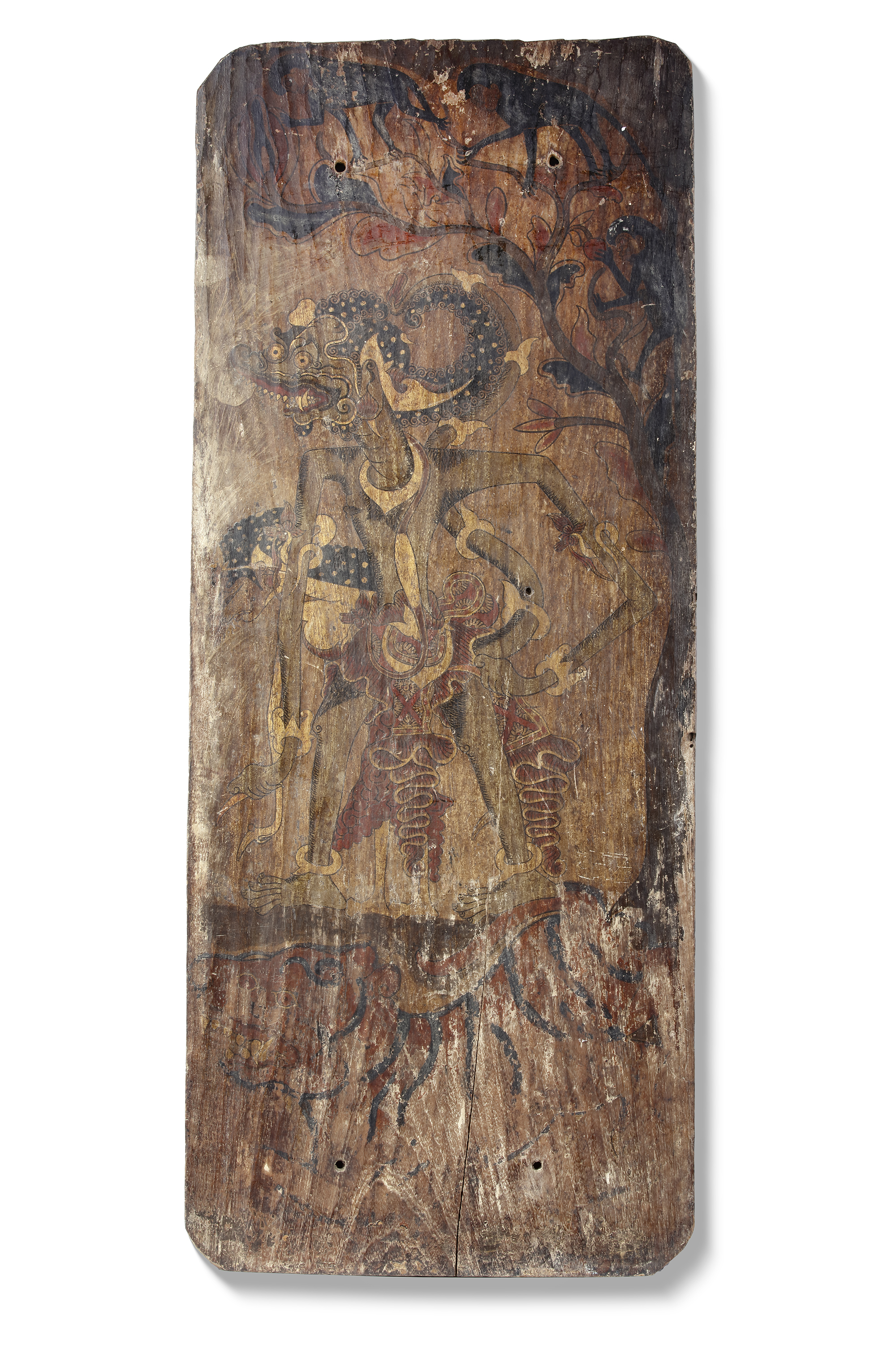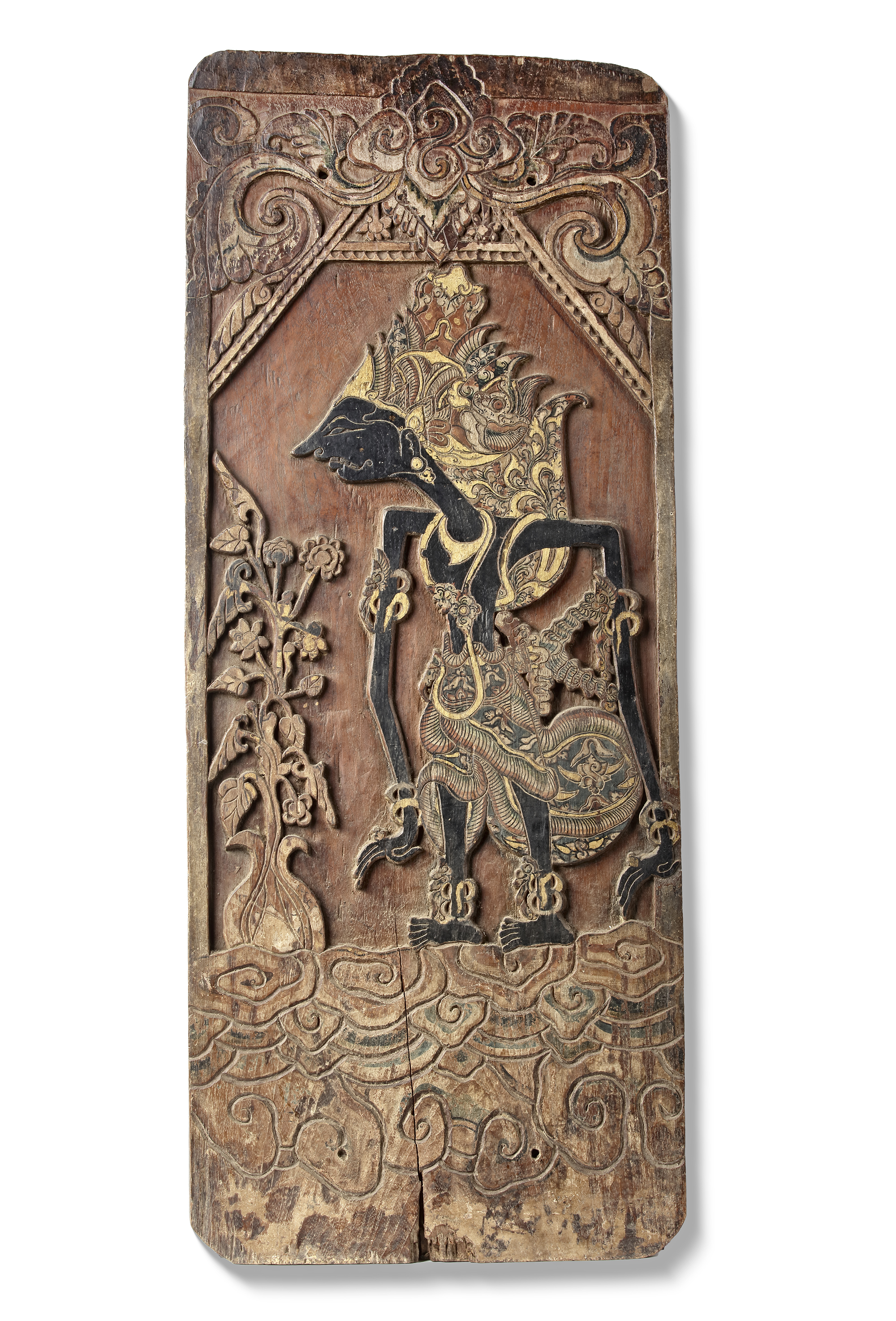 Java. Relief panel with painting on verso collected by Jac Hoogerbrugge in the 1950’s. Depicting Arjuna. On verso painting of Hanuman saving Sita. See drawing and collection notes by Hoogerbrugge.