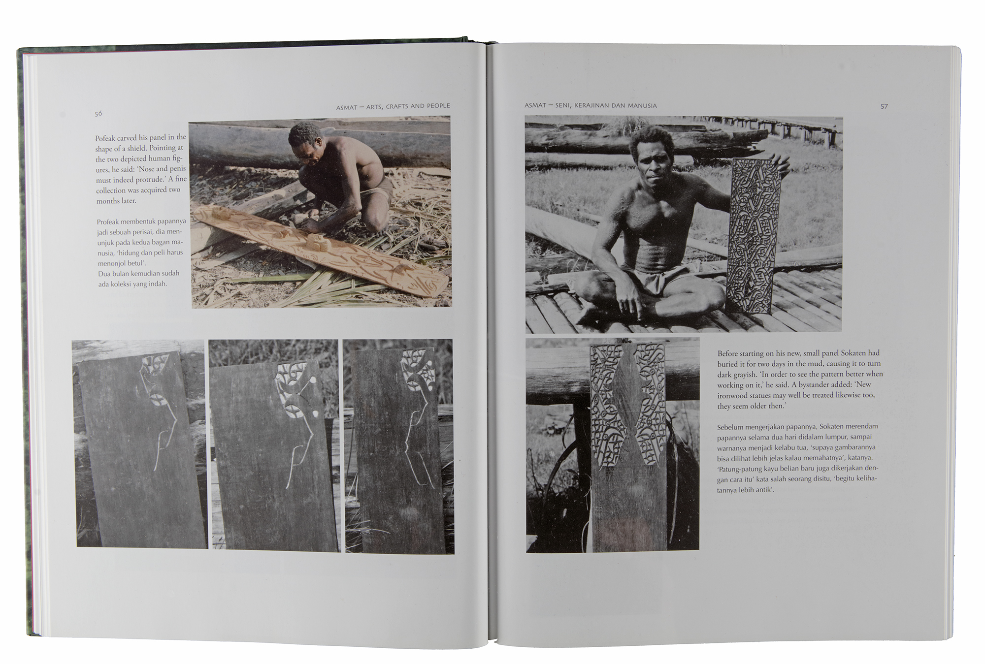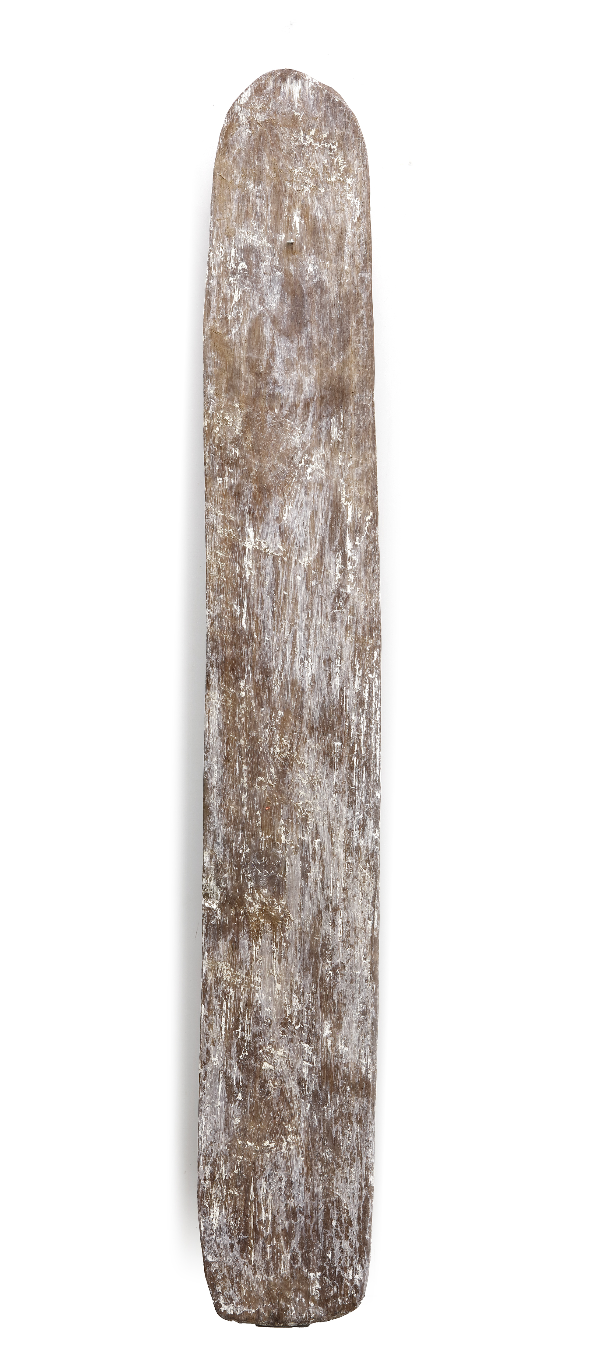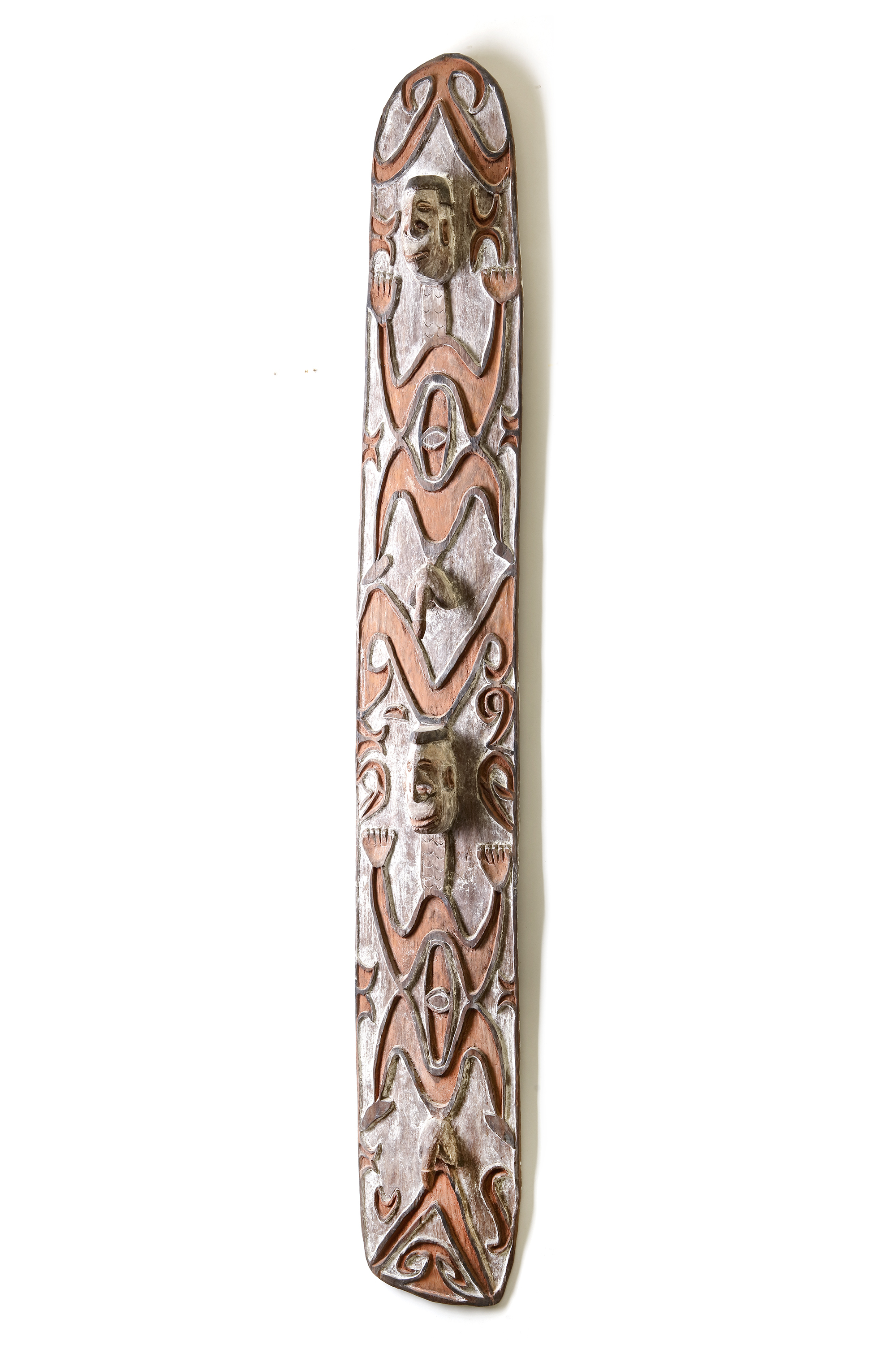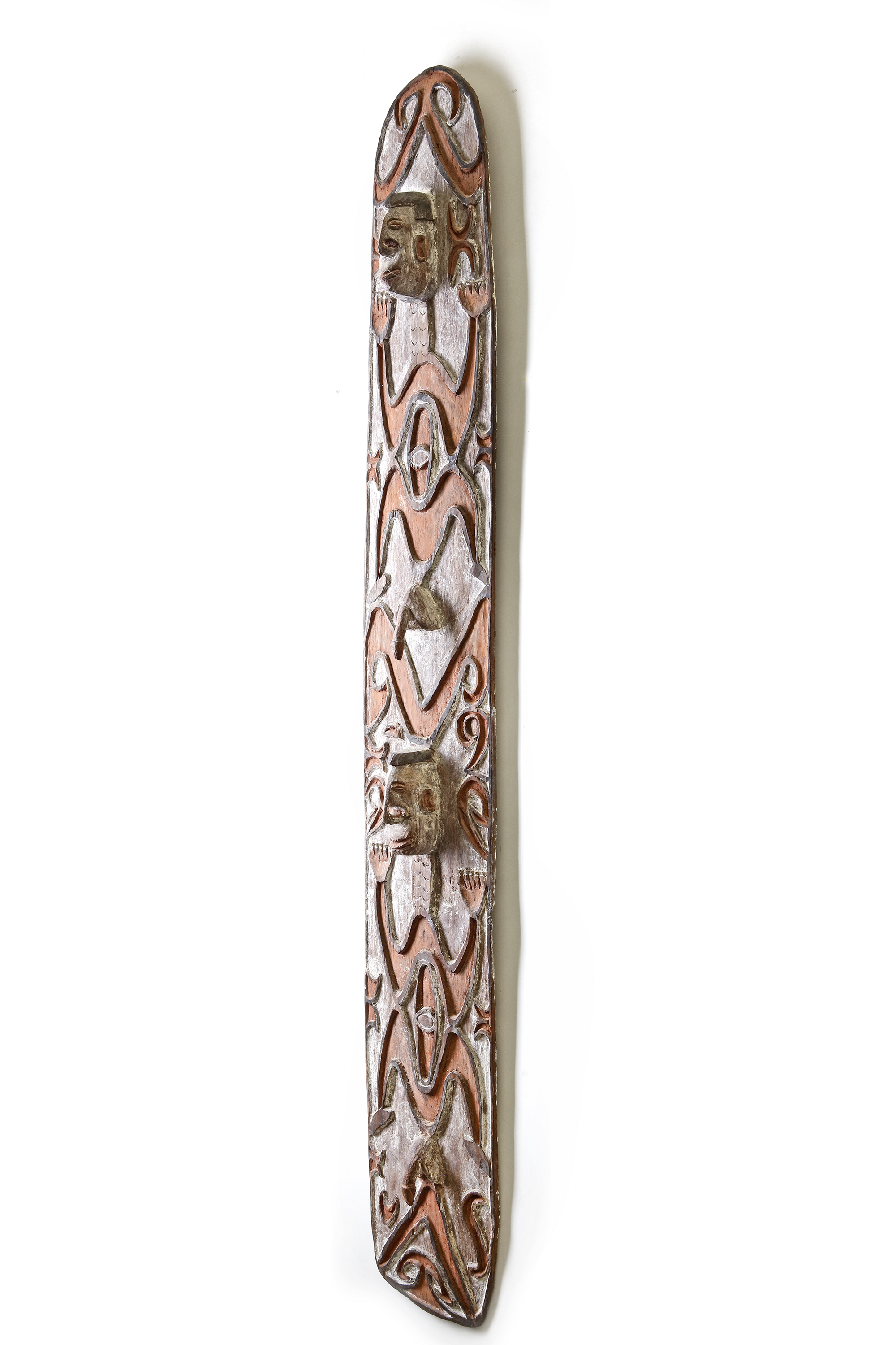 Asmat. Carved panel collected by Jac Hoogerbrugge in the 1970’s. Depicted as a work in progress on the cover and page 56 of the book “Asmat by Jac Hoogerbrugge”. Hoogerbrugge writes: “Pofeak carved this panel in the shape of a shield. Pointing at the two depicted human figures he sais: nose and penis must indeed protrude”. 163 by 23 cm.