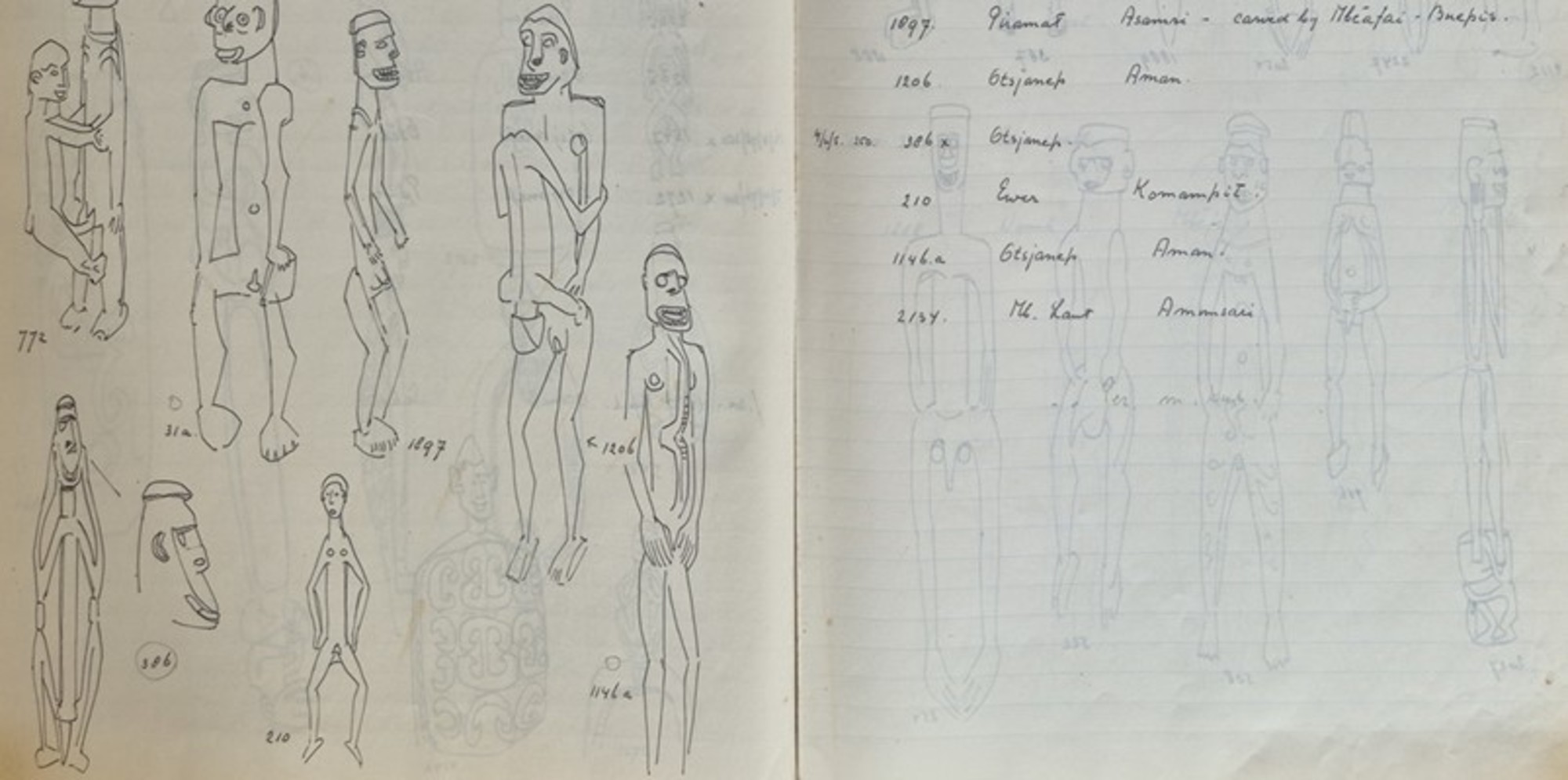 Asmat. Large ancestor carving. Collected by Jac Hoogerbrugge in the 1960’s or 1970’s. Carved by Aman from Otsjanep. See drawing and collection note by Hoogerbrugge. Restauration tot the right foot.