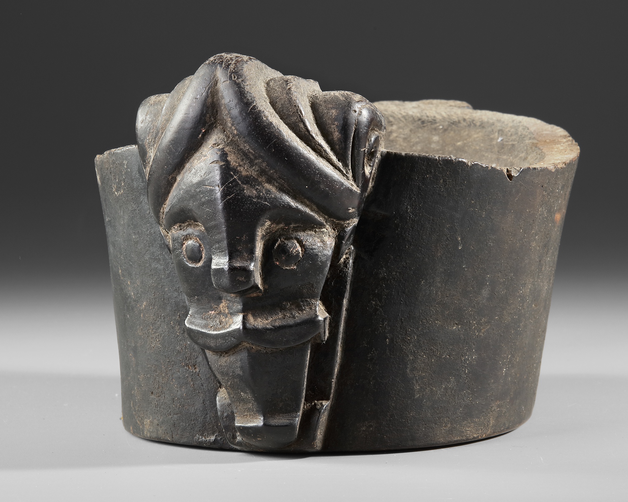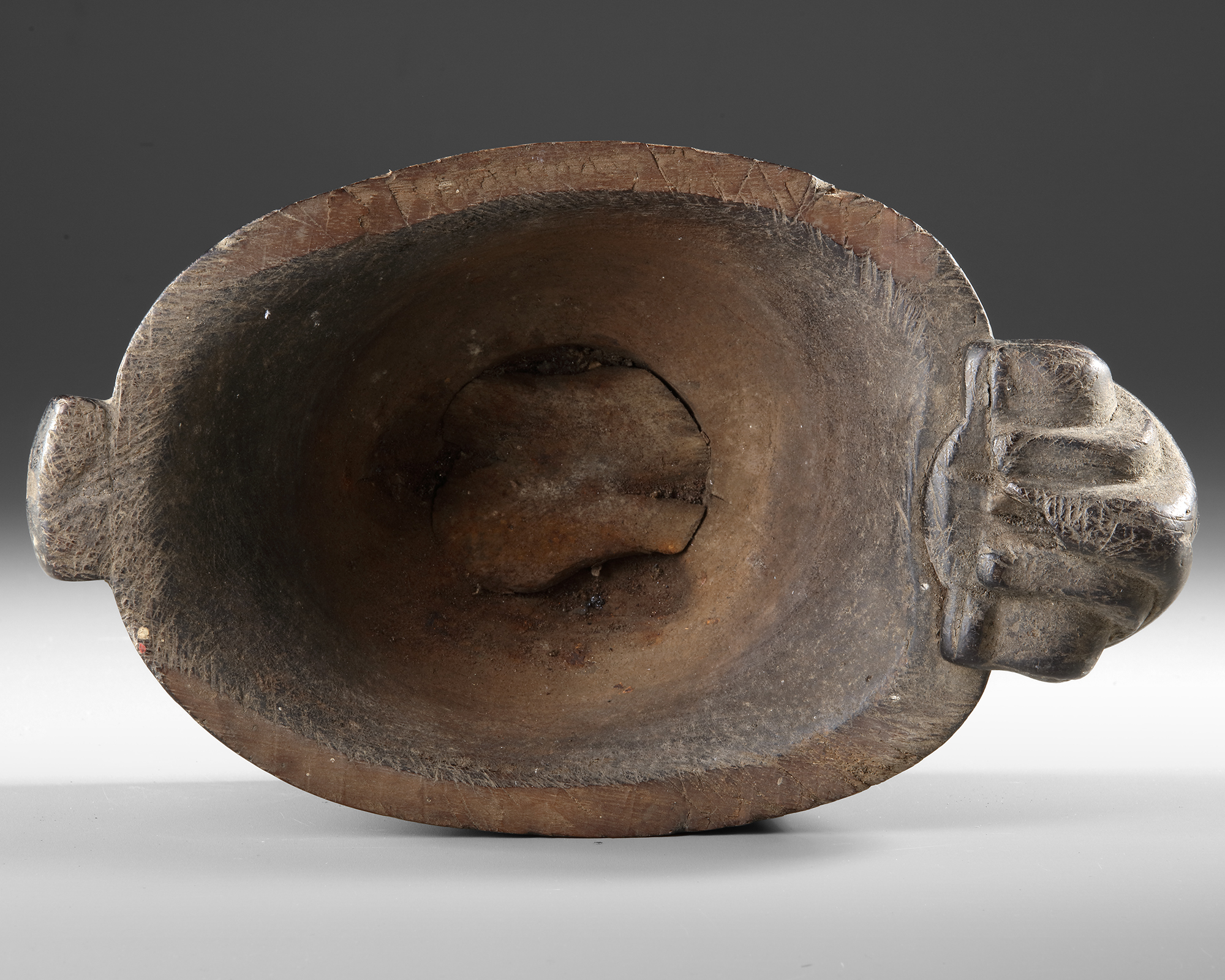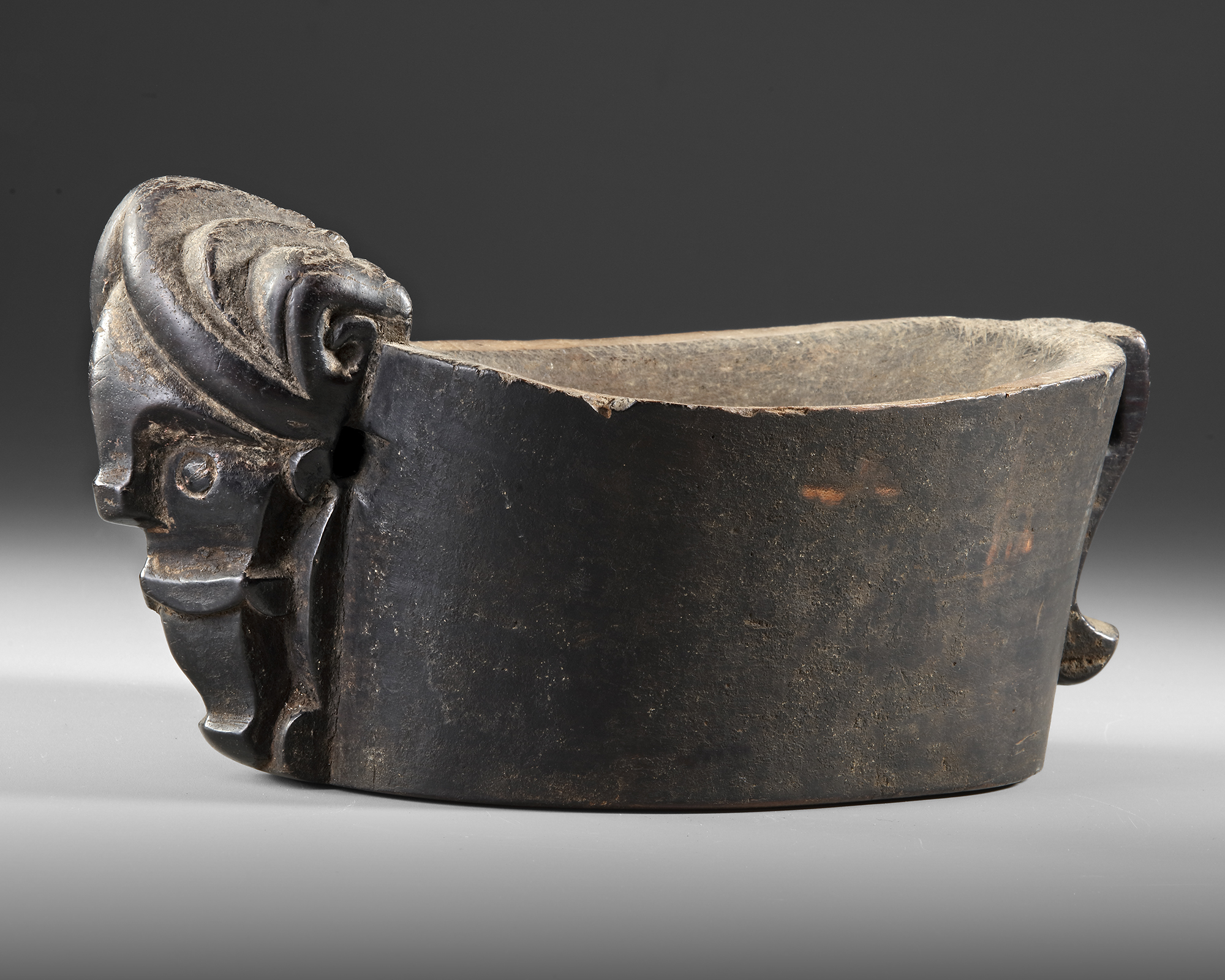 Used tob urn shells to make lime for betel nut chewing. Herewith a Batak Mortar. Also collected by Jac Hoogerbrugge in the 1950’s. Nice patina of use. Adorned with two Singha heads.