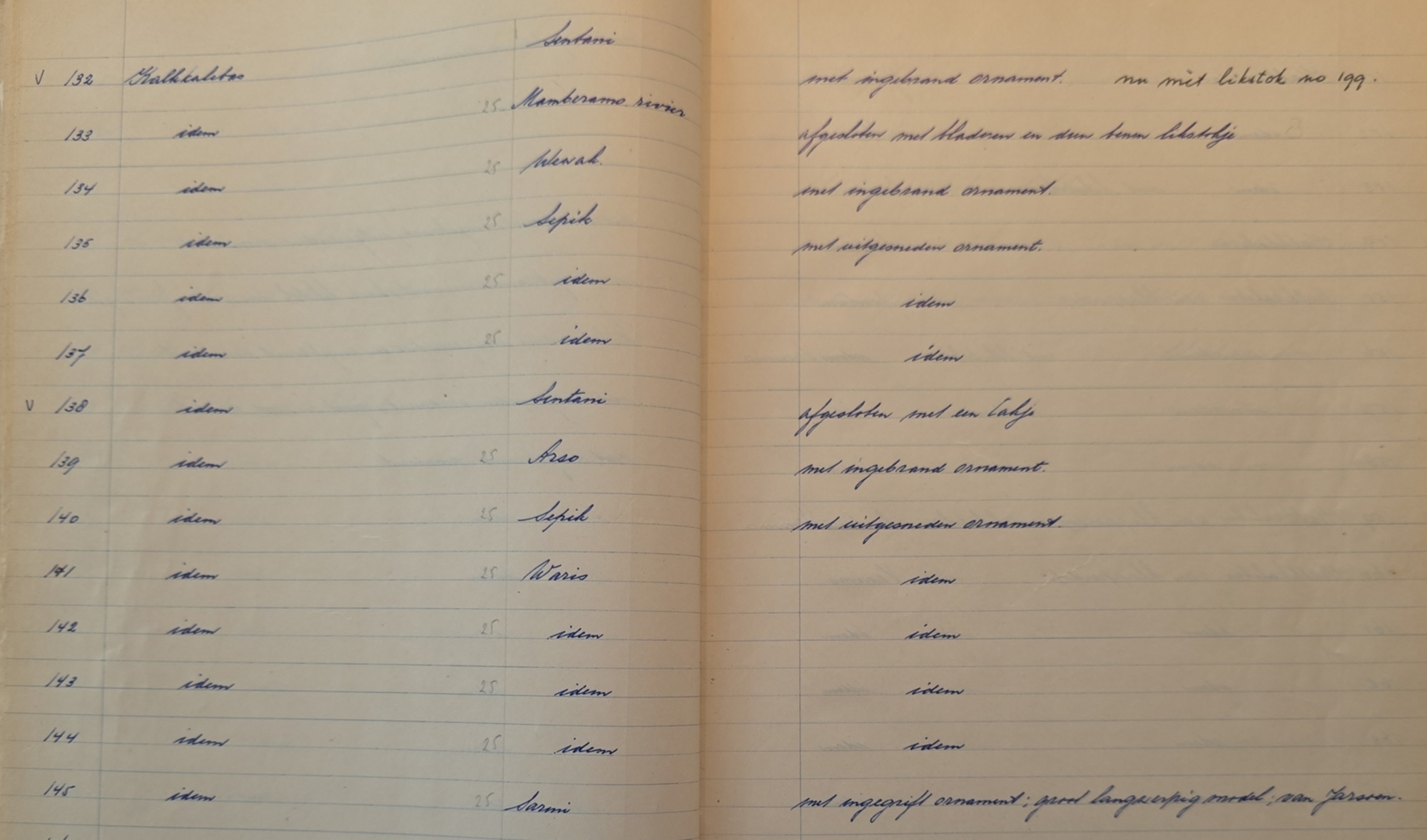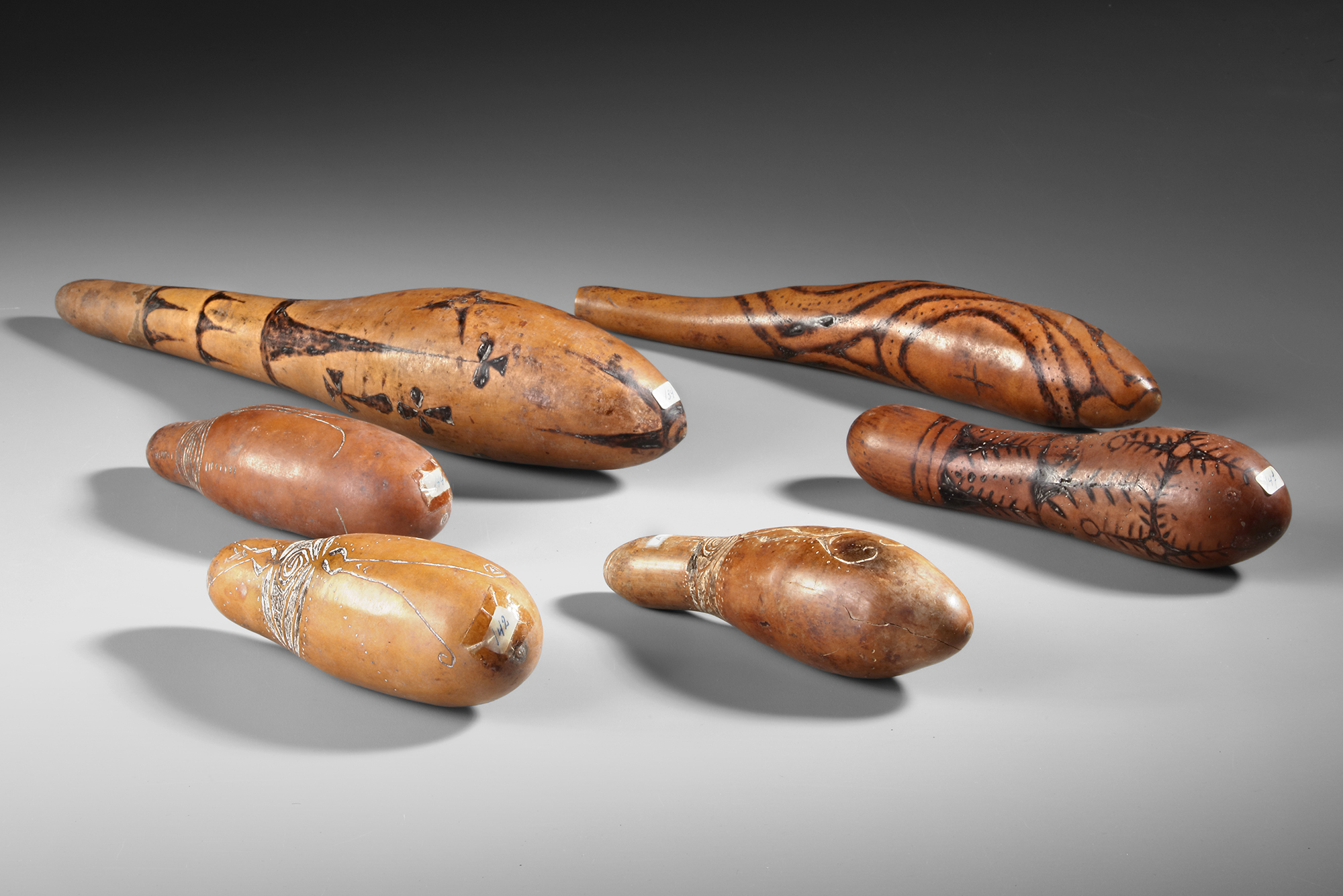 Lot 100Six gourd lime containers from Sentani, Wewak and Waris. All collected before 1969 by Jac Hoogerbrugge. See the drawings and collection notes by Hoogerbrugge.
