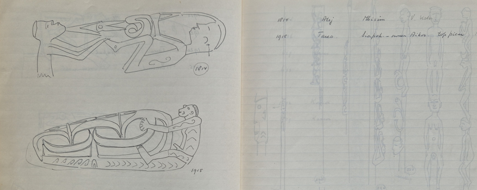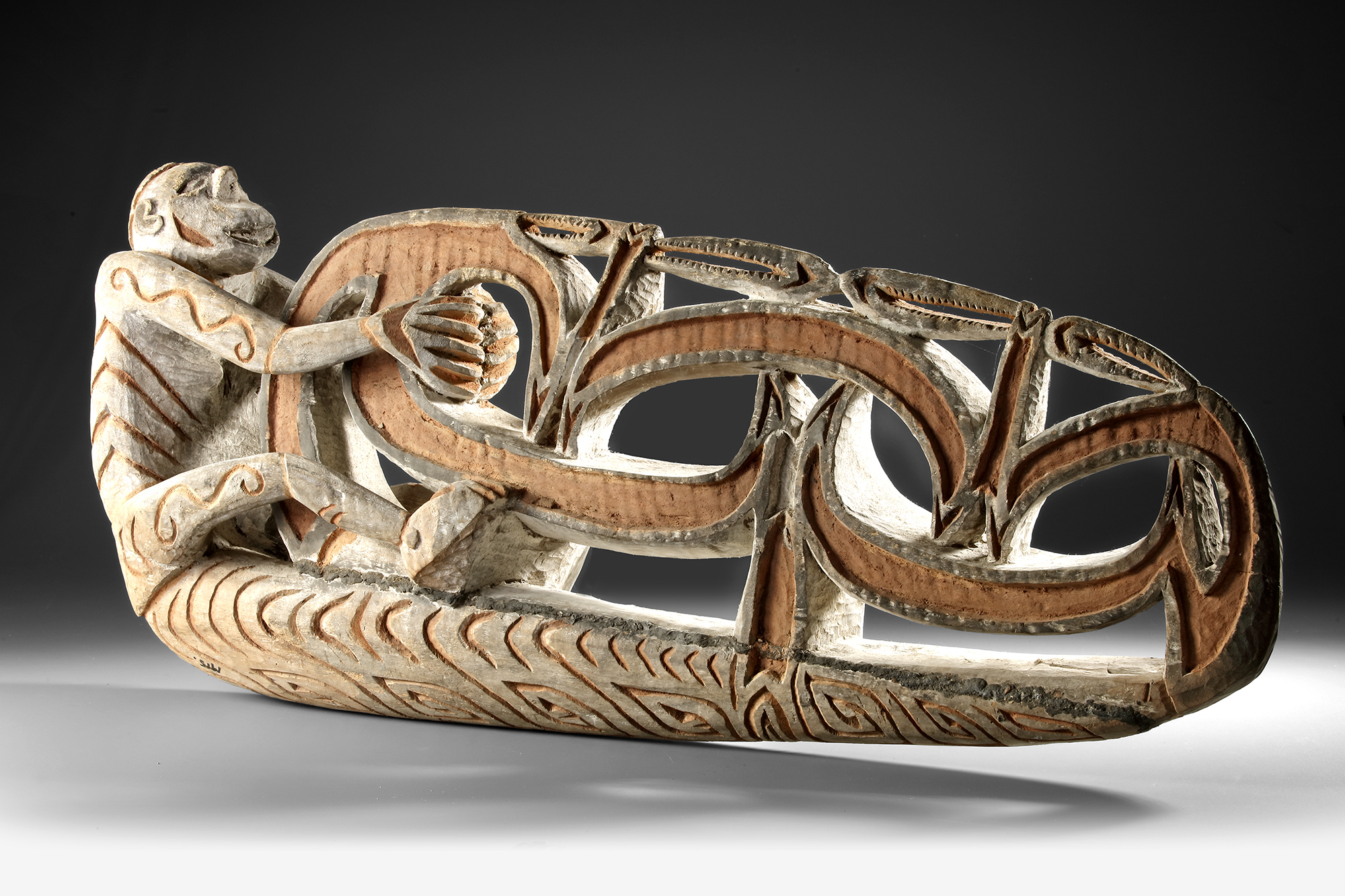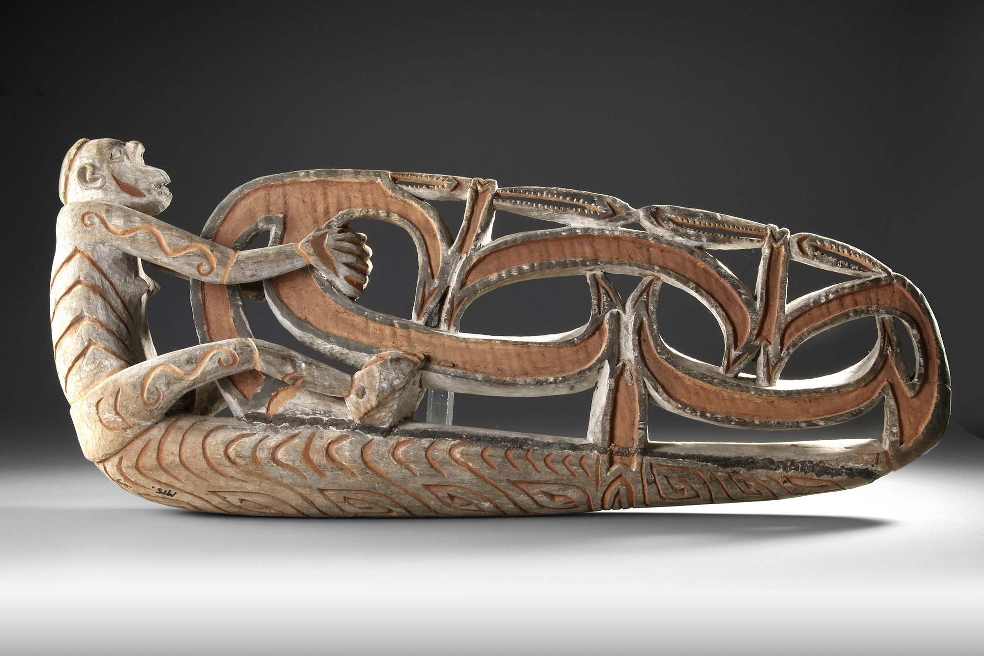 Large prow ornament. Collected by Jac Hoogerbrugge in the 1960’s or 1970’s. From the village of Tareo. Published in “Asmat by Jac Hoogerbrugge”on page 251. See also the drawing and the collection note by Hoogerbrugge. Hoogerbrugge marked it as an “top piece 90 by 40 cm.