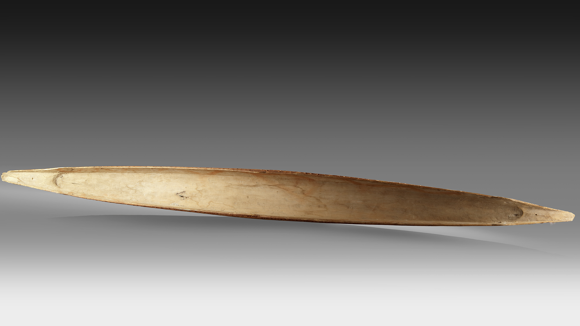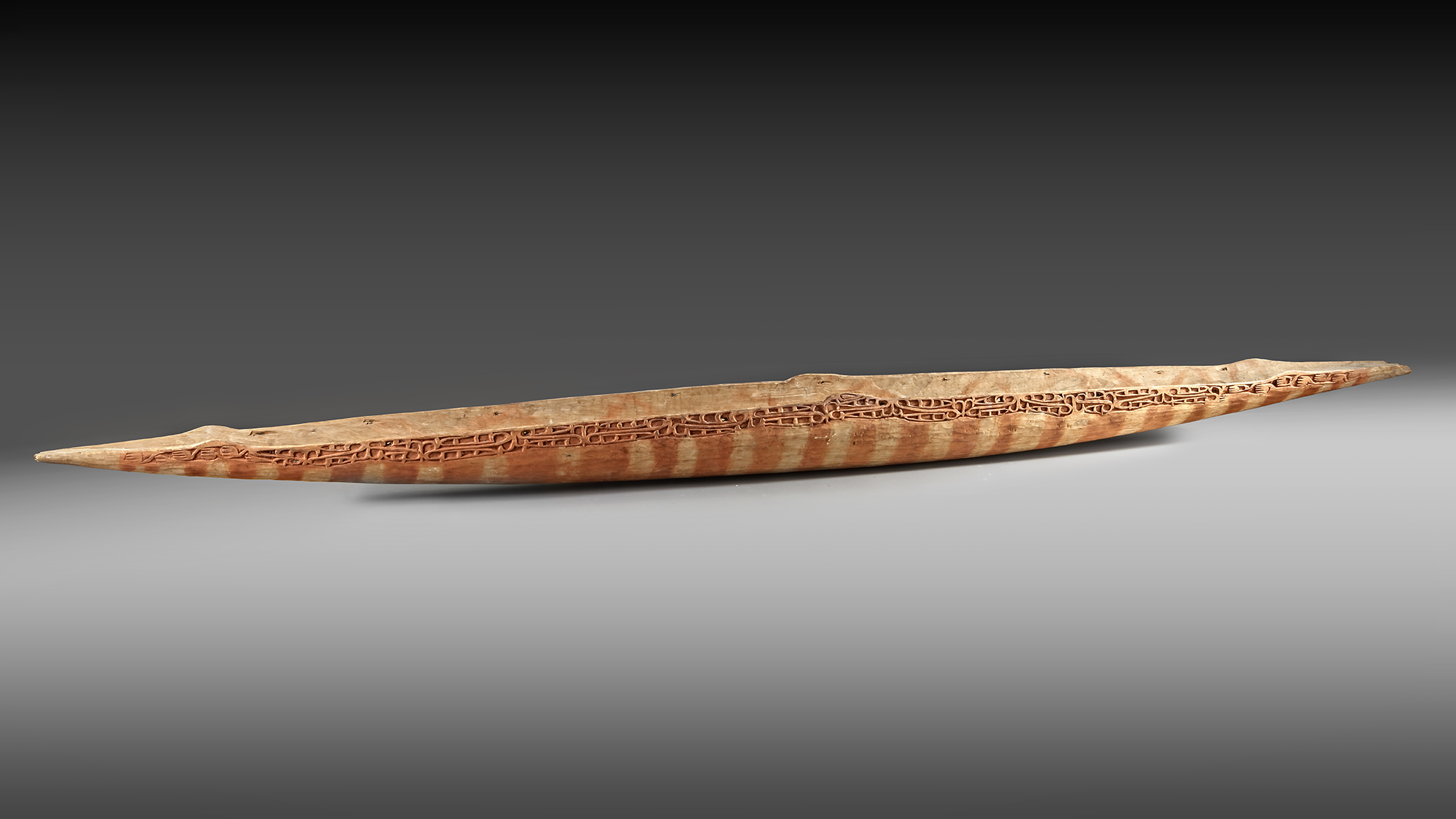 Asmat. Large feast dish in the shape of a canoe. With the typical, beautifully carved side decorations and exactly the same coloured sides as seen in canoes. Said to have come from the collection of the Sitchting Papoeakunst Nederland. 220 by 18 by 16 cm.