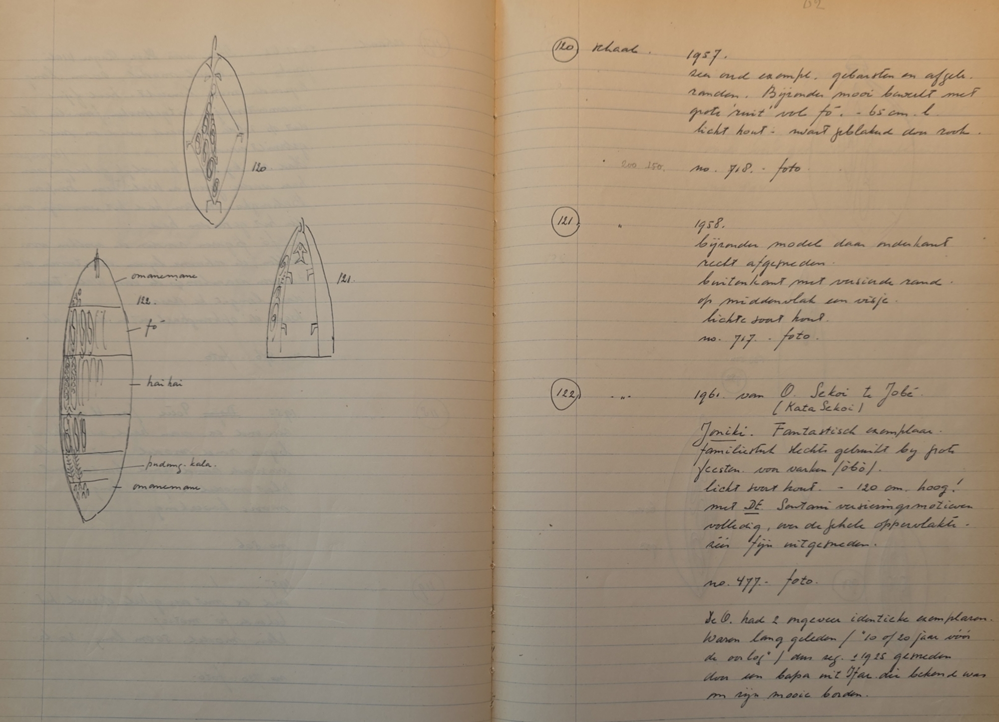 Large Sentani village feastbowl. Collected by Jac Hoogerbrugge in 1961. Bowls/food platters like this were not private property, but belonged tot he clan or the village to be used in feasts. See the drawing and collection notes by Hoogerbrugge. Hoogerbrugge marked it as a “Top piece”. Hoogerbrugge notes: In 1961 from O. Sekoi in Jobé(Kata Sekoi). Joniki. Fantastic example.Family heirloom only used in big feasts for pig (òbò). Light wood.120 cm high! ODecorated with THE Sentani motifs over the entire surface.Very finely carved. The O. had 2 nearly identical pieces.Carved long ago, 10 or 20 years before the war, so approcimately 1925 by a bapa from Ifarwho was well known for his beautifull plates. Stable crack. 120 by 30 by 7 cm.