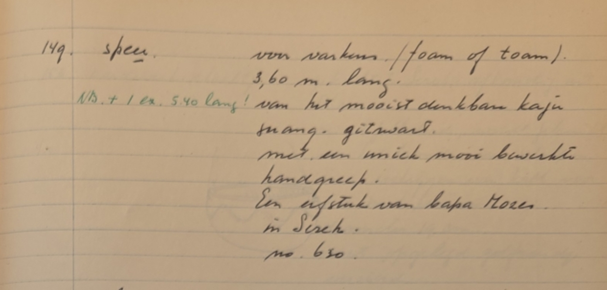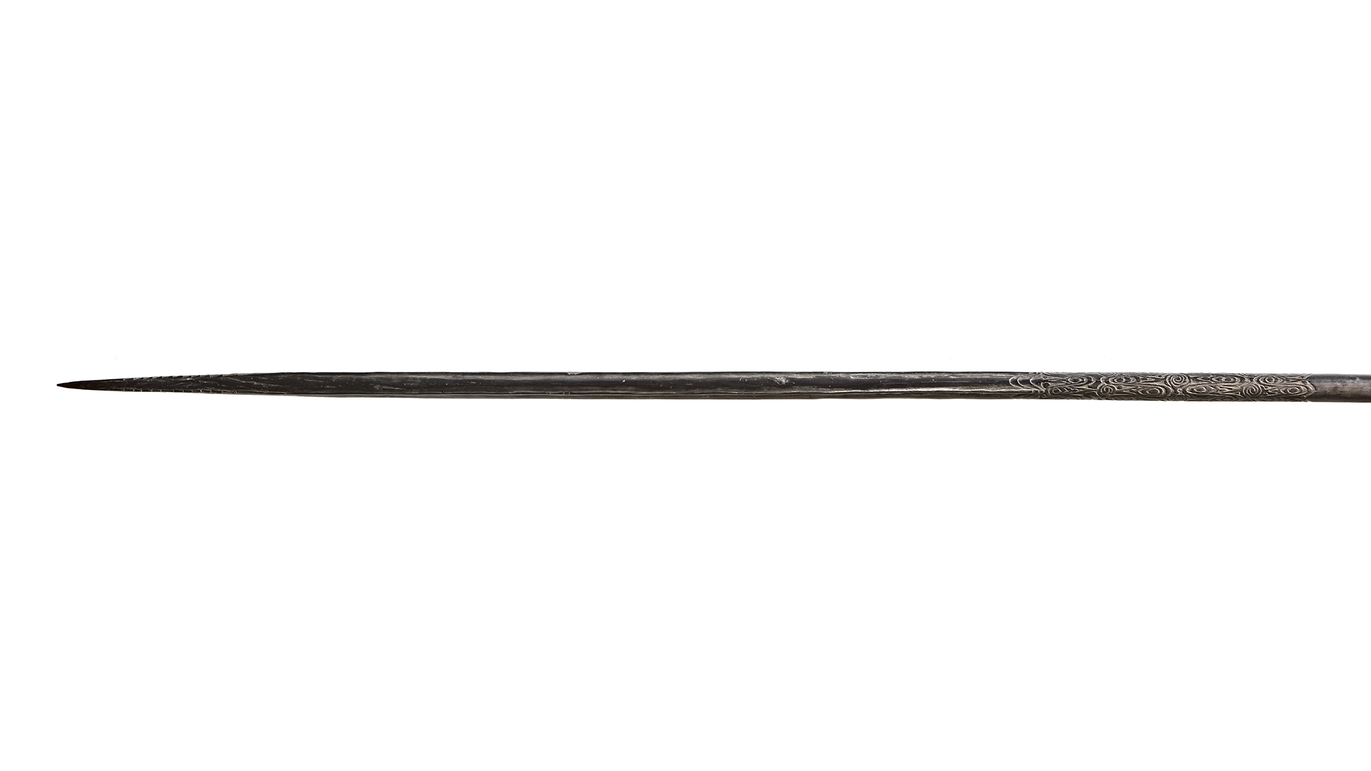 Sentani. Pig hunting spear. Collected by Jac Hoogerbrugge in the 1950’s, but probably older. 3.60 metres. Nicely carved shaft with typical Sentani designs. See the collection note by Hoogerbrugge. He writes: Made from the most beautiful Kaju Suang (wood). Very very black. Nicely carved shaft. An heirloom from Bapa Mozes in Sereh”. ca. 350 cm.