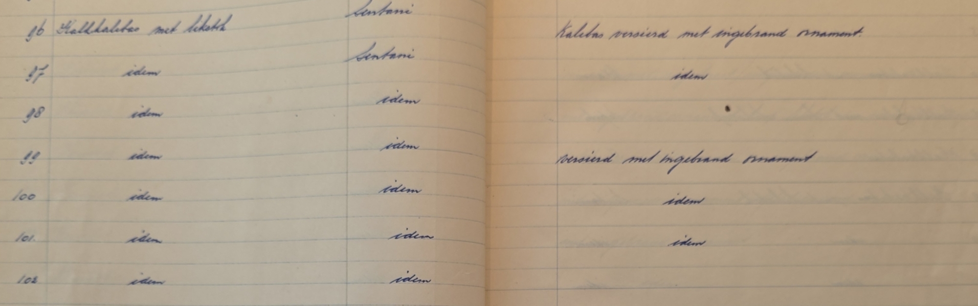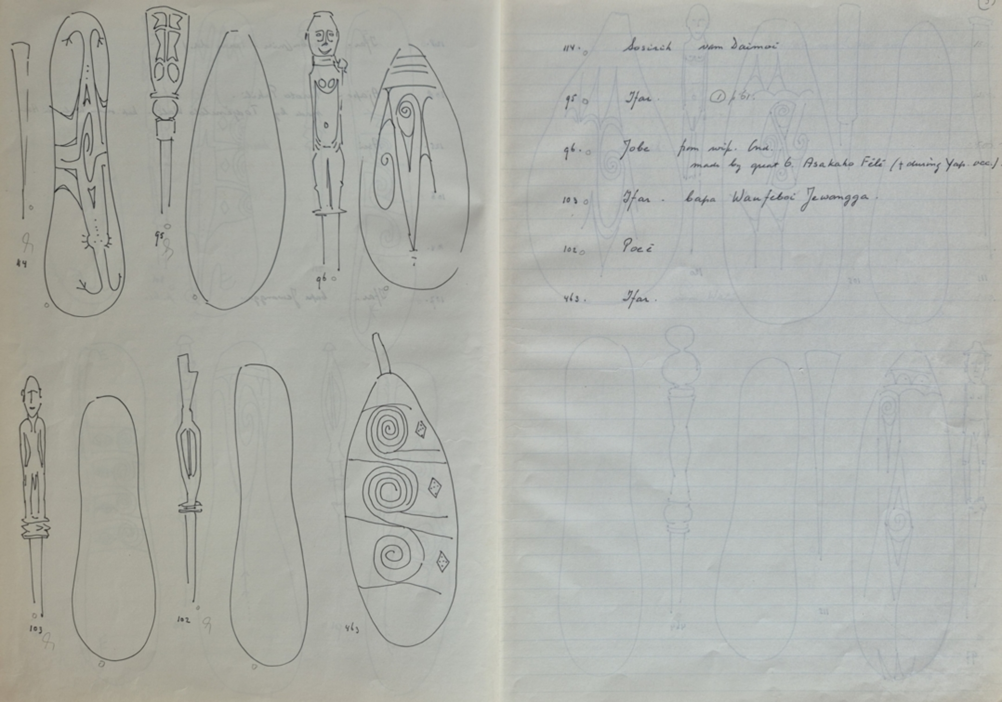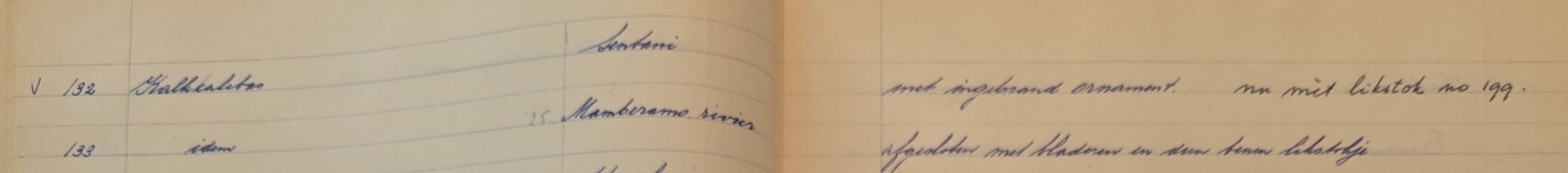 Two old and well used gourd lime containers with lick sticks/spatulas. Collected by Jac Hoogerbrugge in the 1950’s. The lighter one from Sentani (vilage of Poei), probably collected in 1957, the darker one from Mamberamo river. See the Hoogerbrugge drawing and the collection notes. ca.15 cm.
