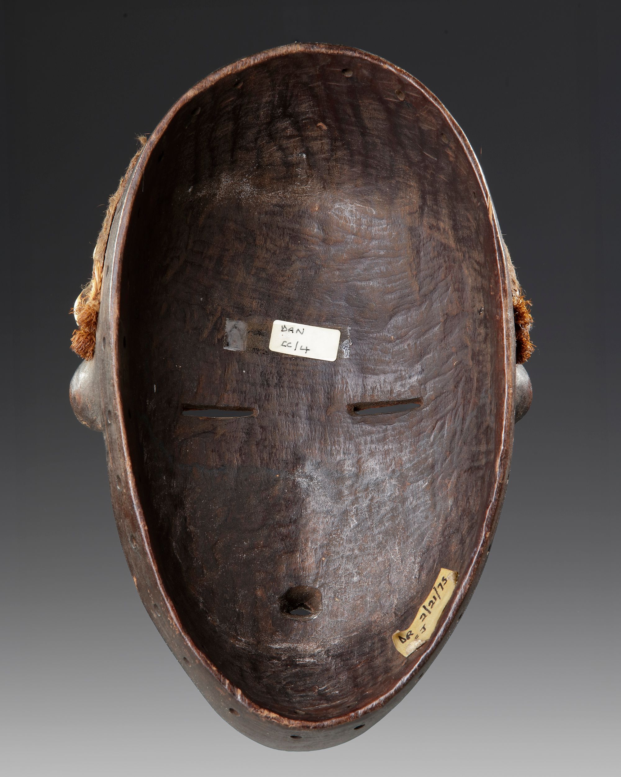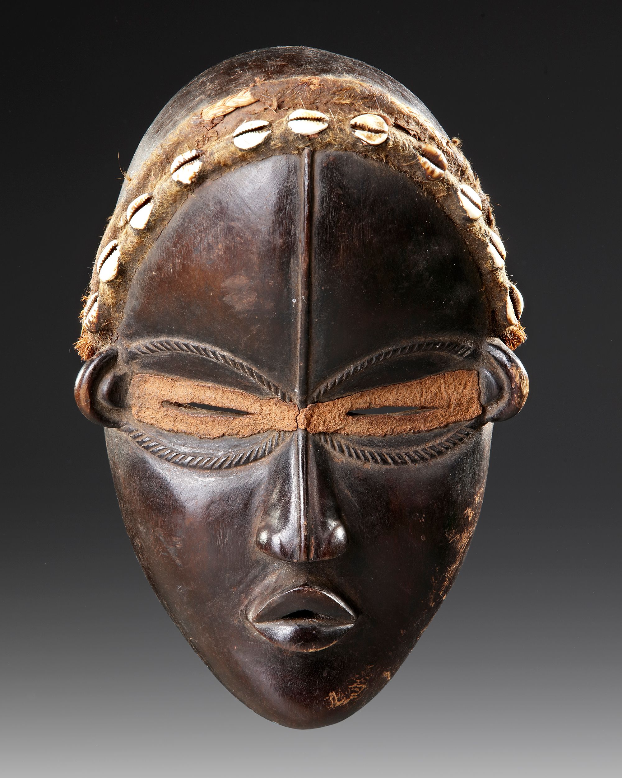 A beautifully carved African mask featuring a smooth, elongated face, narrow slit eyes framed with textured detailing, and a headdress adorned with cowrie shells. the refined form and organic materials reflect traditional early 20th-century African craftsmanship and symbolic decorative practices. 26 by 18 cm.