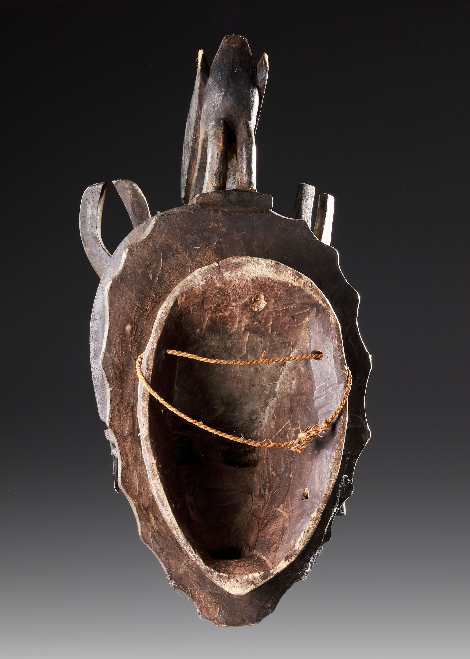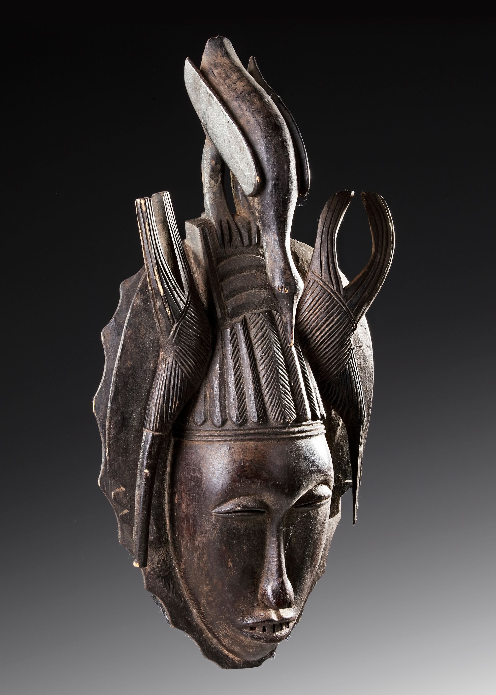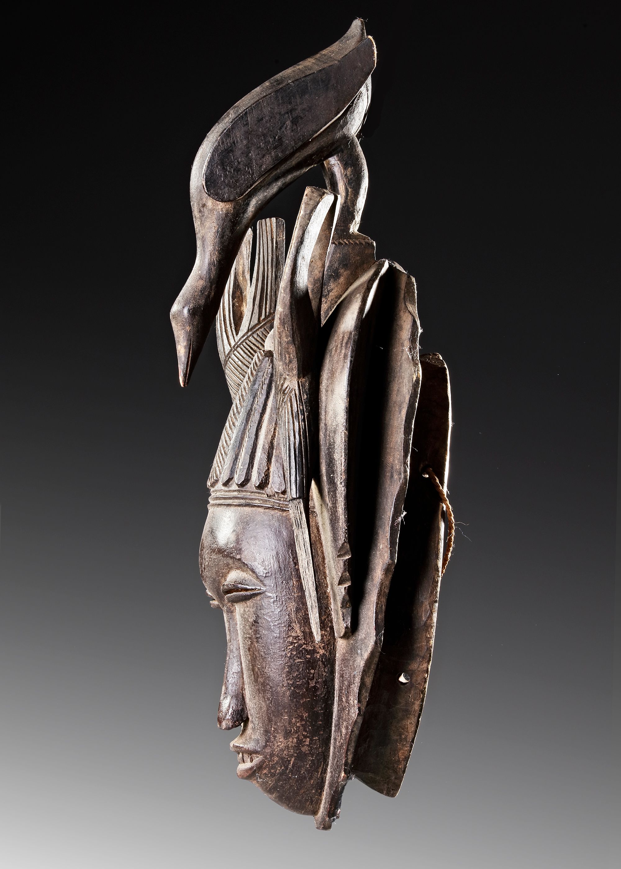 African mask with a carved wooden face and a dramatic bird crest, featuring fine incised details, elegant curves. 44 by 17 cm.